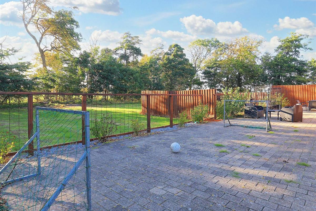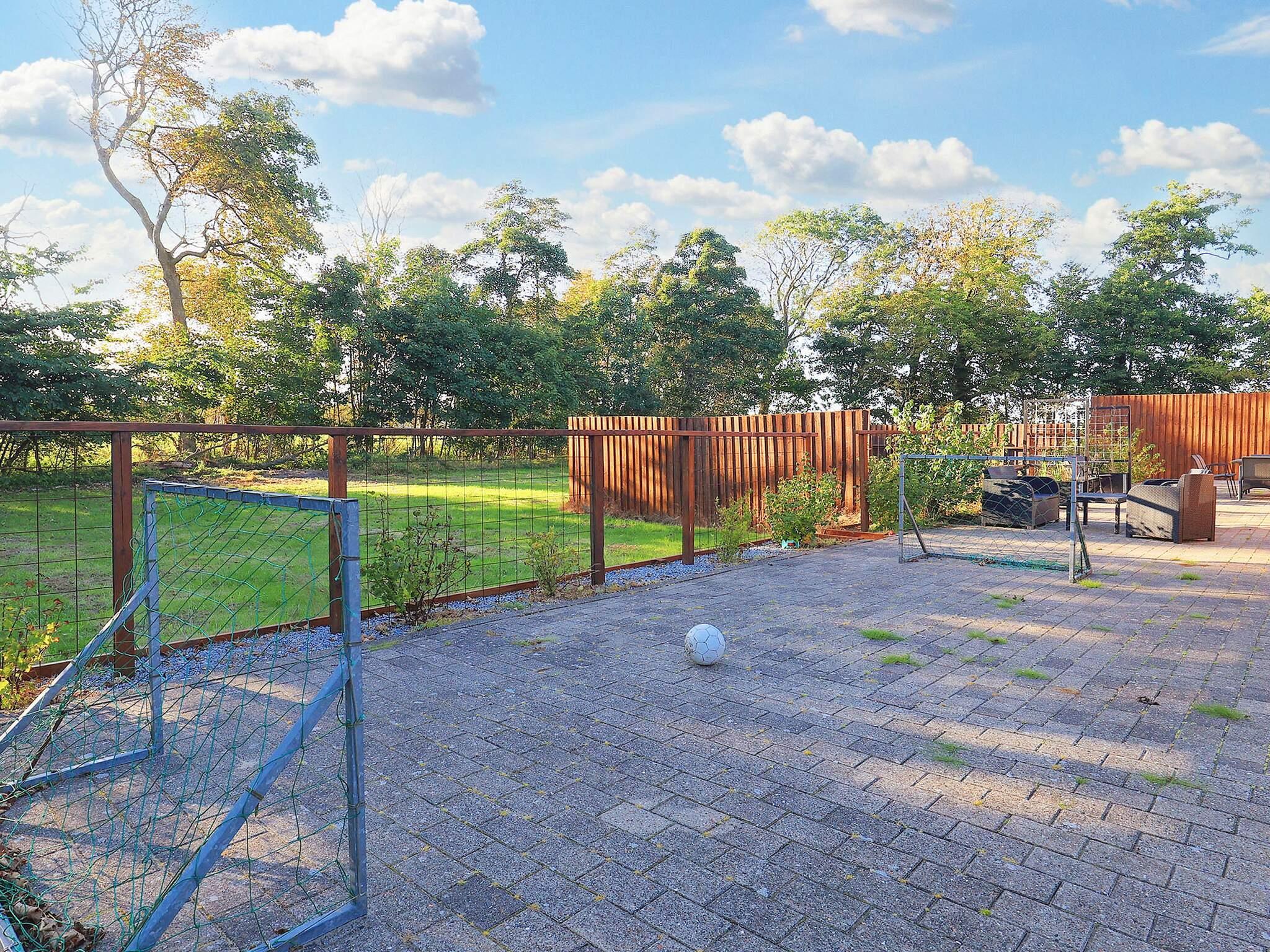 Auf der Rasenfläche neben der Terrasse steht ein Fußballtor. Der große Garten eignet sich ideal für Ballspiele und andere Aktivitäten.