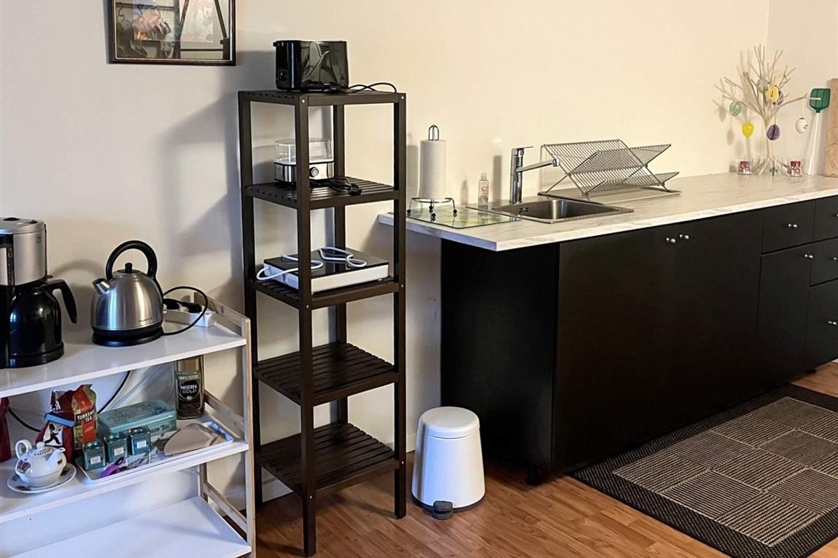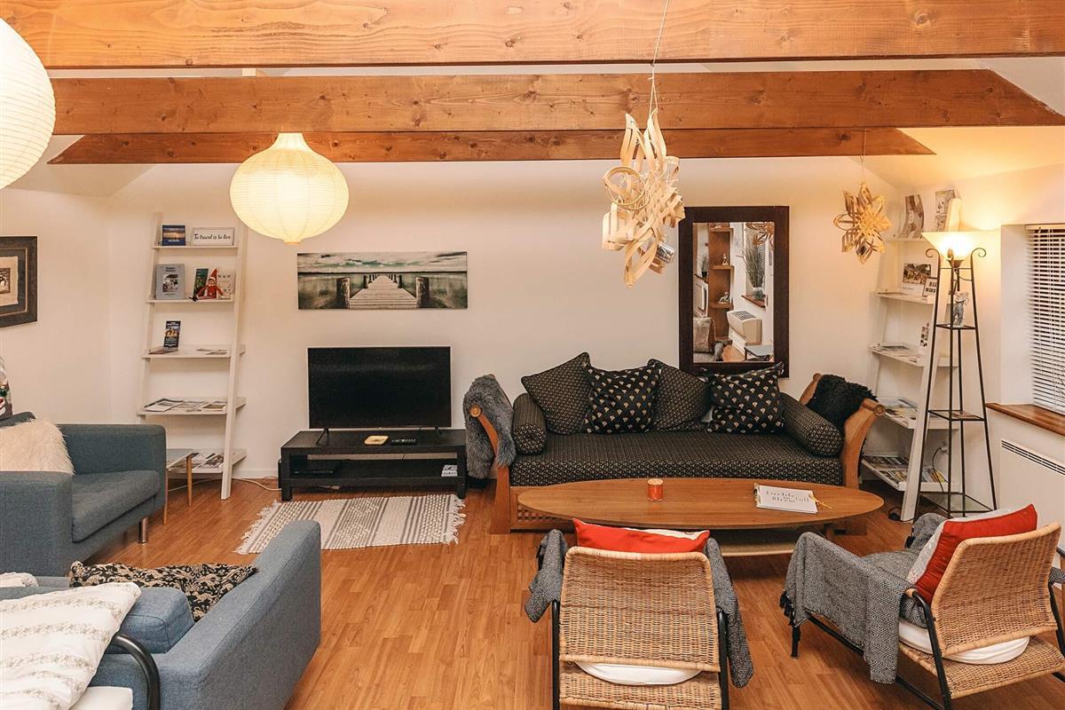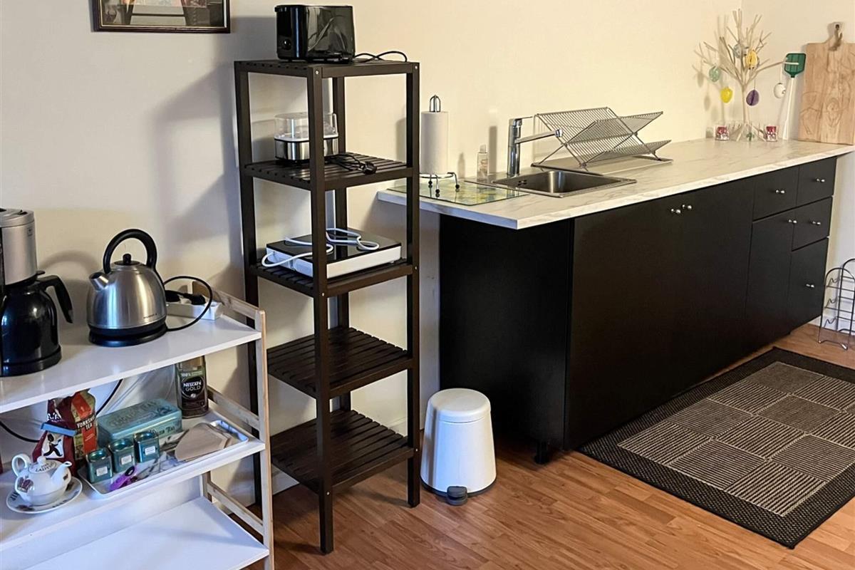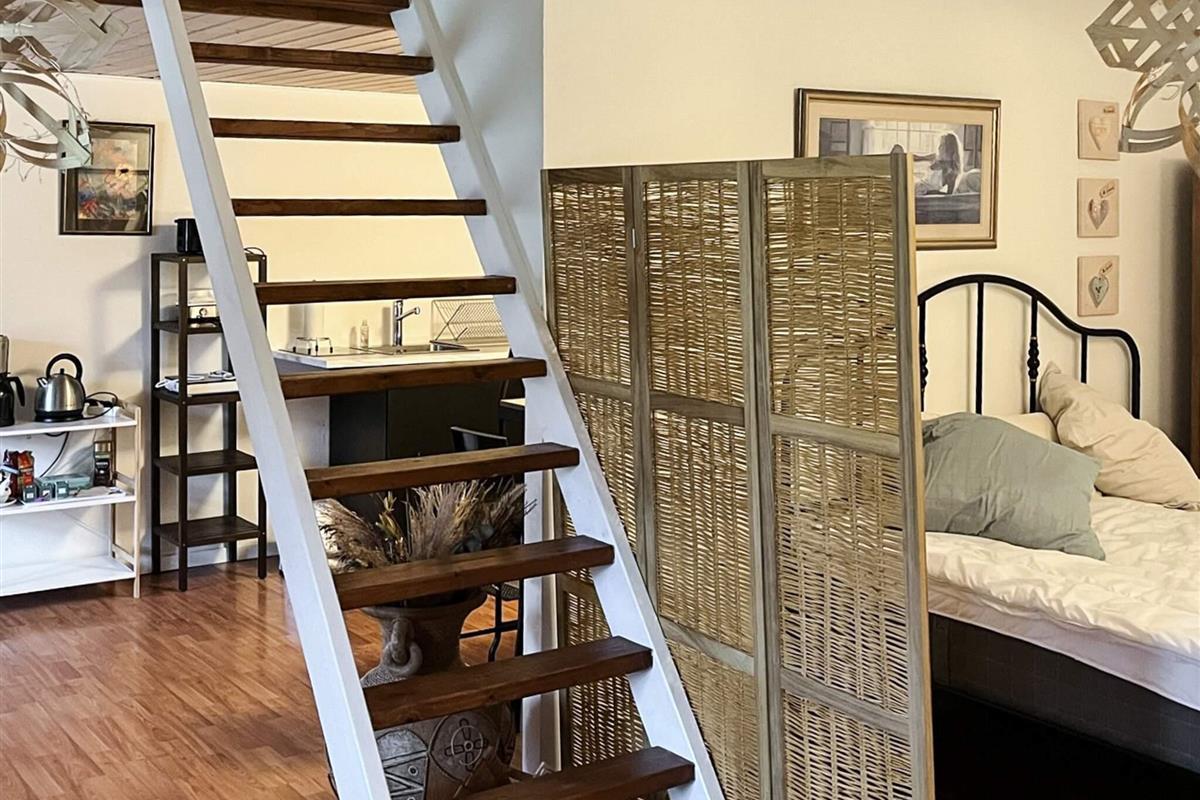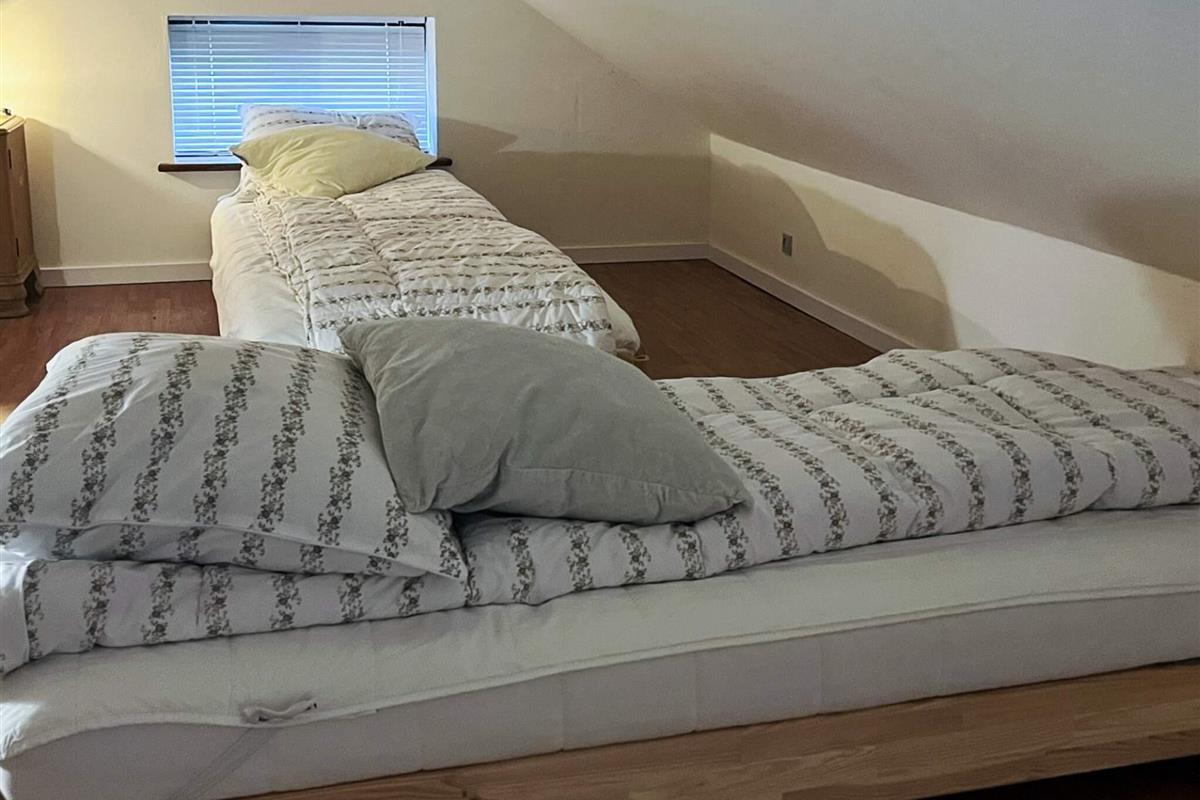 Der Anbau ist hell und geräumig und besteht aus einer Eingangsdiele, einem großen, offenen Raum mit einer größeren Küchenzeile mit u.a. Heißluftfritteuse in einem Bereich und einem Wohnzimmer und einem Doppelbett im anderen. Vom Wohnzimmer führt eine Treppe hinauf zum Dachboden/Hems. Beachten Sie bitte, dass der Dachboden offen ist, was ihn perfekt macht, wenn Sie sich etwas zurückziehen möchten, aber dennoch Teil des offenen Raums darunter sein möchten.