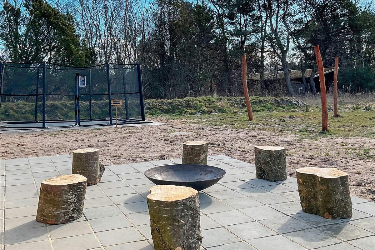 Schöne Terrassenfläche rund um das Haus mit Windschutz, Schatten oder auch der Möglichkeit, im Badezuber mit bis zu 6 Personen zu entspannen. Auf dem Rasen davor gibt es viel Platz für Ballspiele o.Ä. Zudem Gartentrampolin (Nutzung nur auf eigenes Risiko) sowie vier Hängekojen im Außenbereich.