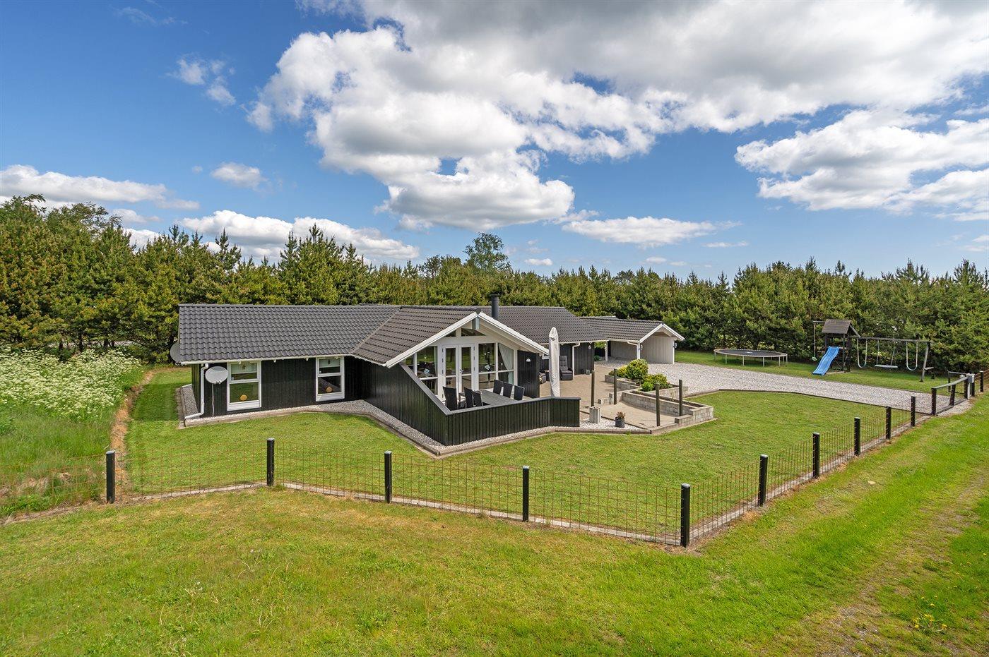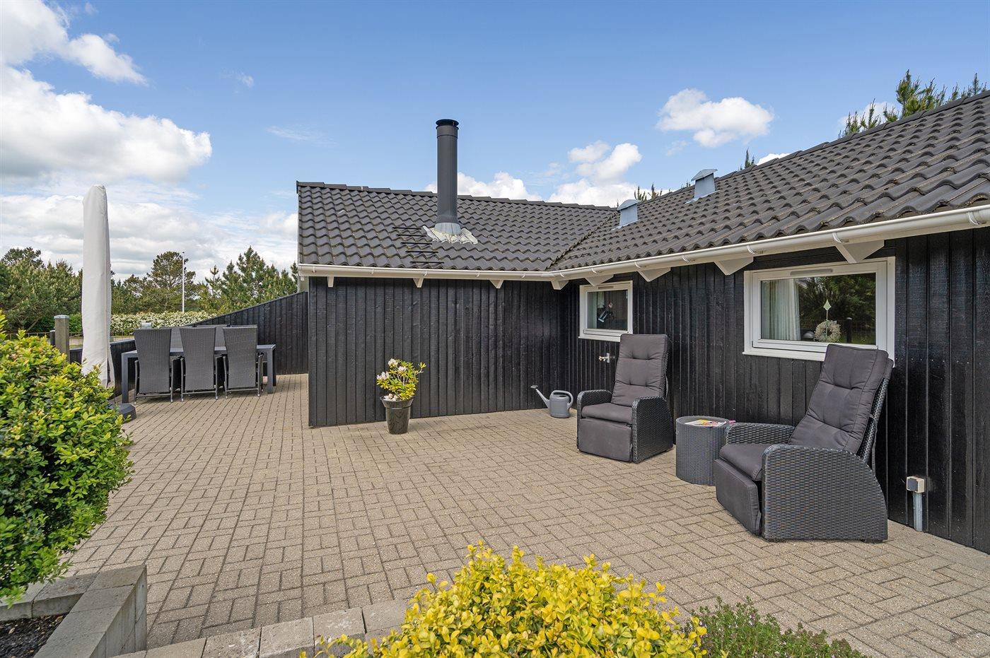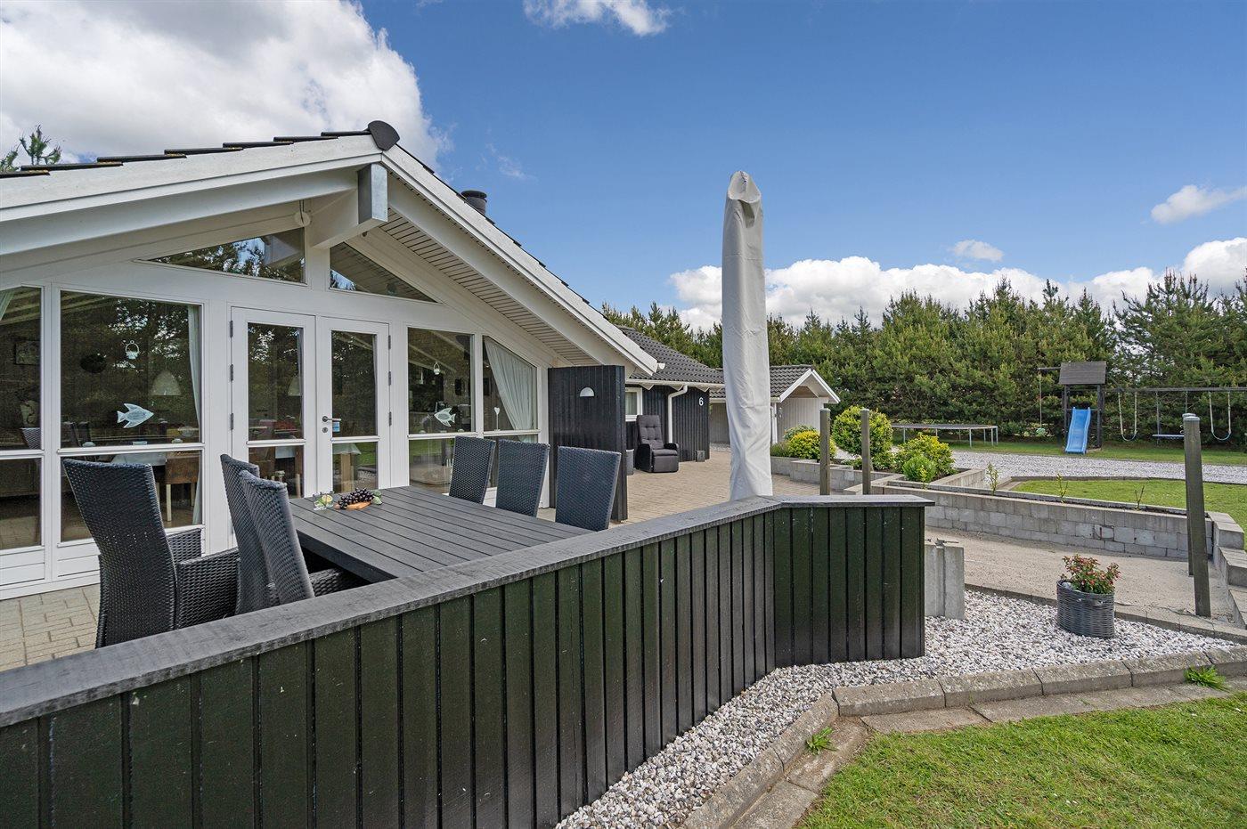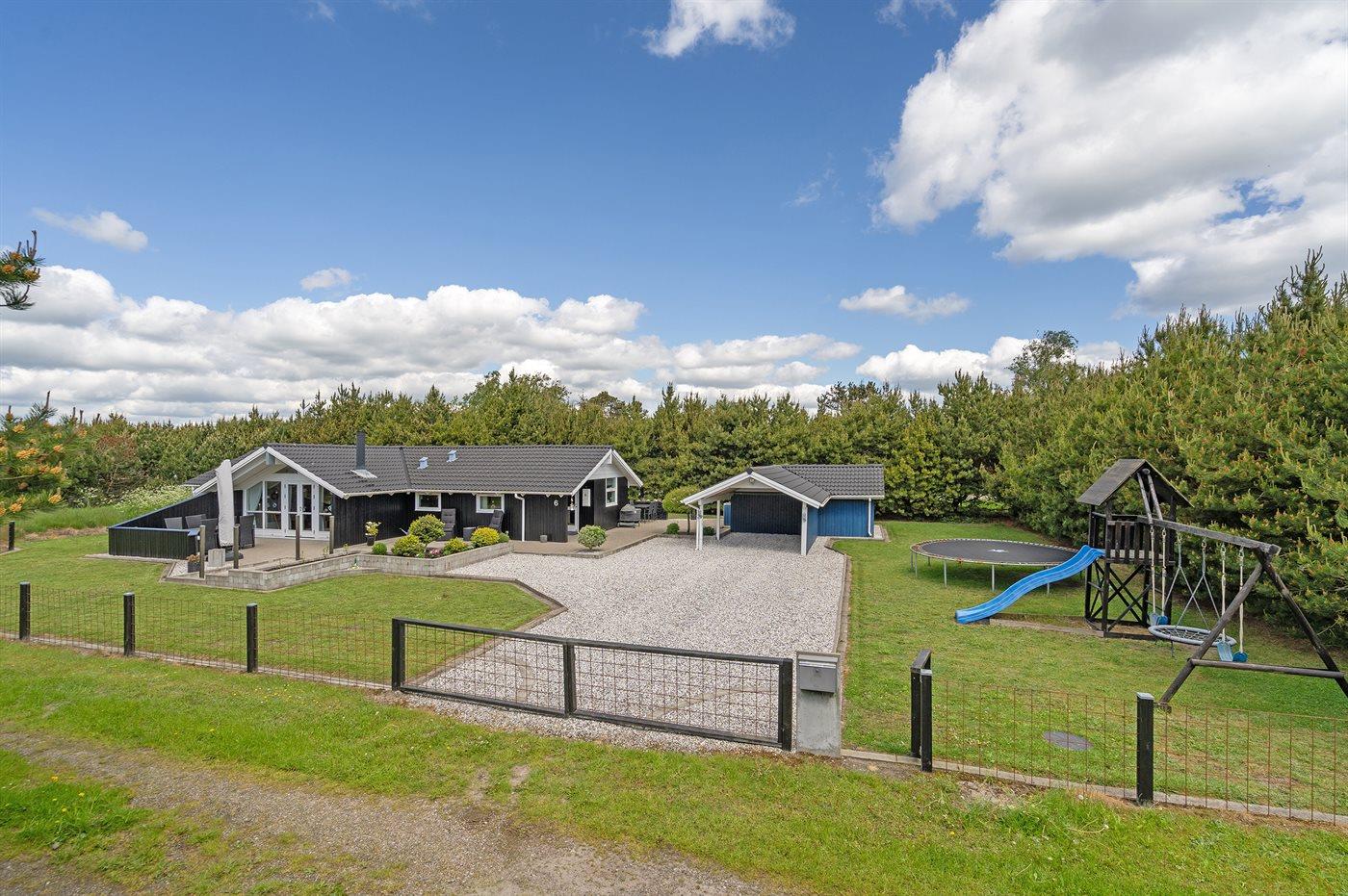 De vakantiewoning is gelegen op een 1200 m² groot aangelegde tuin. De grond is omheind. Afstand tot de zee 400 m. Dichtstbijzijnde winkel 8000 m. Bij de vakantiewoning hoort 70 m² terras. Daarnaast is er een 10 m² groot overdekt terras. Gereedschapsruimte. Schommel. Barbecue. Parkeerplaats bij het huis.