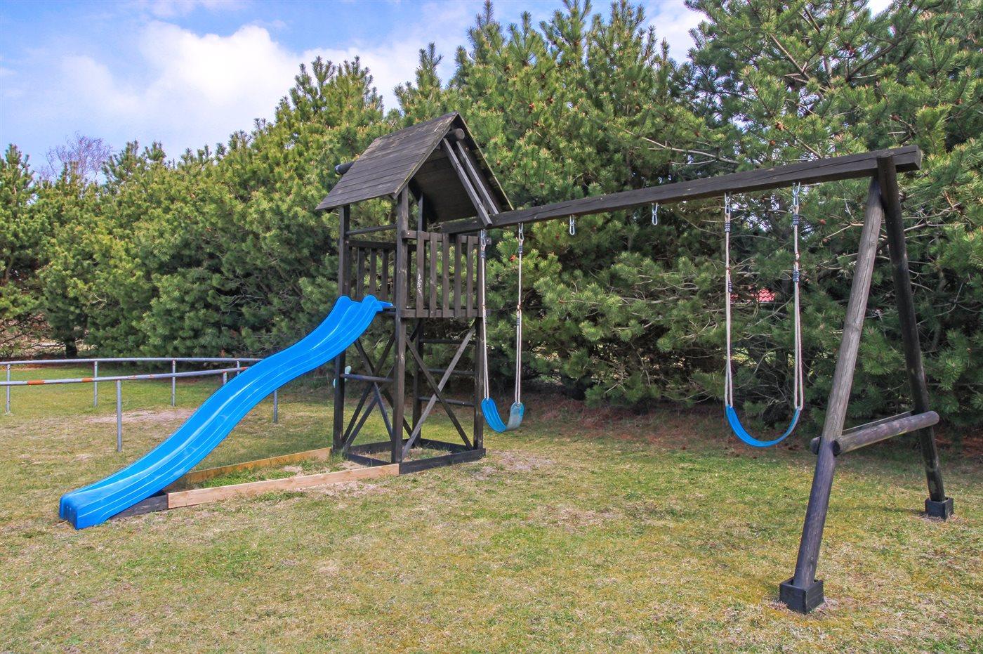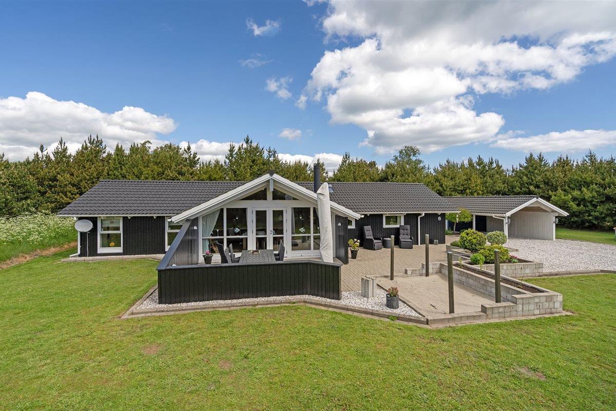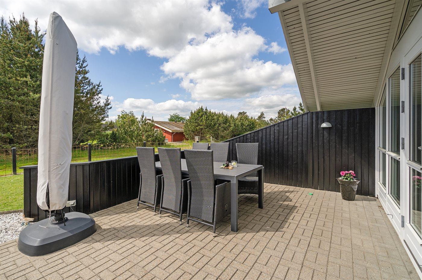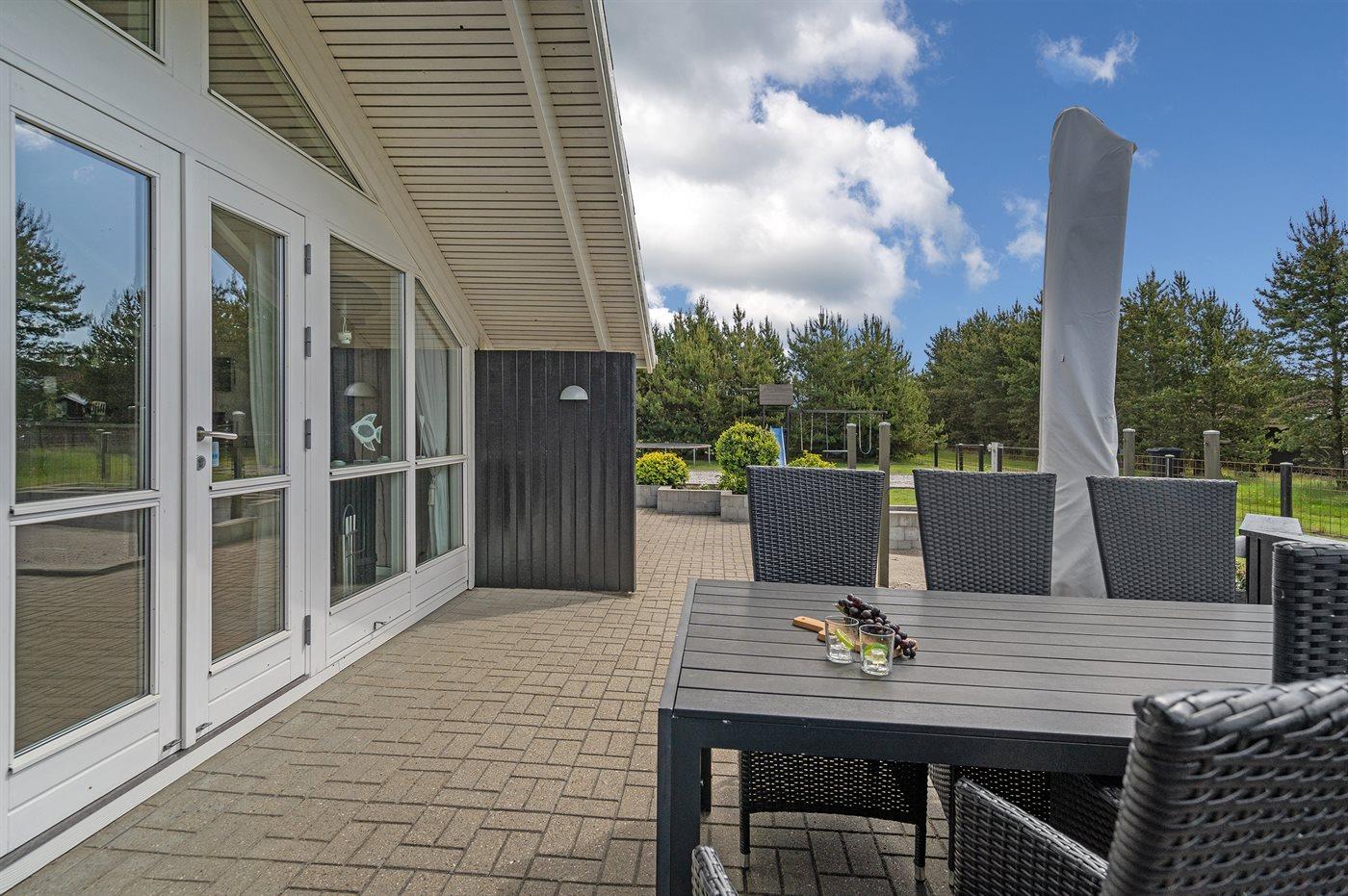 De vakantiewoning is gelegen op een 1200 m² groot aangelegde tuin. De grond is omheind. Afstand tot de zee 400 m. Dichtstbijzijnde winkel 8000 m. Bij de vakantiewoning hoort 70 m² terras. Daarnaast is er een 10 m² groot overdekt terras. Gereedschapsruimte. Schommel. Barbecue. Parkeerplaats bij het huis.