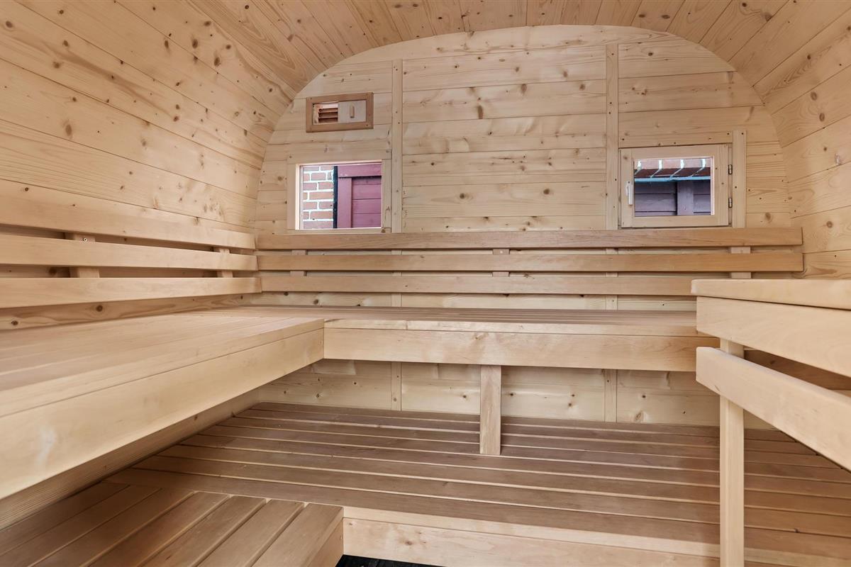 Maak het jezelf gemakkelijk in het tuinmeubilair terwijl de kinderen schommelen of spelen in de zandbak, of speel samen een voetbalwedstrijd. Daarna kun je ontspannen in de barrelsauna, die je een heerlijke warmte en hoge temperaturen biedt om te zweten dankzij de houtkachel, of gebruik het Finse houten bad om te ontspannen.