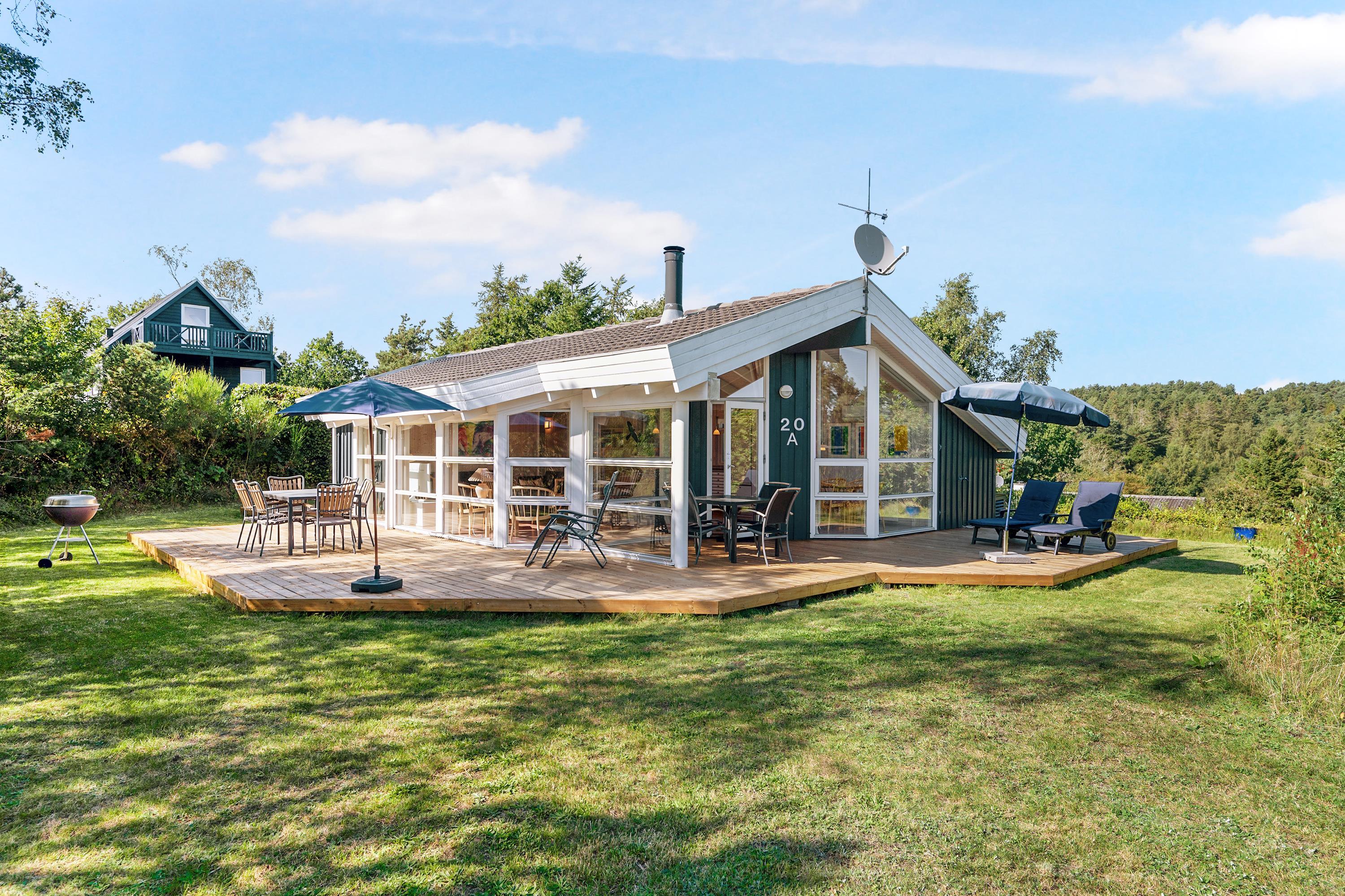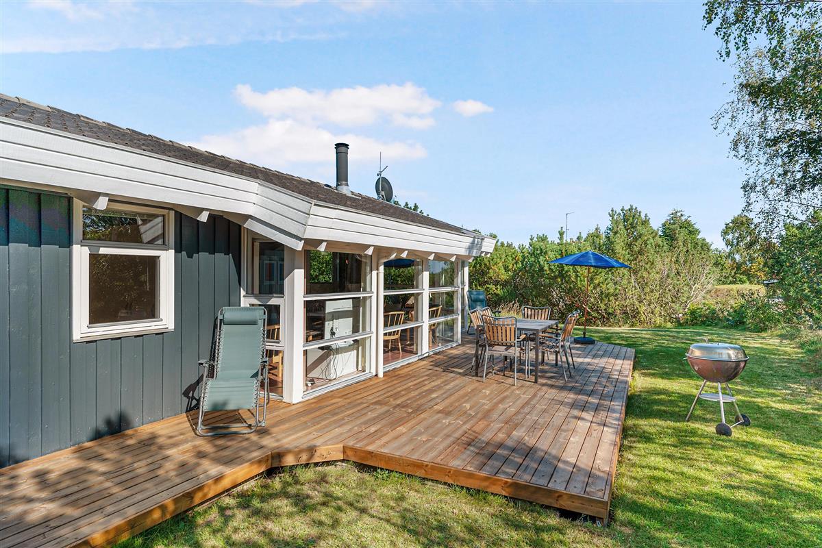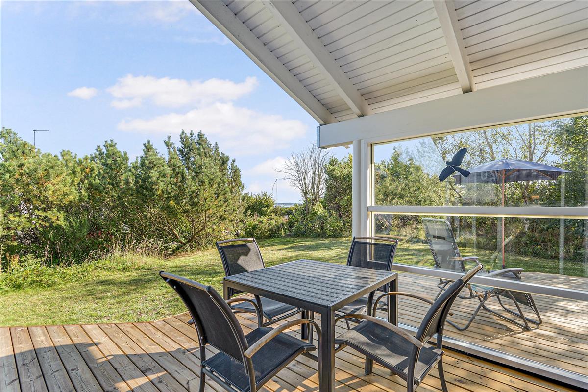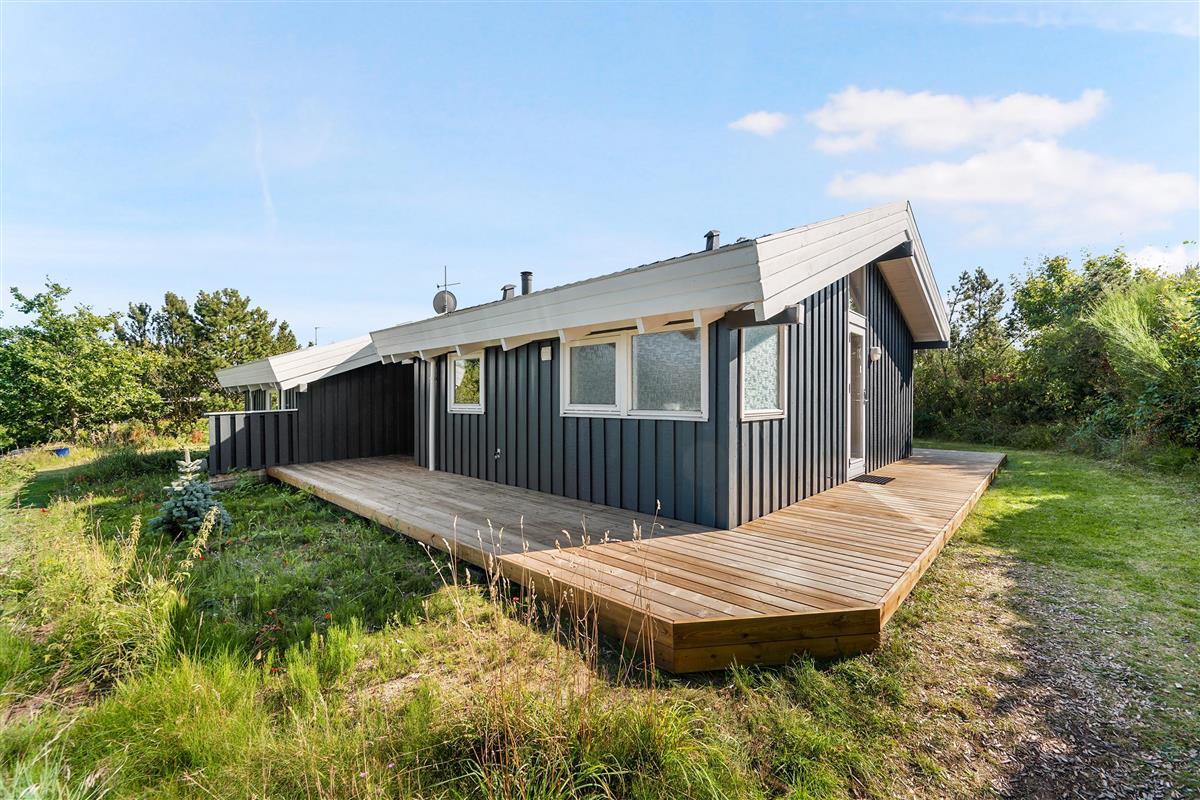 This lovely, bright, and well-appointed holiday home is situated high on a charming natural plot in the hills near Handrup Strand, with a view of Ebeltoft Bay. The house is surrounded by a large, partially covered wooden terrace with garden furniture, sun loungers, a parasol, and a barbecue. There is a carport, and the plot also features swings, a sandpit, and a football goal for the little ones. The homeowners' association has its own beach plot with a pétanque court and a bathing bridge.