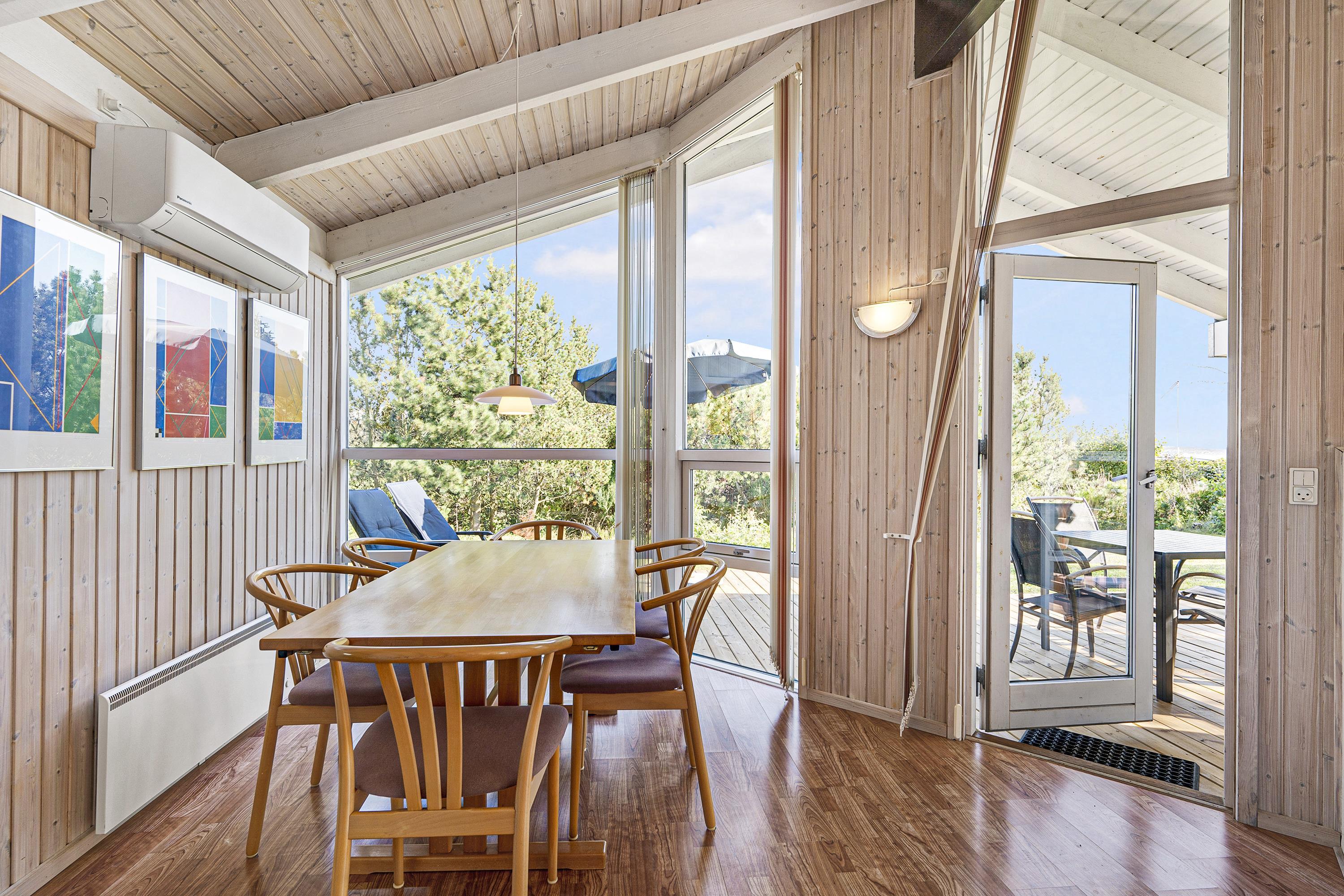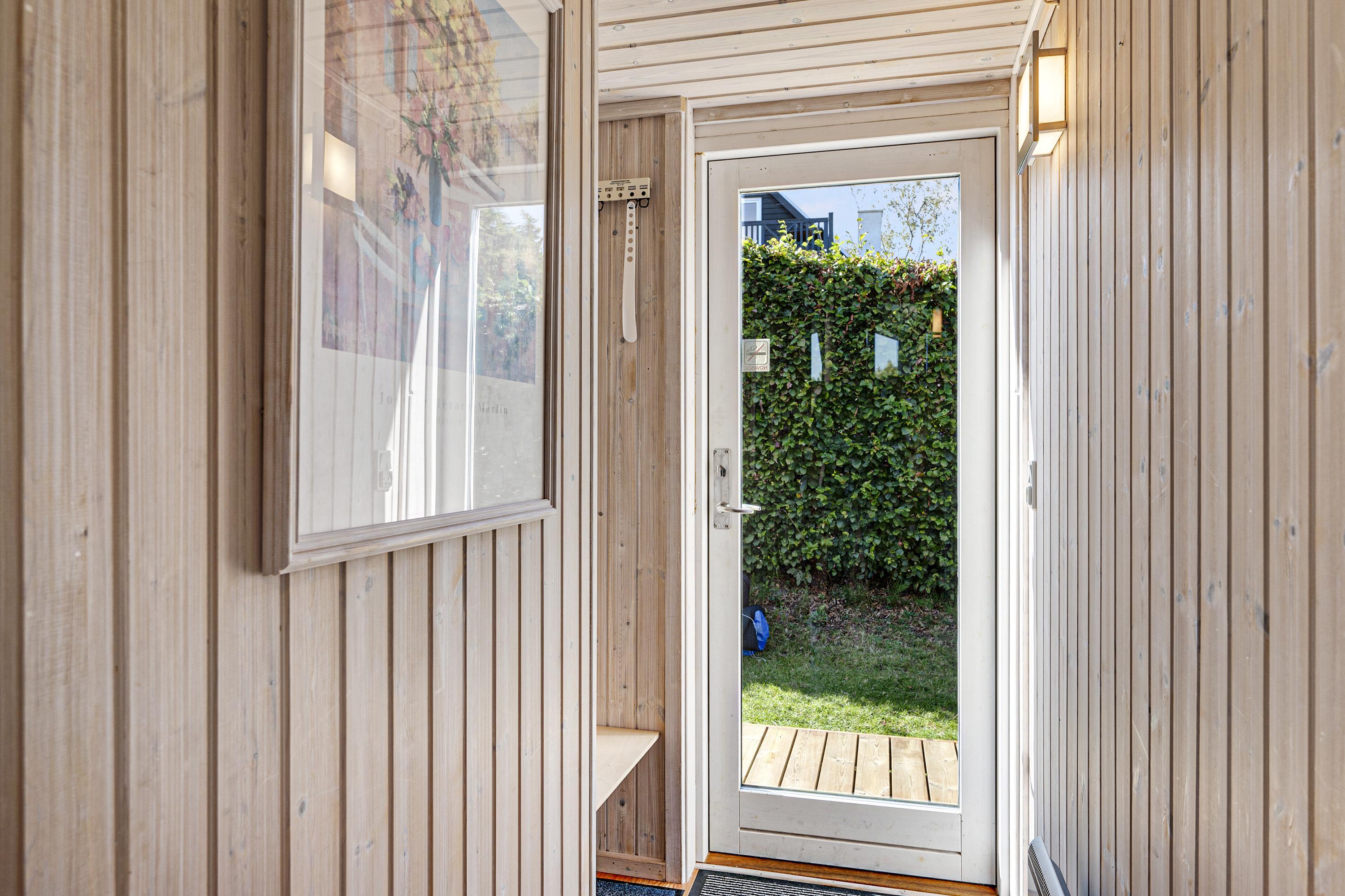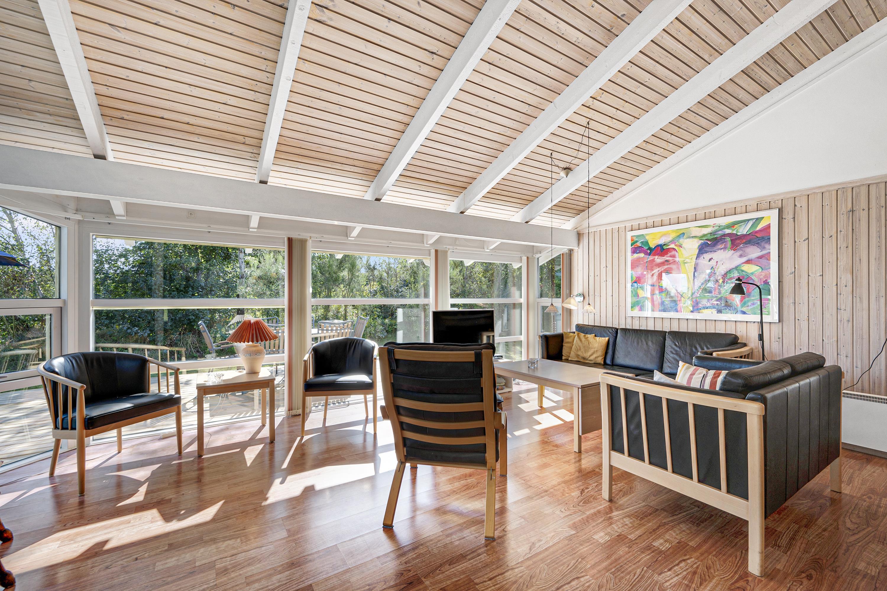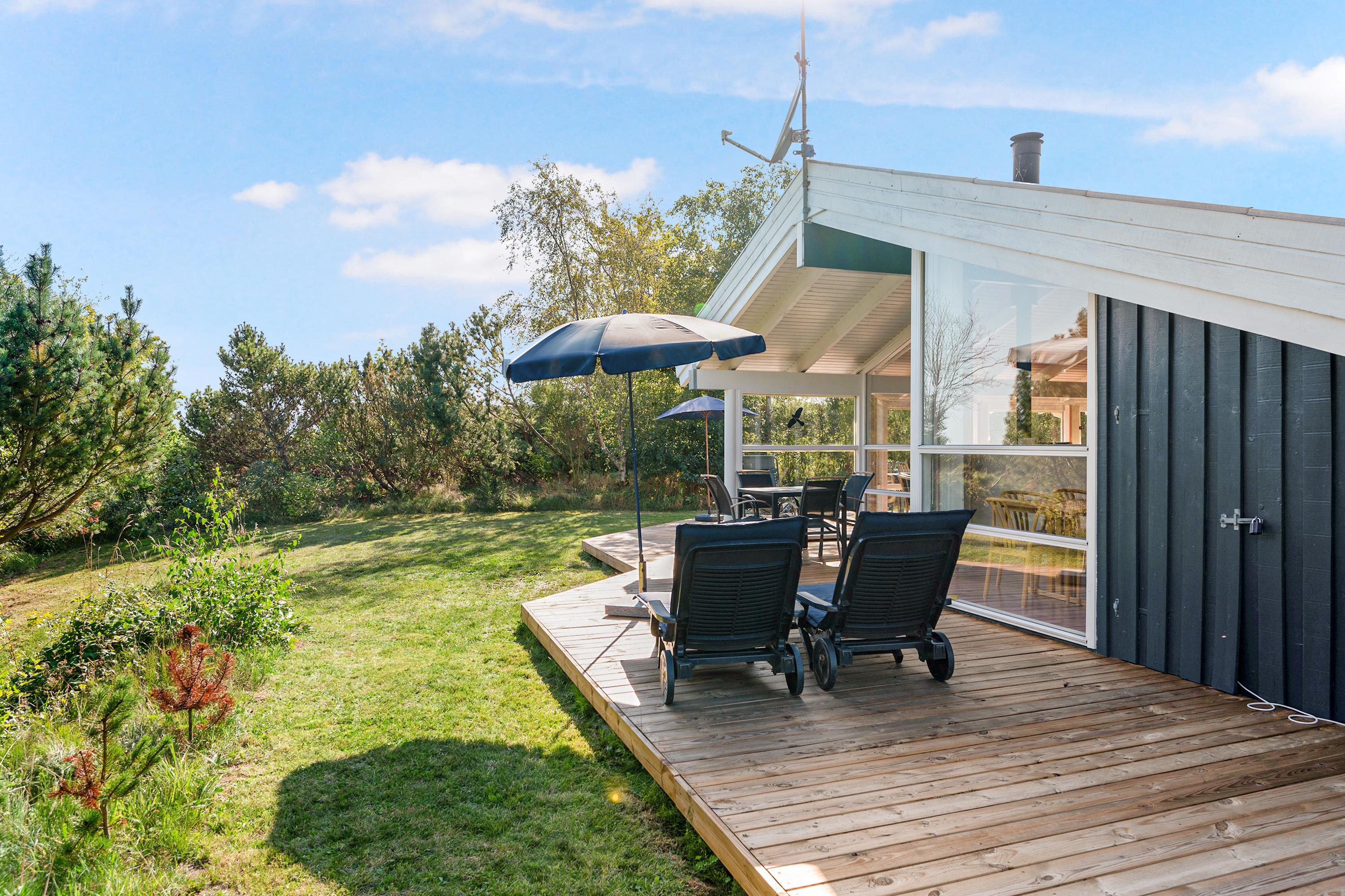 This lovely, bright, and well-appointed holiday home is situated high on a charming natural plot in the hills near Handrup Strand, with a view of Ebeltoft Bay. The house is surrounded by a large, partially covered wooden terrace with garden furniture, sun loungers, a parasol, and a barbecue. There is a carport, and the plot also features swings, a sandpit, and a football goal for the little ones. The homeowners' association has its own beach plot with a pétanque court and a bathing bridge.