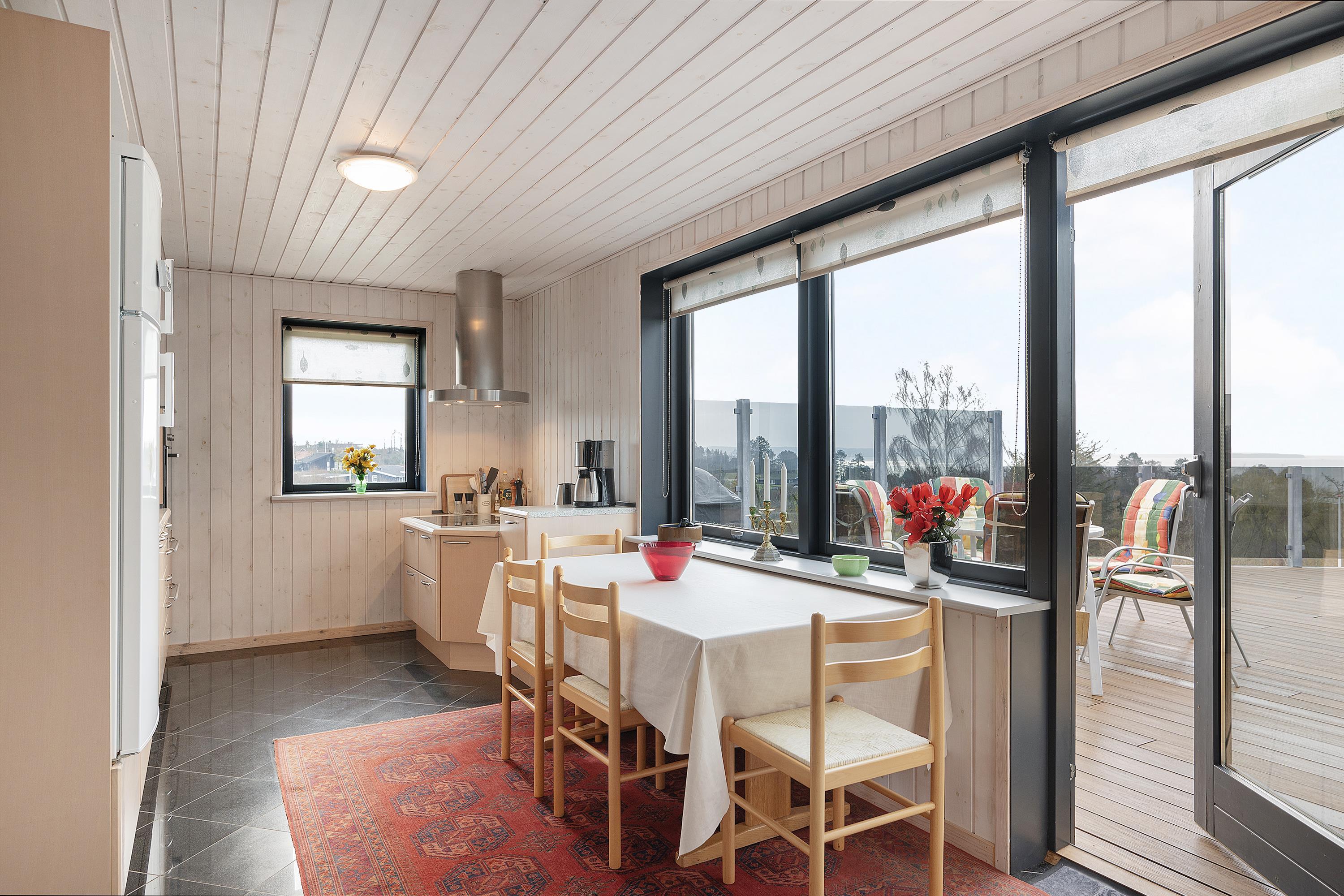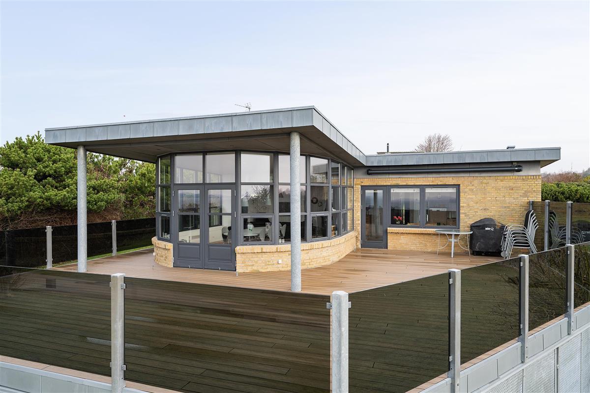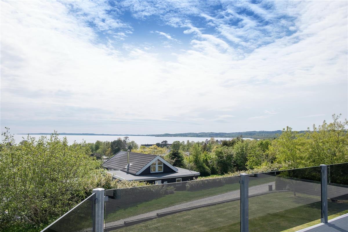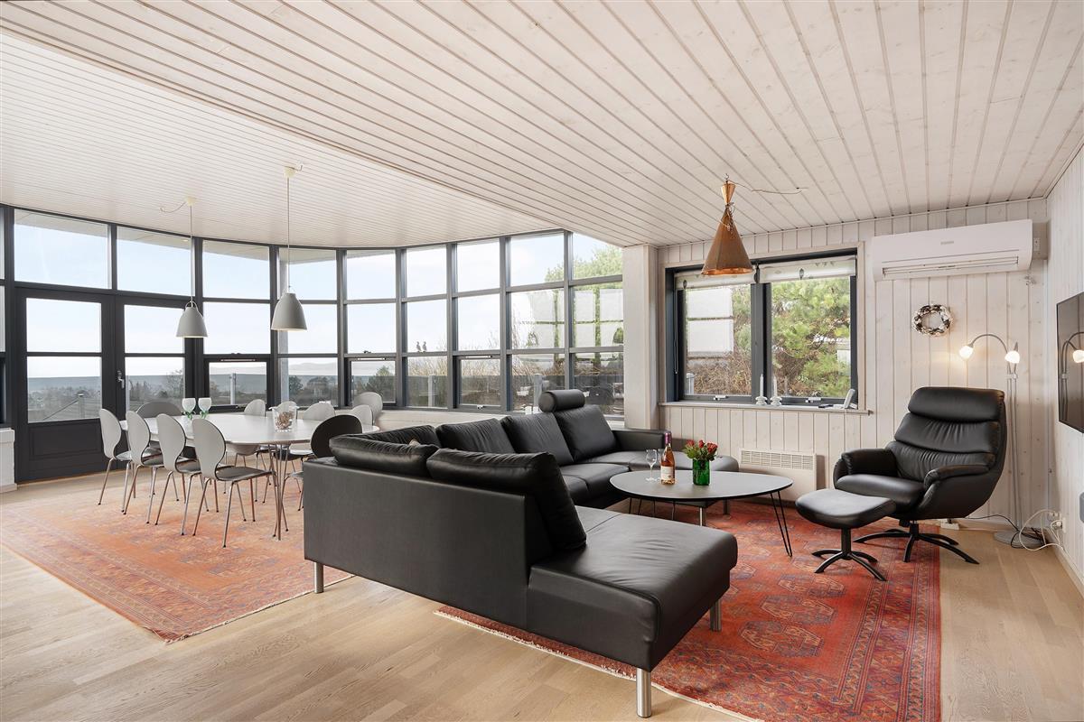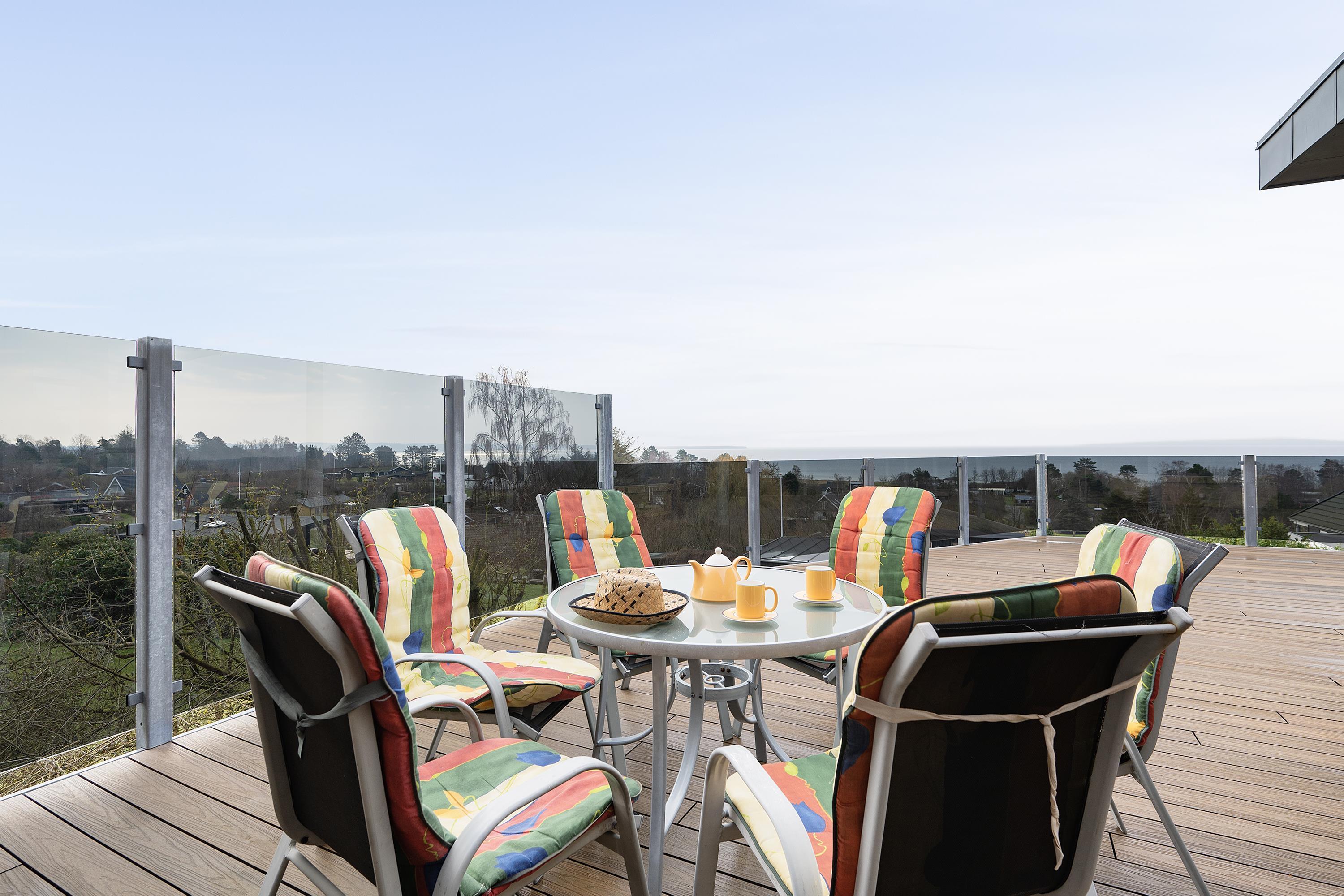 This exceptionally spacious, bright, and beautiful holiday home is situated high on a sloping and well-maintained natural plot in the hills near Handrup Strand, offering panoramic views over Ebeltoft Bay. The large, enclosed terrace with access from the newly built dining room, which also functions as a sunroom with panoramic views, is furnished with garden furniture, sun loungers, a parasol, and a barbecue. A truly special and well-thought-out house.