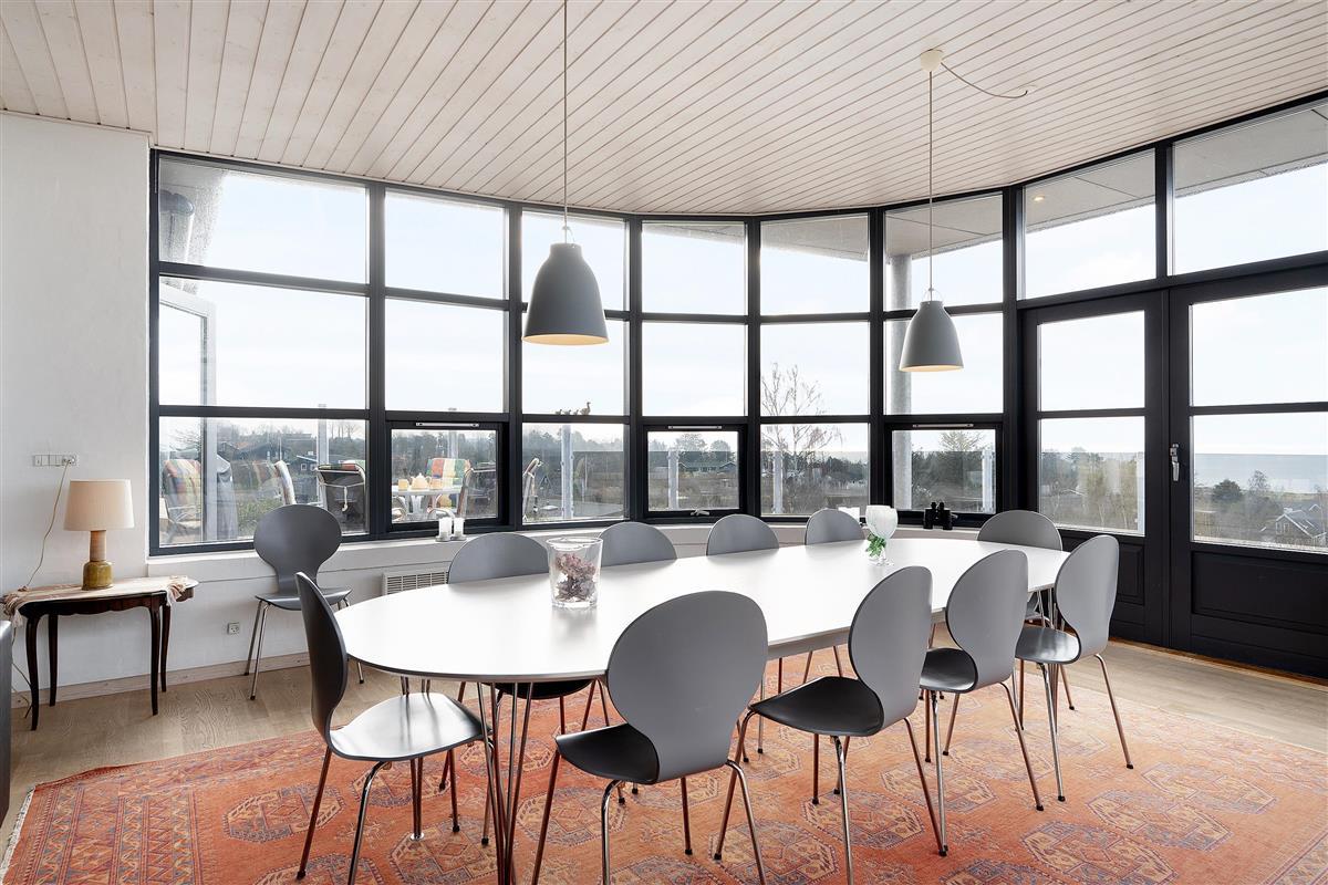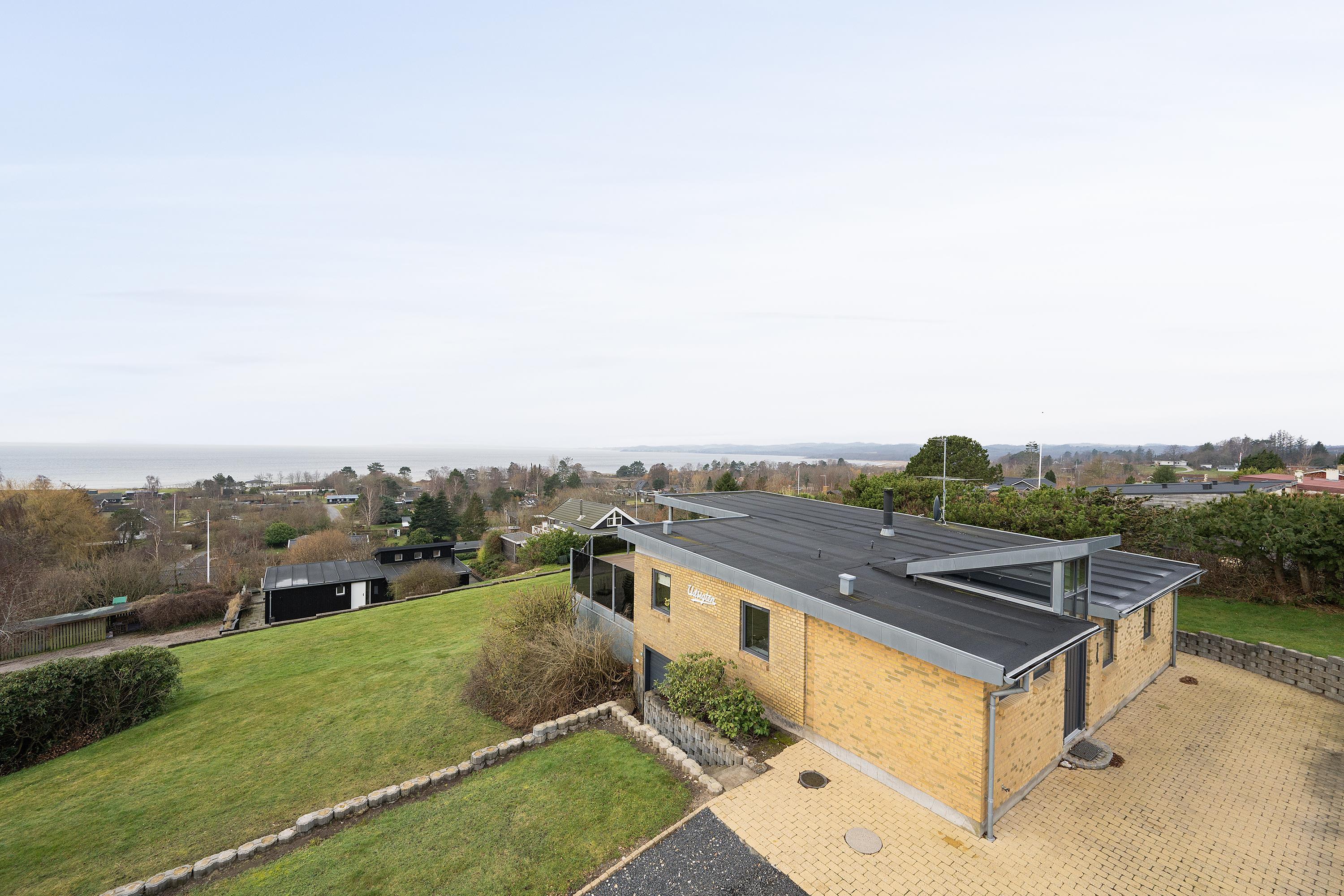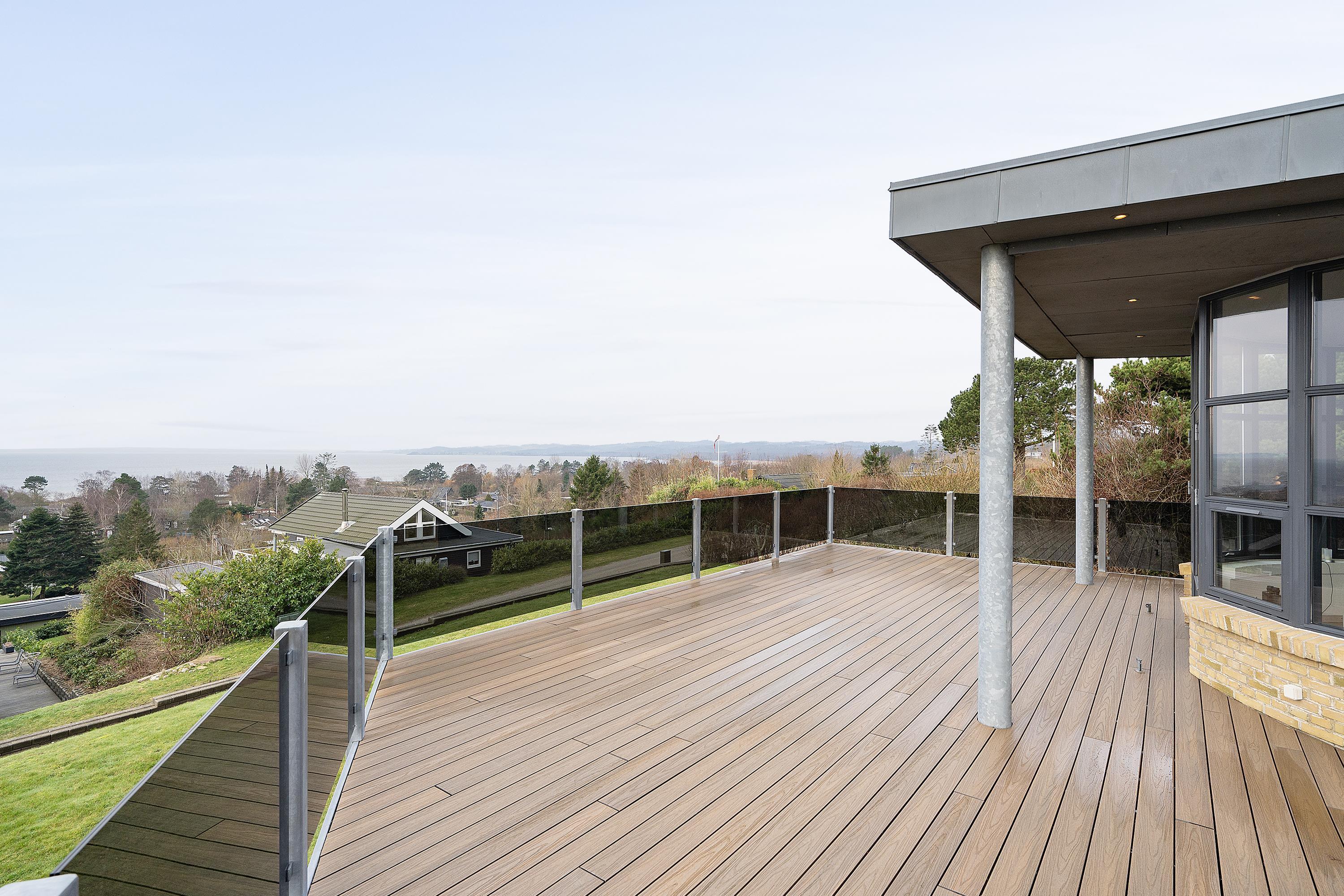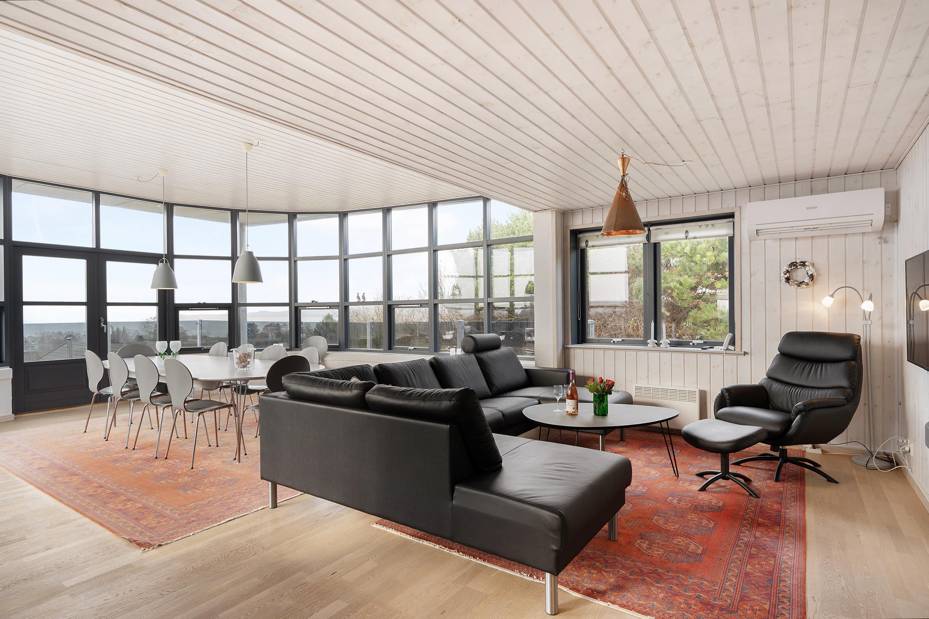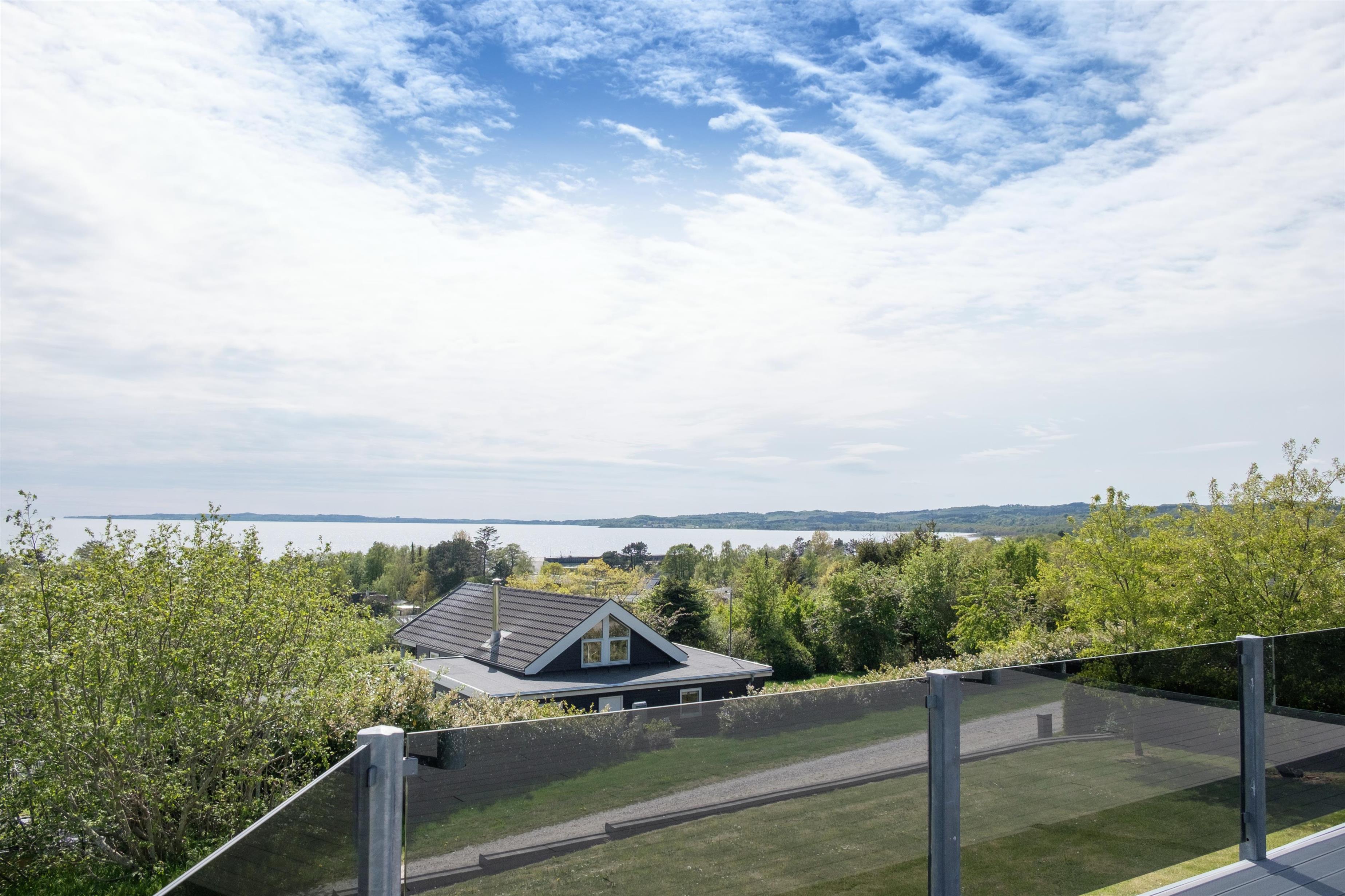 This exceptionally spacious, bright, and beautiful holiday home is situated high on a sloping and well-maintained natural plot in the hills near Handrup Strand, offering panoramic views over Ebeltoft Bay. The large, enclosed terrace with access from the newly built dining room, which also functions as a sunroom with panoramic views, is furnished with garden furniture, sun loungers, a parasol, and a barbecue. A truly special and well-thought-out house.