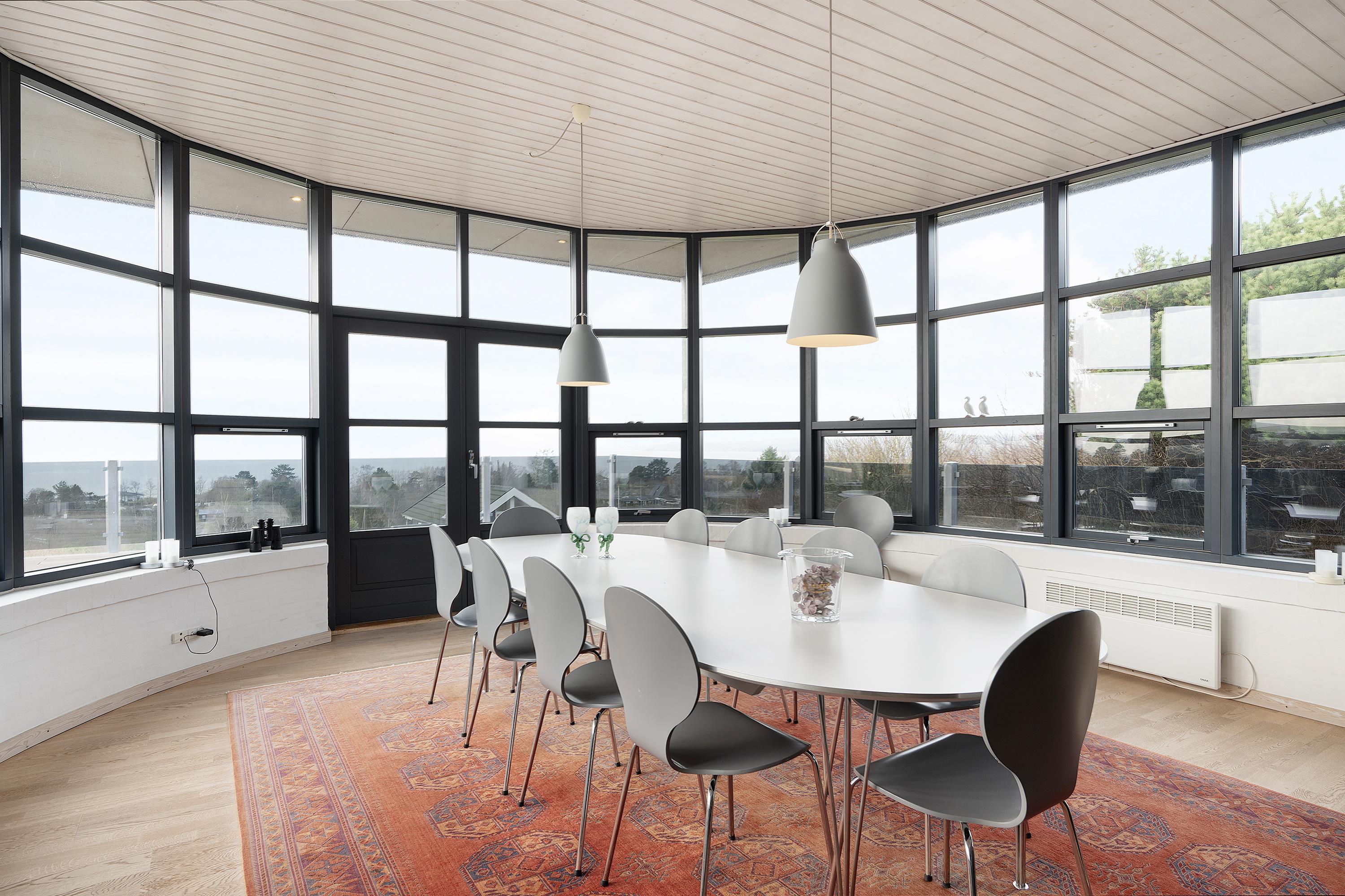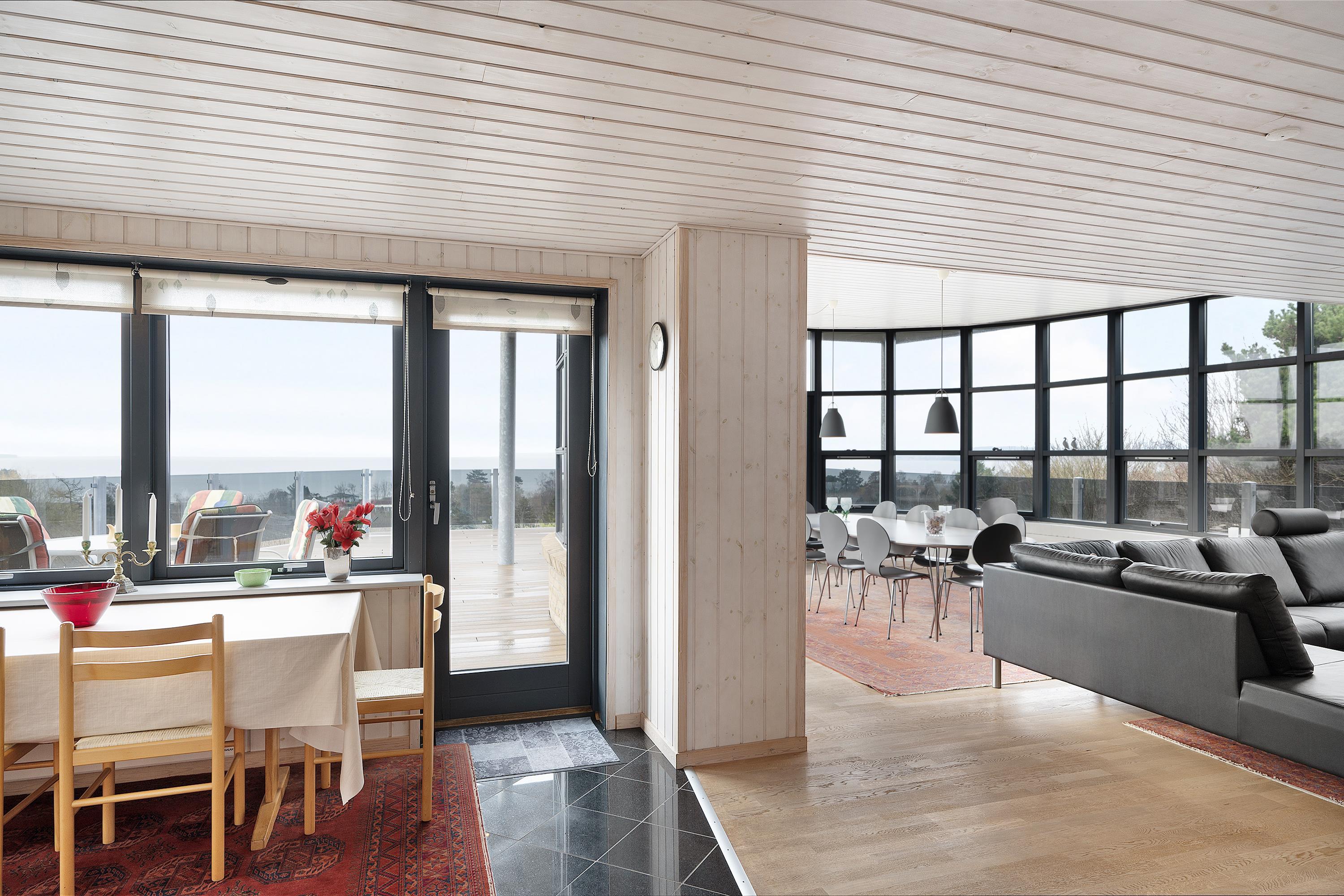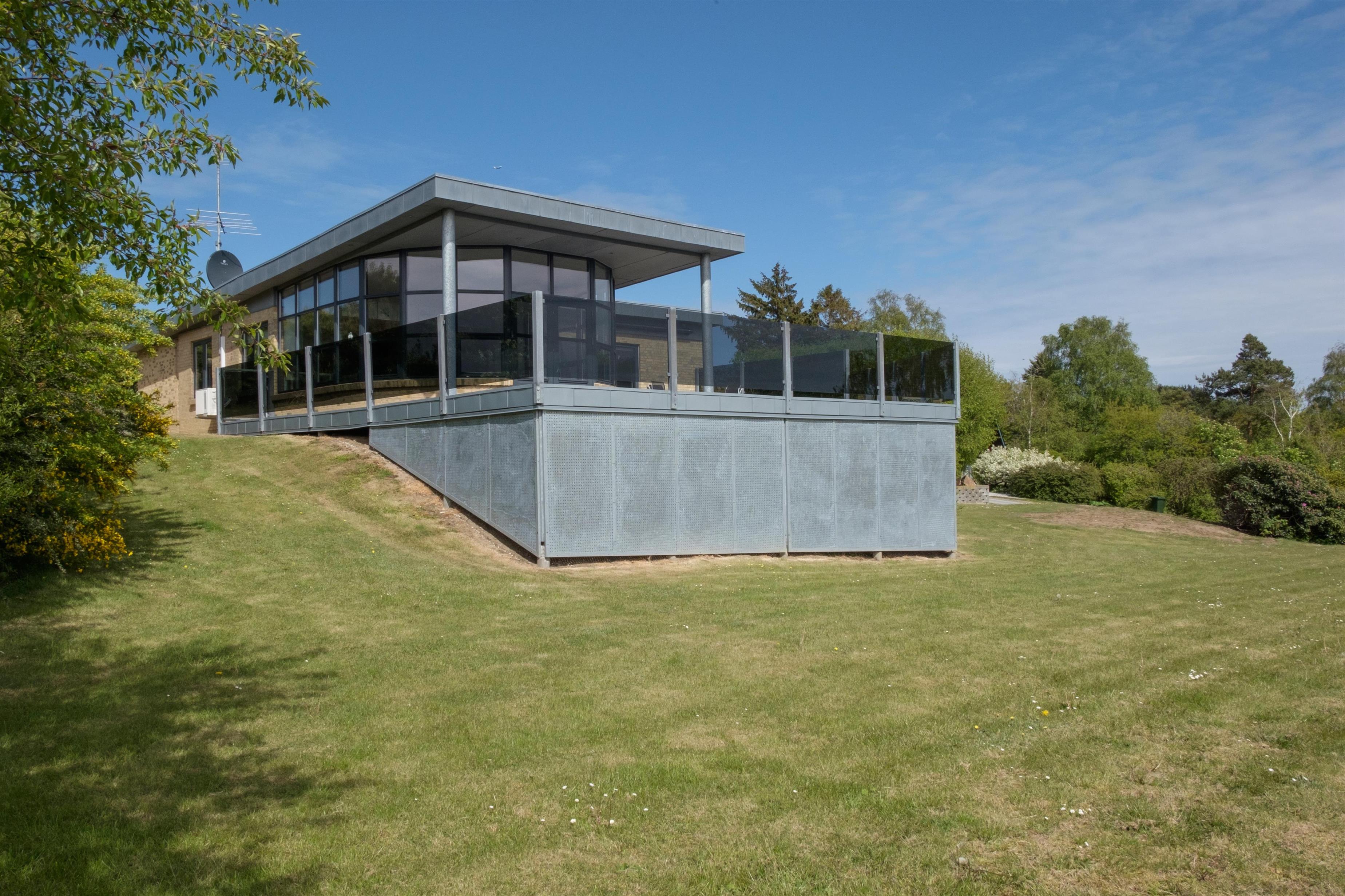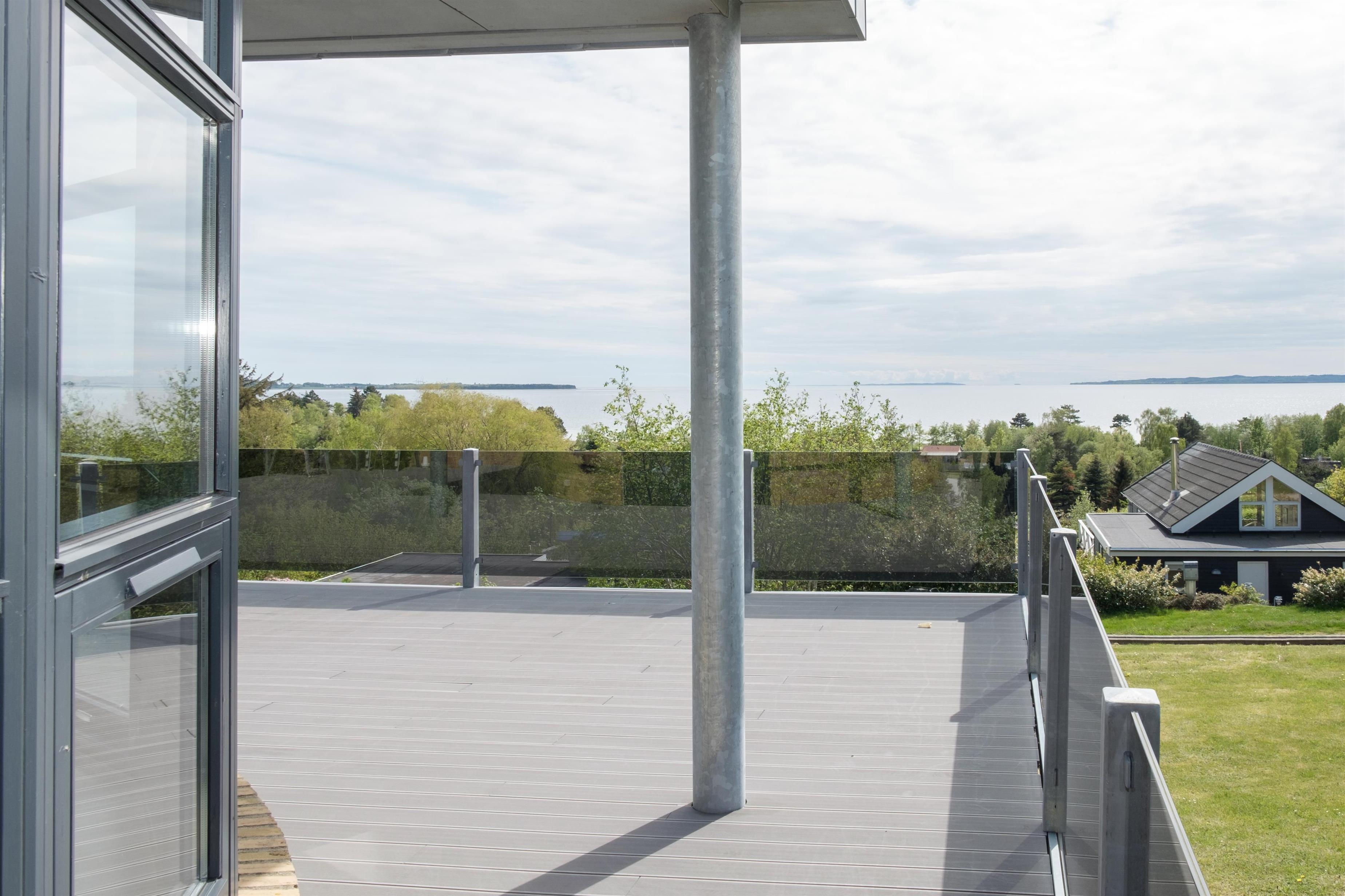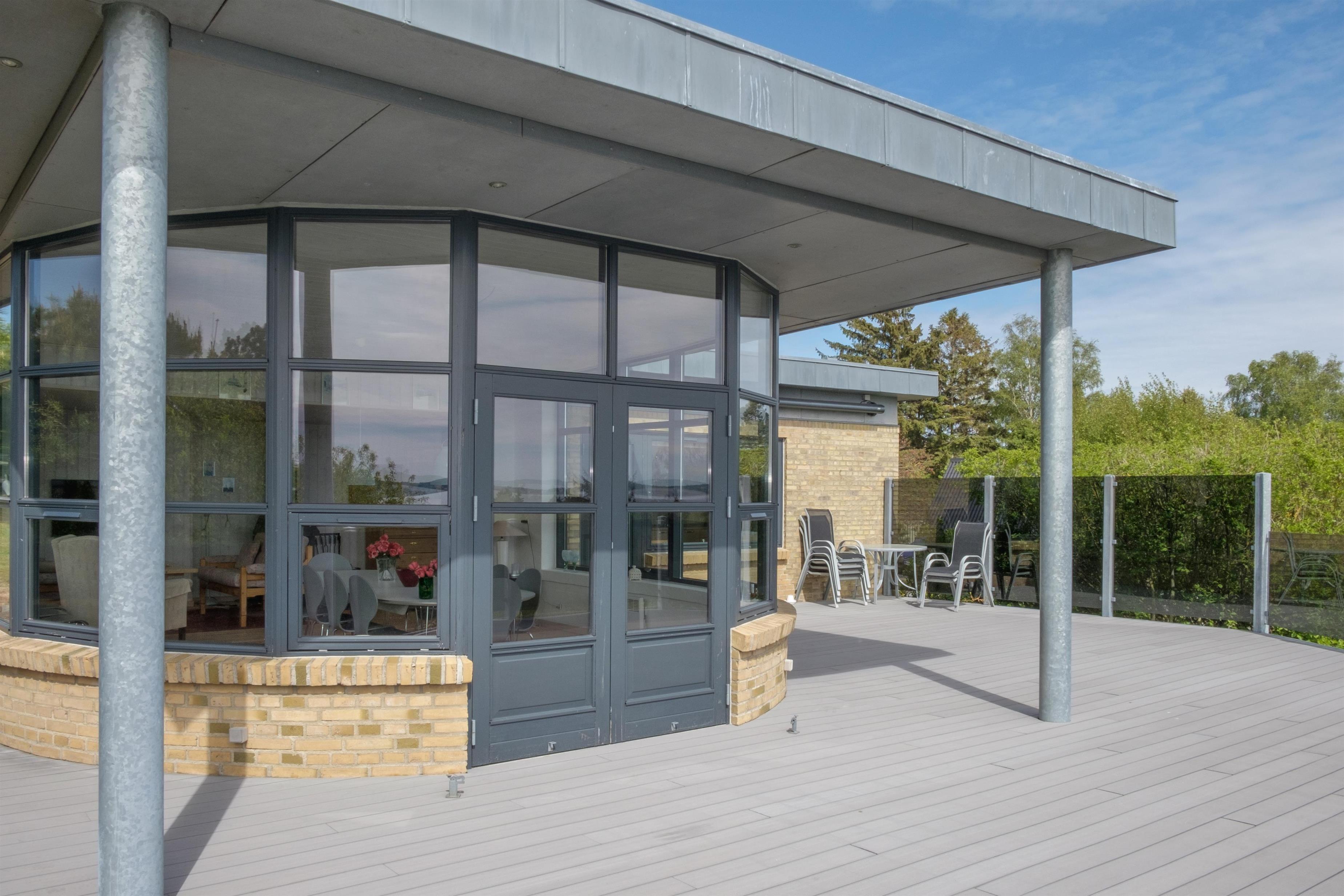 This exceptionally spacious, bright, and beautiful holiday home is situated high on a sloping and well-maintained natural plot in the hills near Handrup Strand, offering panoramic views over Ebeltoft Bay. The large, enclosed terrace with access from the newly built dining room, which also functions as a sunroom with panoramic views, is furnished with garden furniture, sun loungers, a parasol, and a barbecue. A truly special and well-thought-out house.