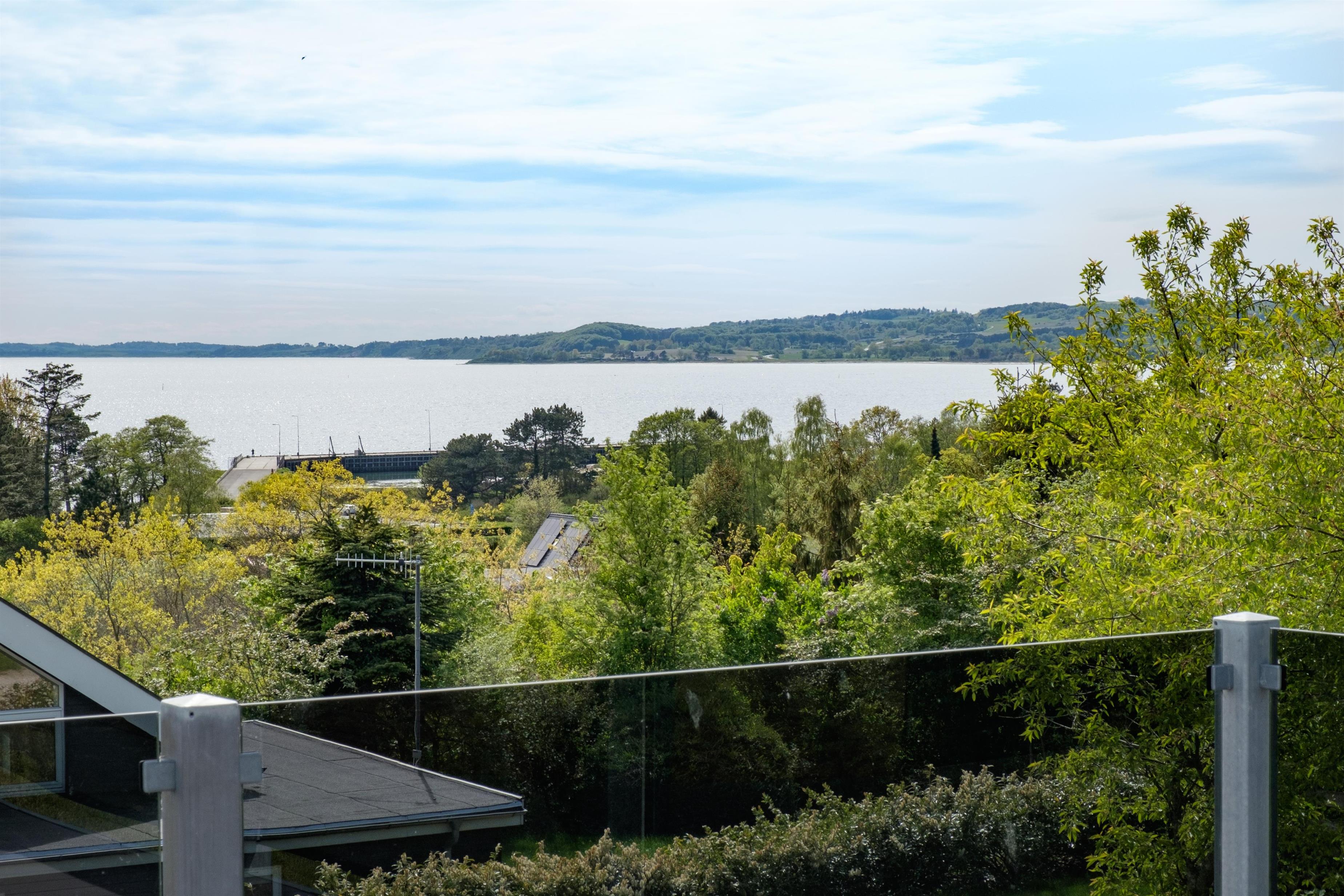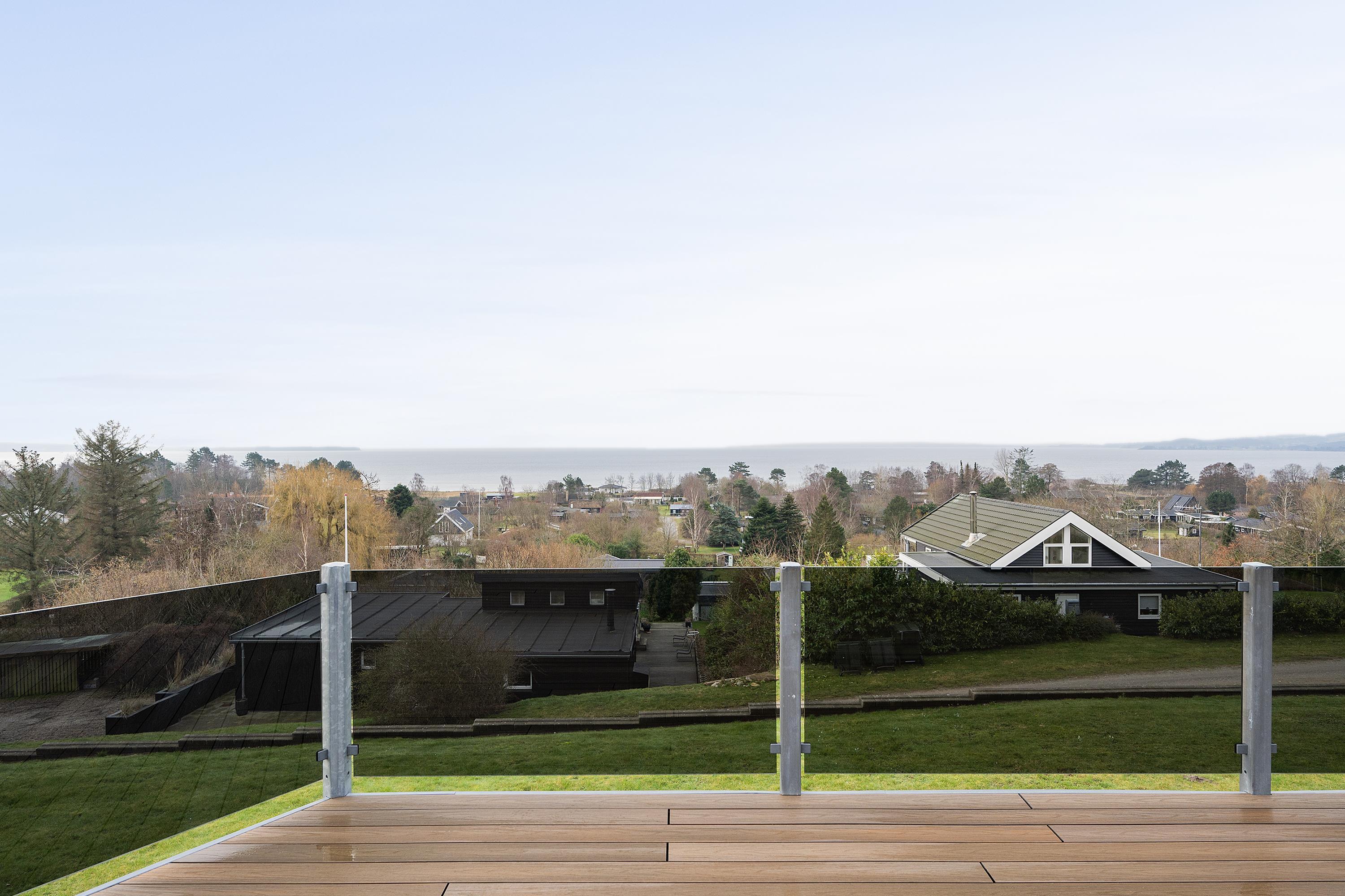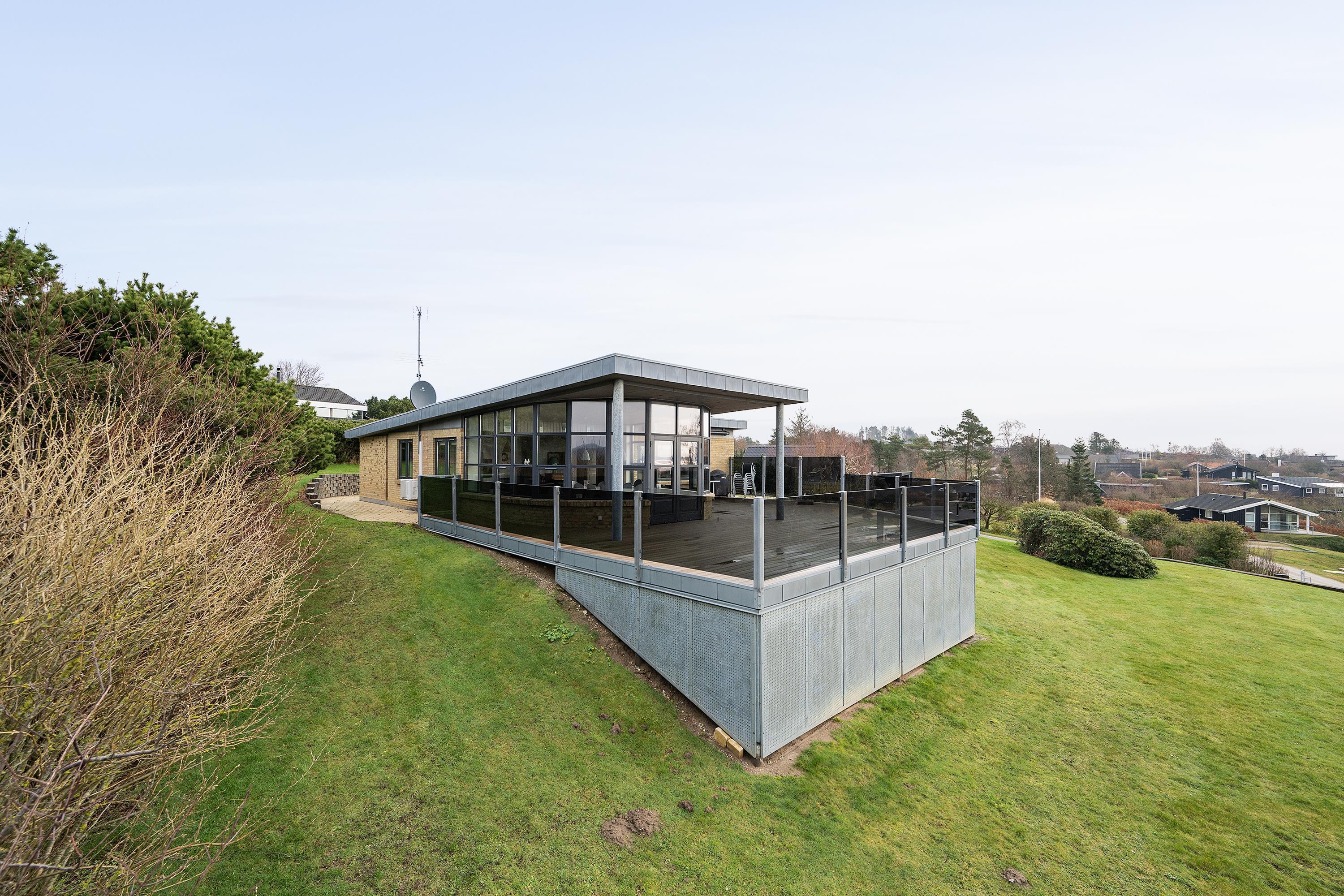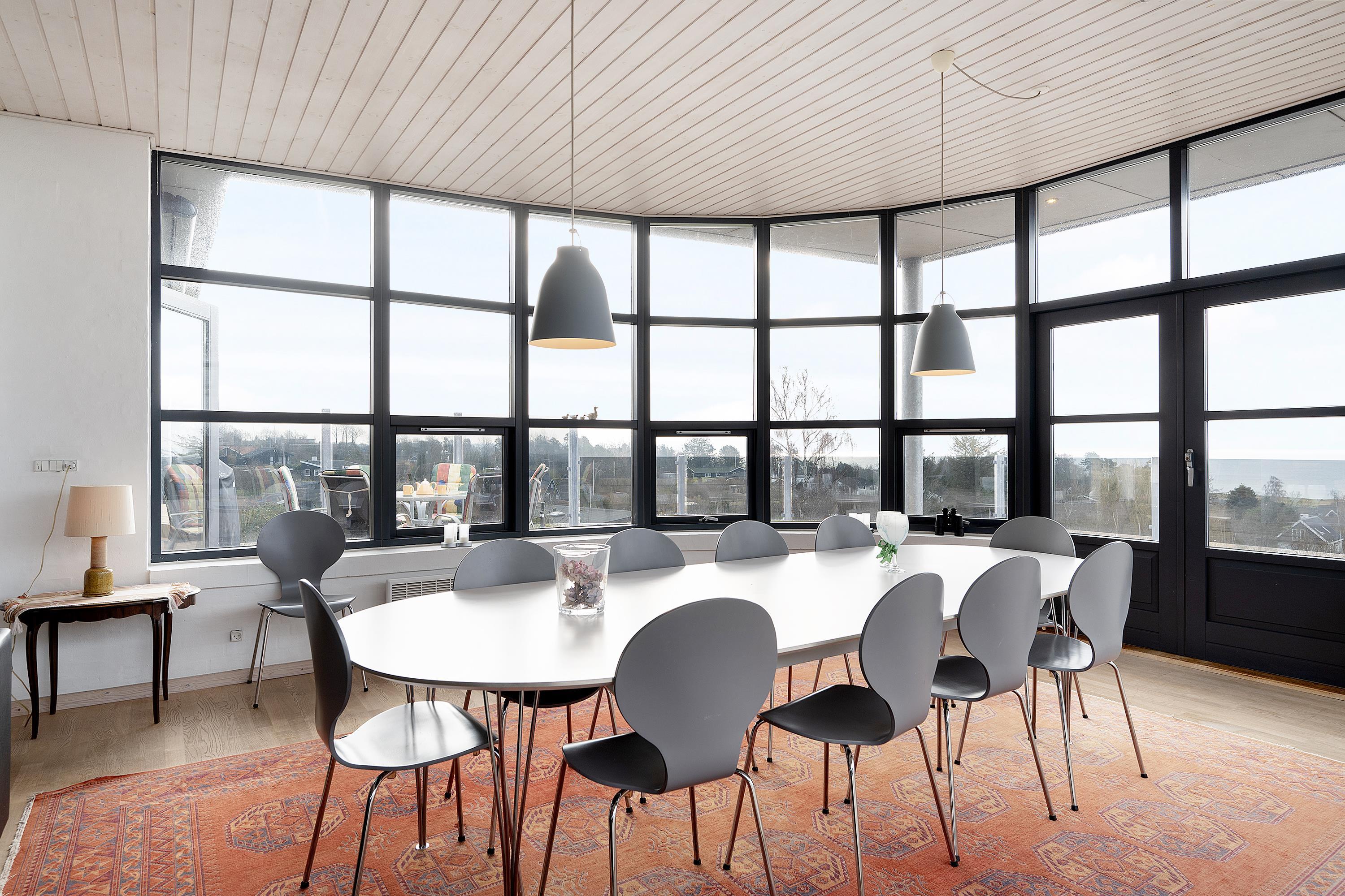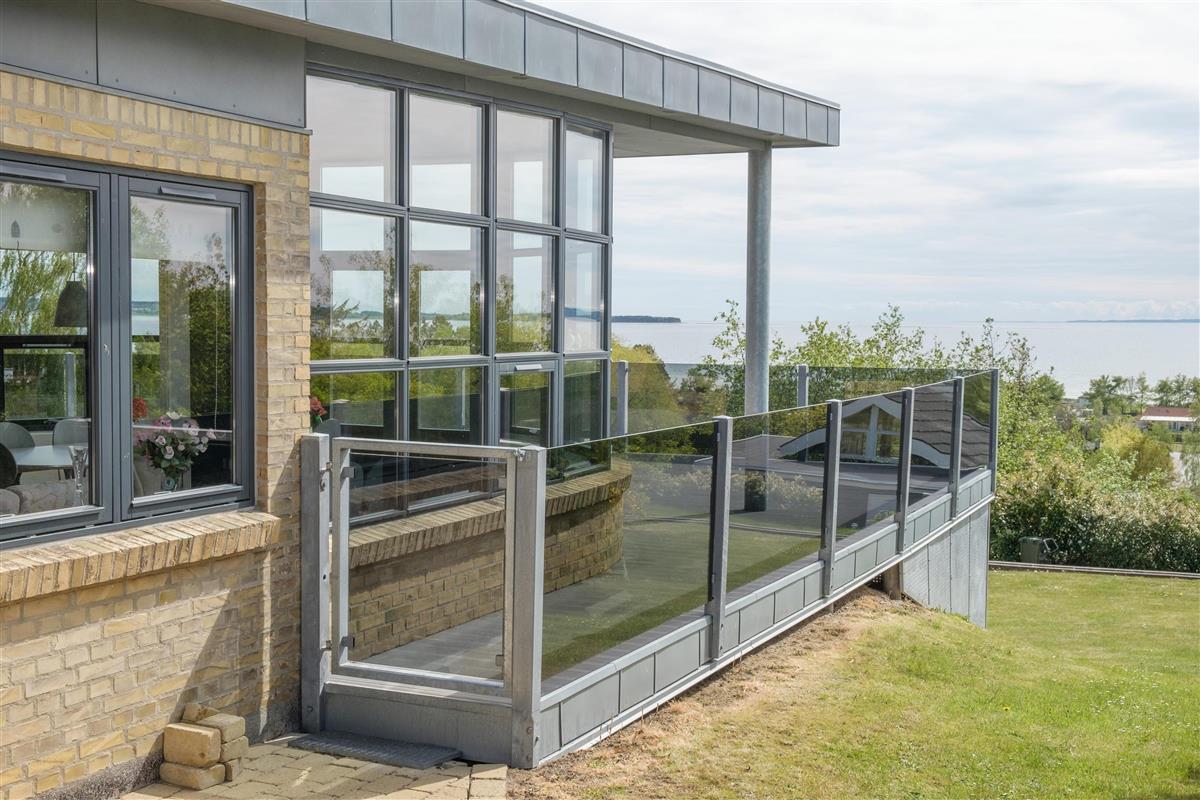 This exceptionally spacious, bright, and beautiful holiday home is situated high on a sloping and well-maintained natural plot in the hills near Handrup Strand, offering panoramic views over Ebeltoft Bay. The large, enclosed terrace with access from the newly built dining room, which also functions as a sunroom with panoramic views, is furnished with garden furniture, sun loungers, a parasol, and a barbecue. A truly special and well-thought-out house.