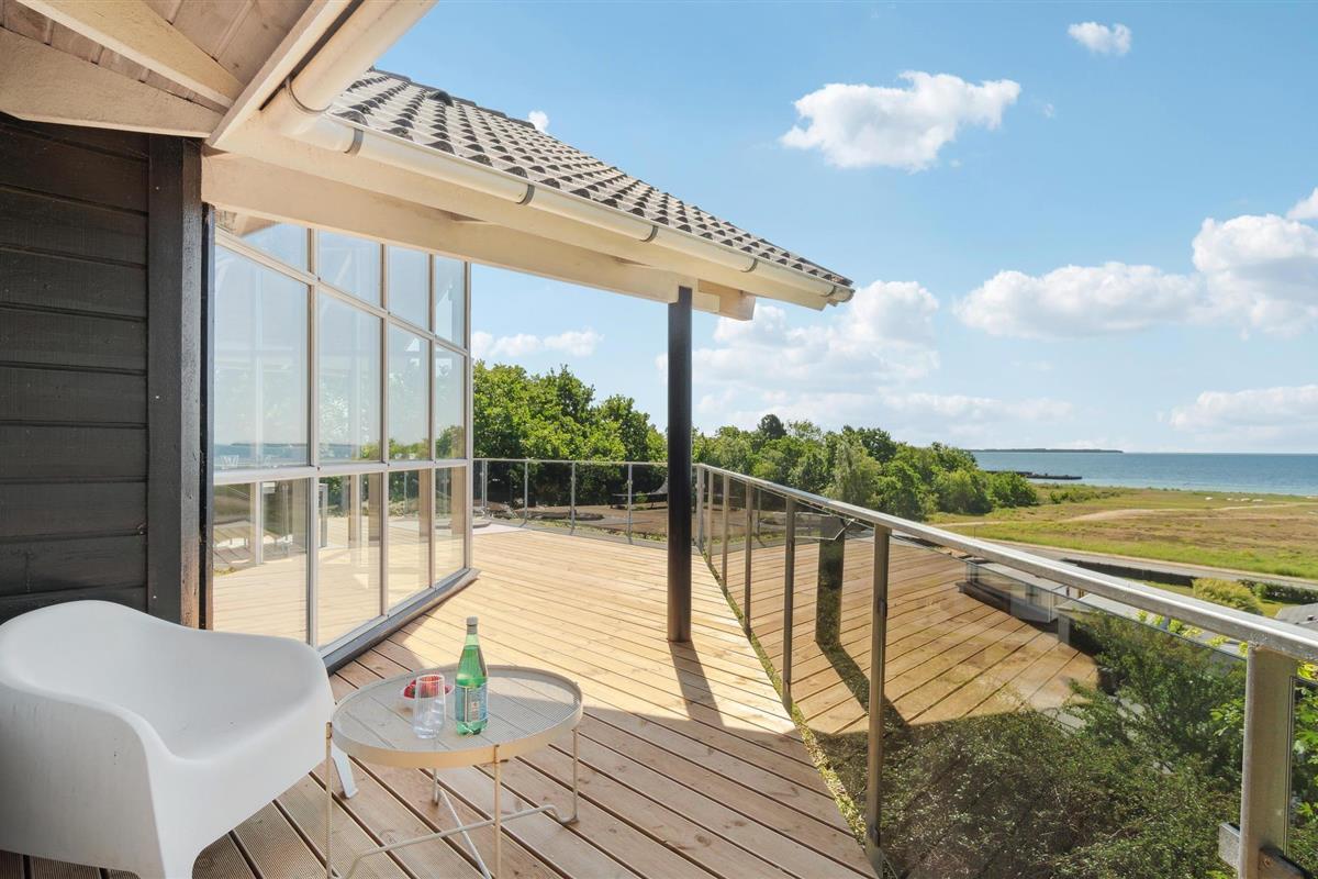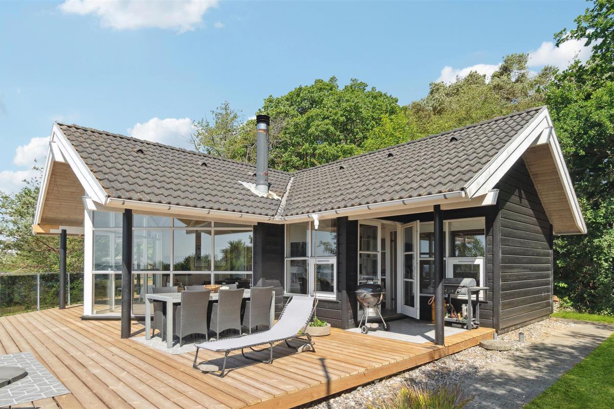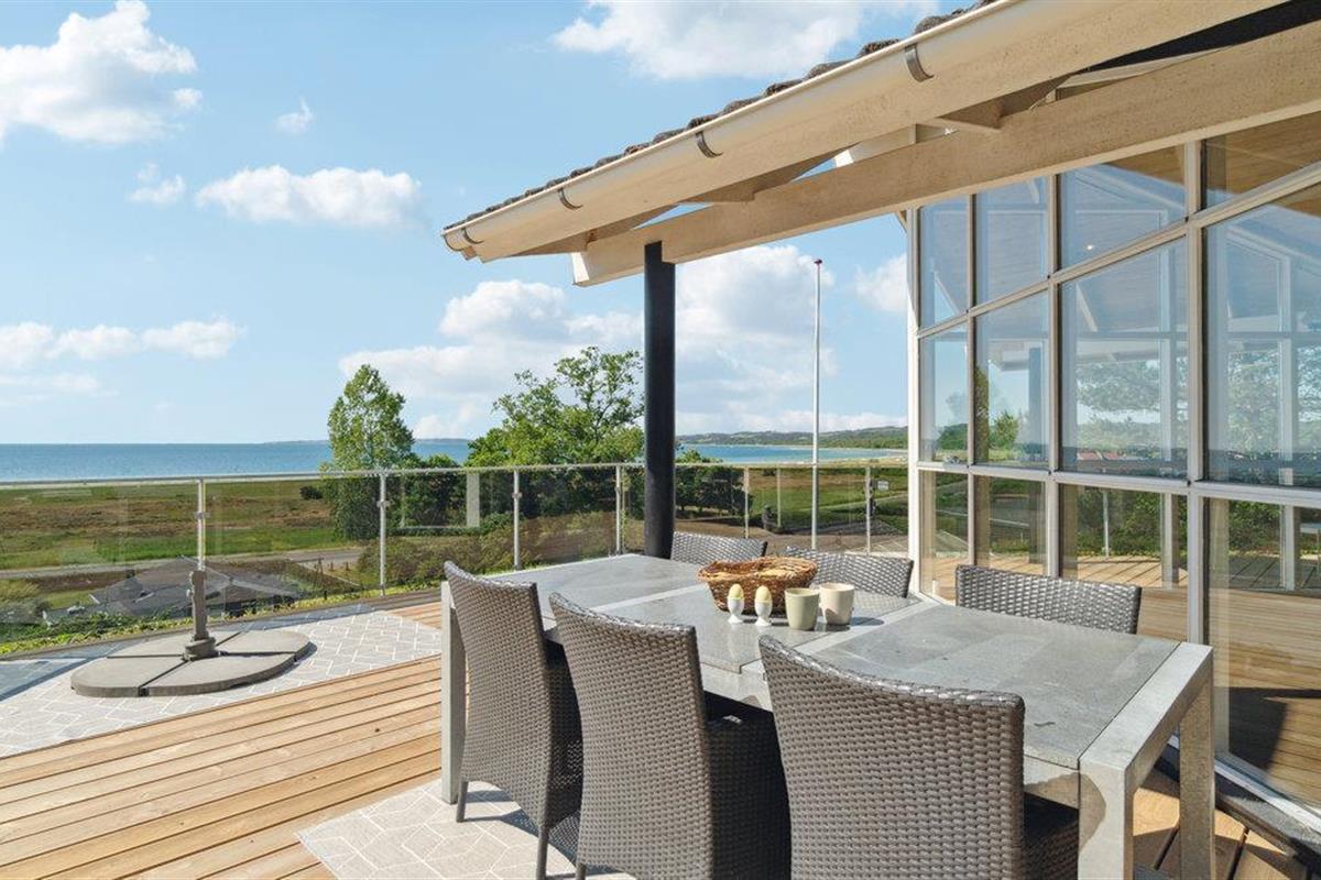 Modern vakantiehuis met panoramisch zeezicht en groot terras in het heuvelachtige Lyngsbæk, Denemarken.