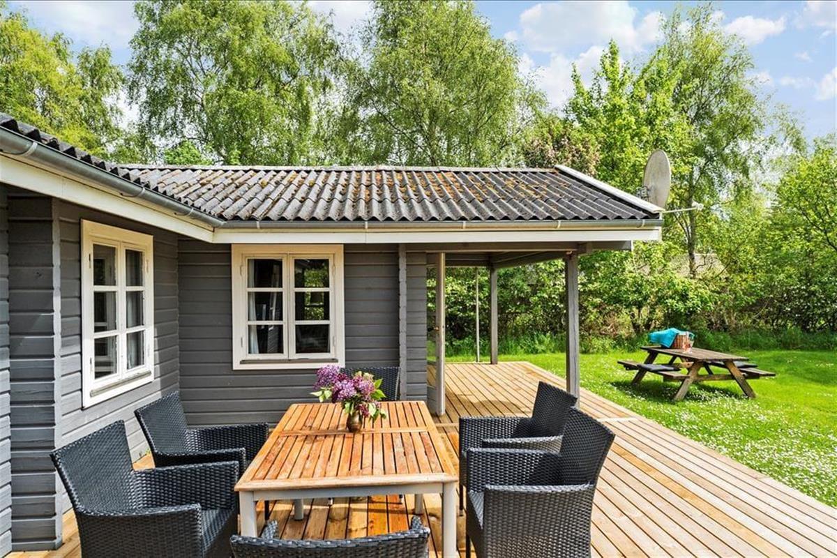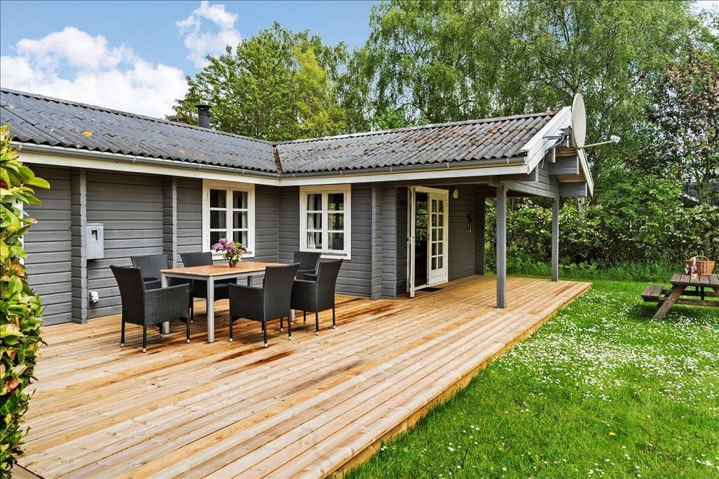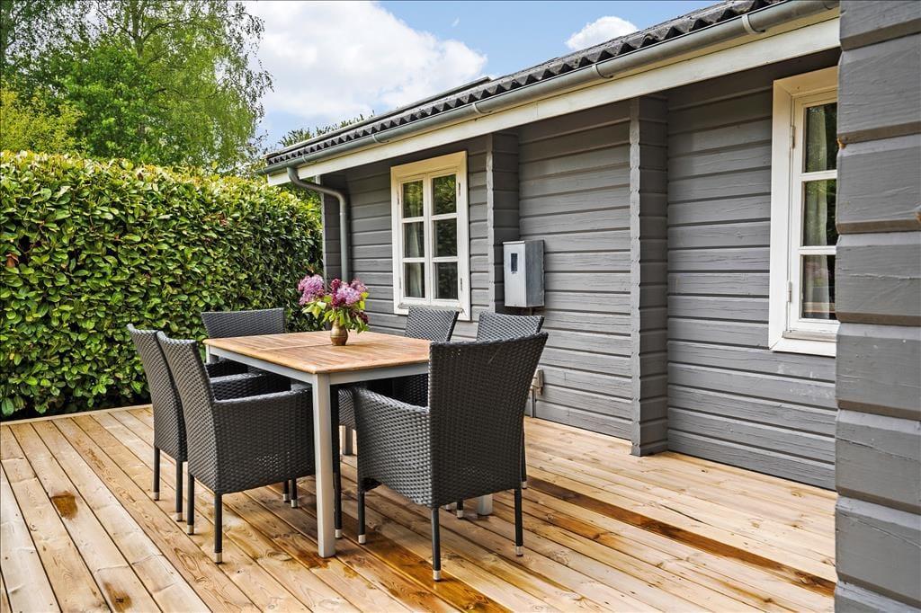 Rund um das Mietobjekt erstreckt sich ein großer, geschlossener und grüner Garten, der mit seiner Grasfläche reiche Möglichkeiten zum Spielen und Umhertollen bietet. Vom Wohnraum aus gelangen Sie direkt hinaus auf die große, gänzlich ungestörte und teilweise überdachte Holzterrasse, auf der Sie nach Herzenslust die Sonne, die Mahlzeiten und gemütliche Grillabende genießen werden. Der überdachte Terrassenbereich ist gut geschützt und bietet an warmen Tagen angenehm kühlen Schatten.