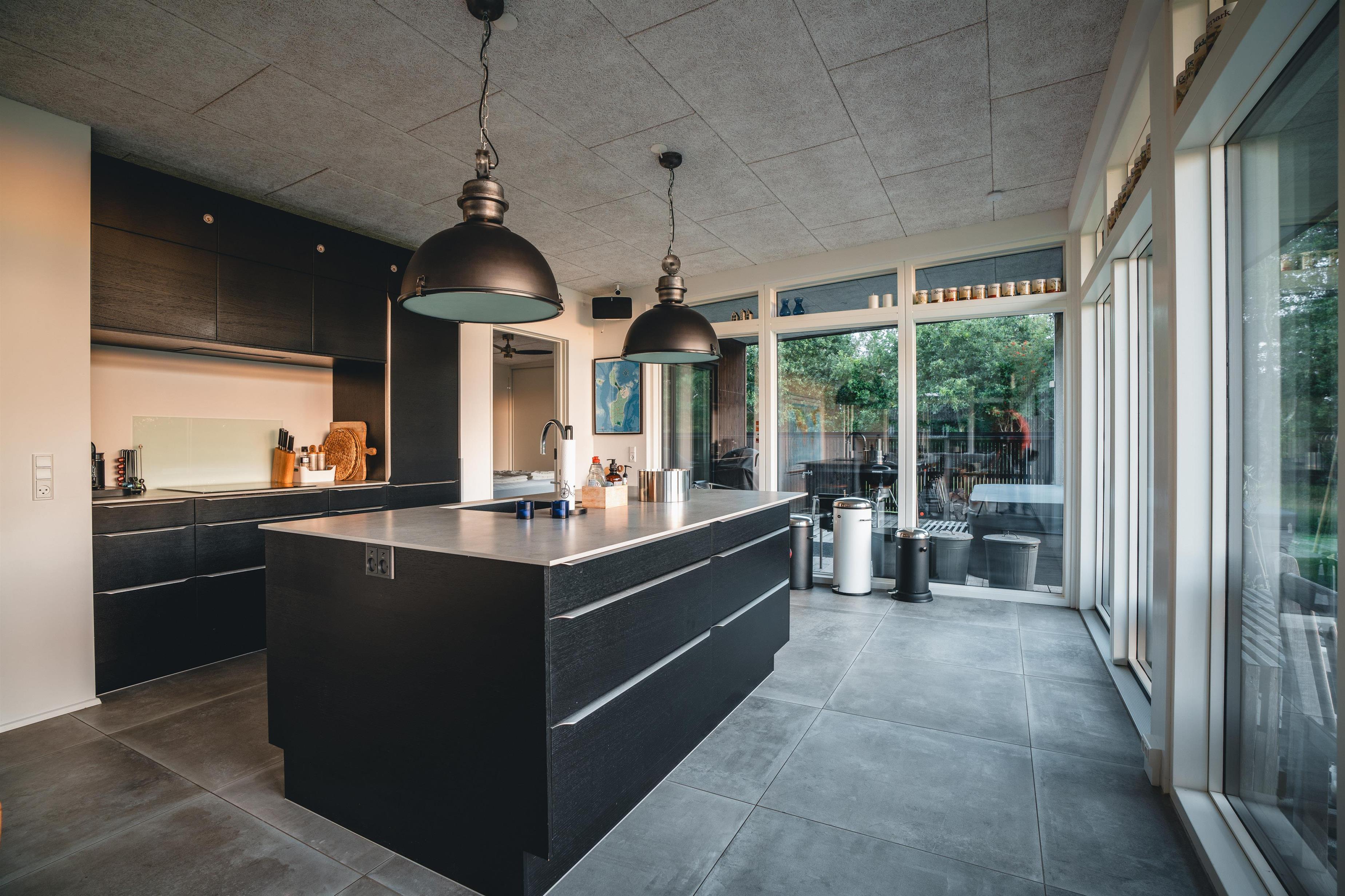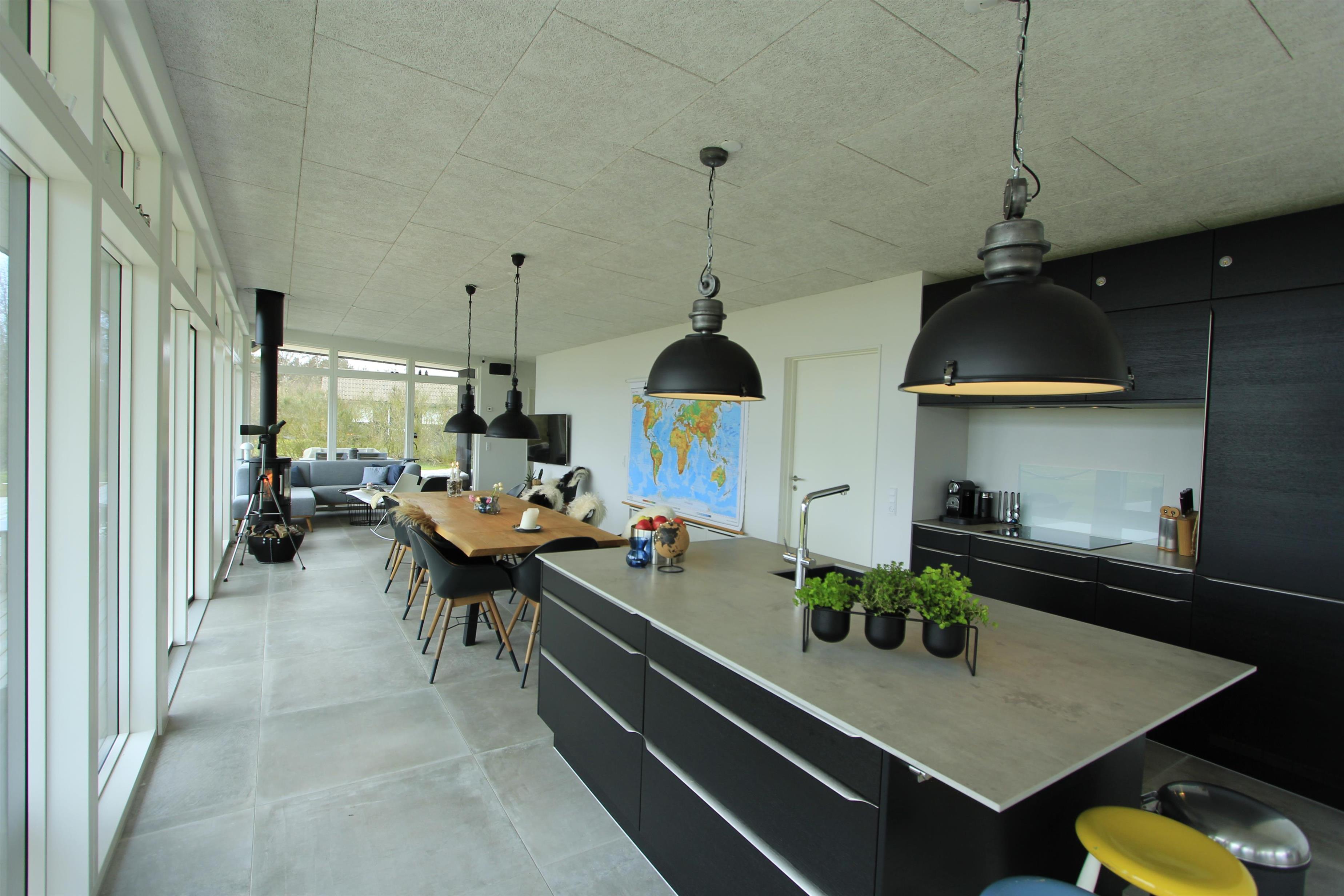 The holiday home is furnished with a focus on comfort and cosiness. The heart of the house is the large, bright kitchen-living room with a kitchen island, dining area and sofa section, where large windows open up to the fantastic view. Here, the whole family can gather for meals, games or relaxation in front of the wood-burning stove on cool evenings.