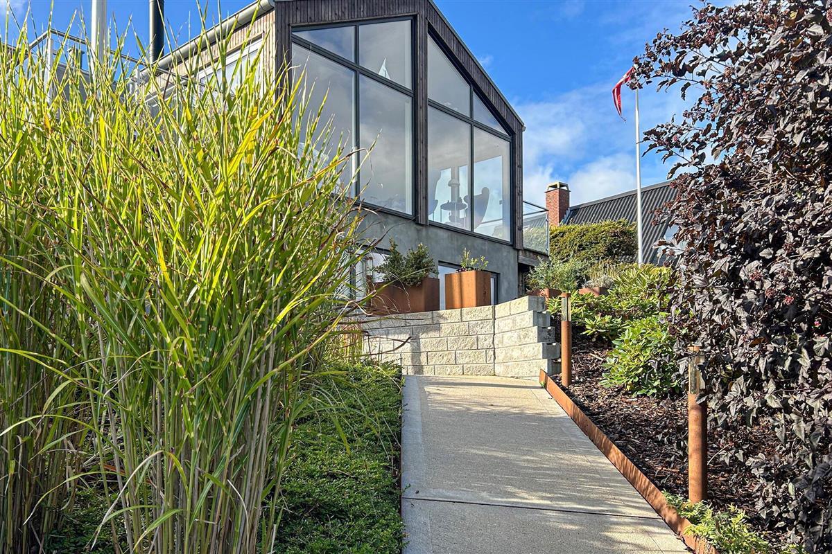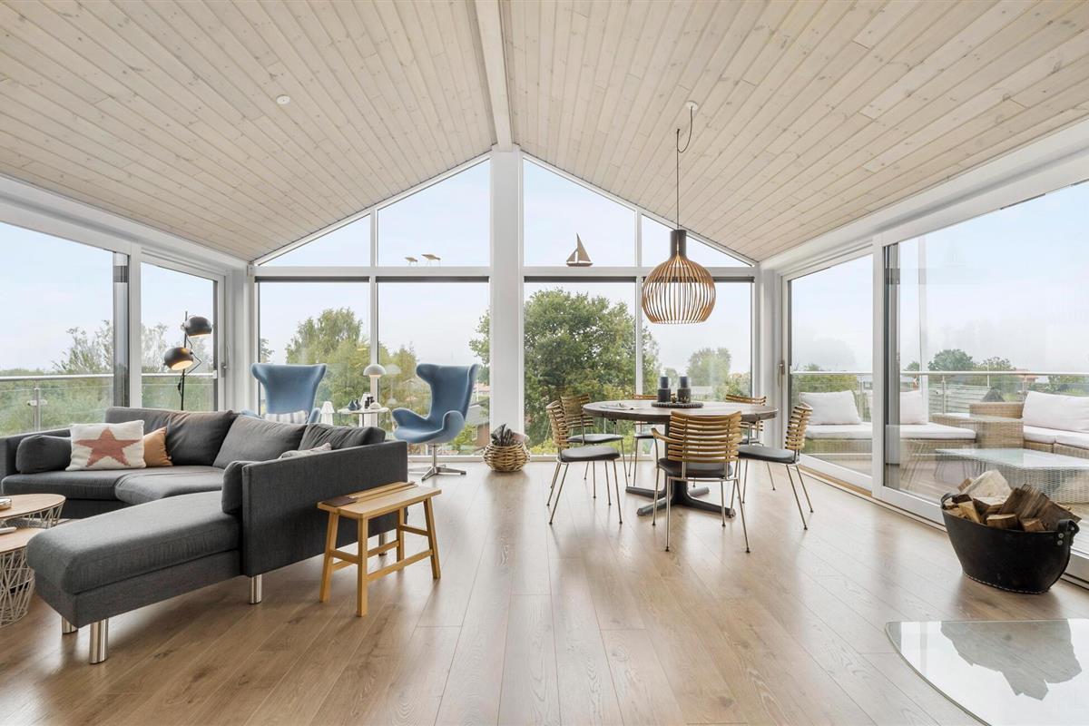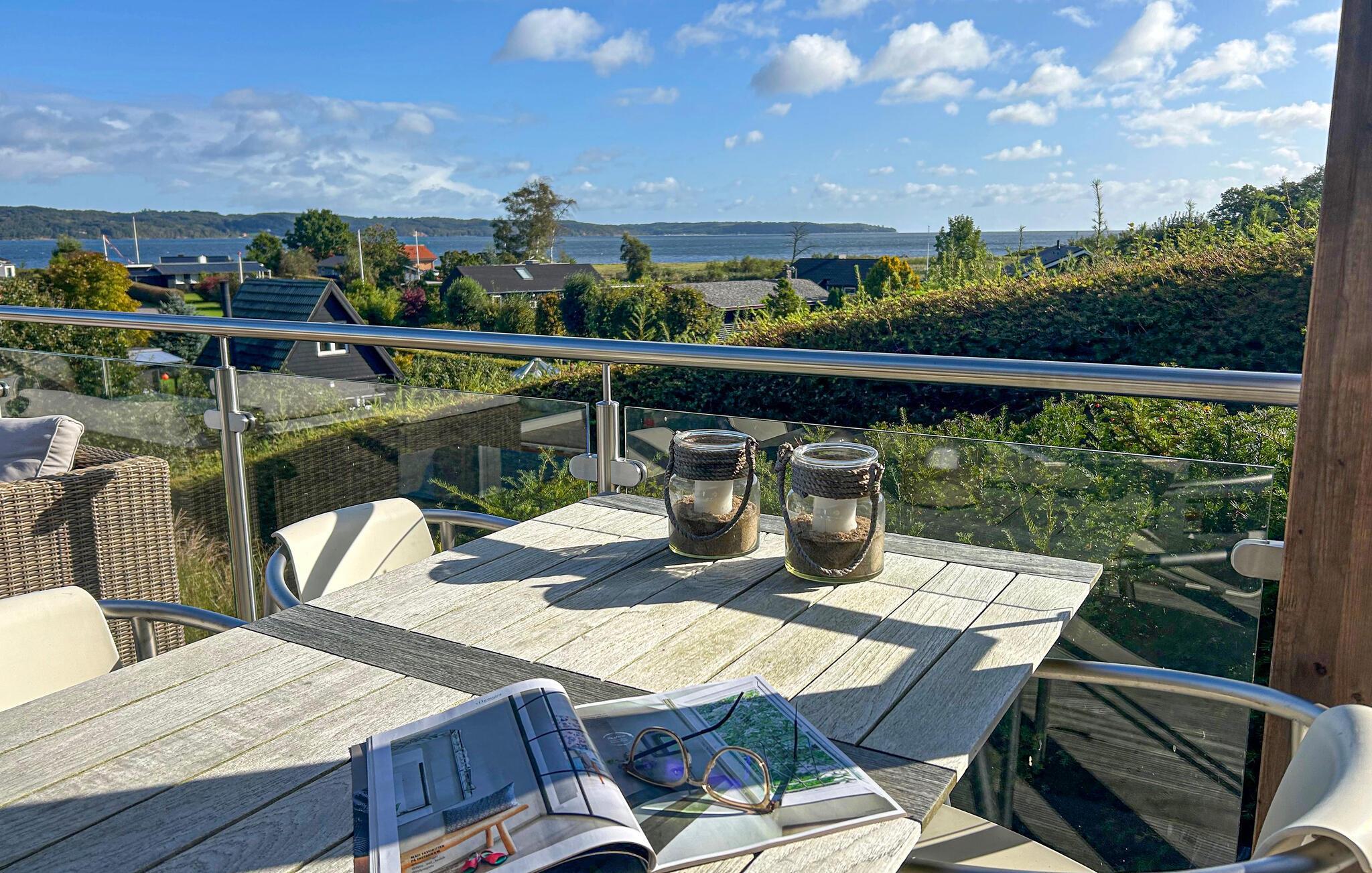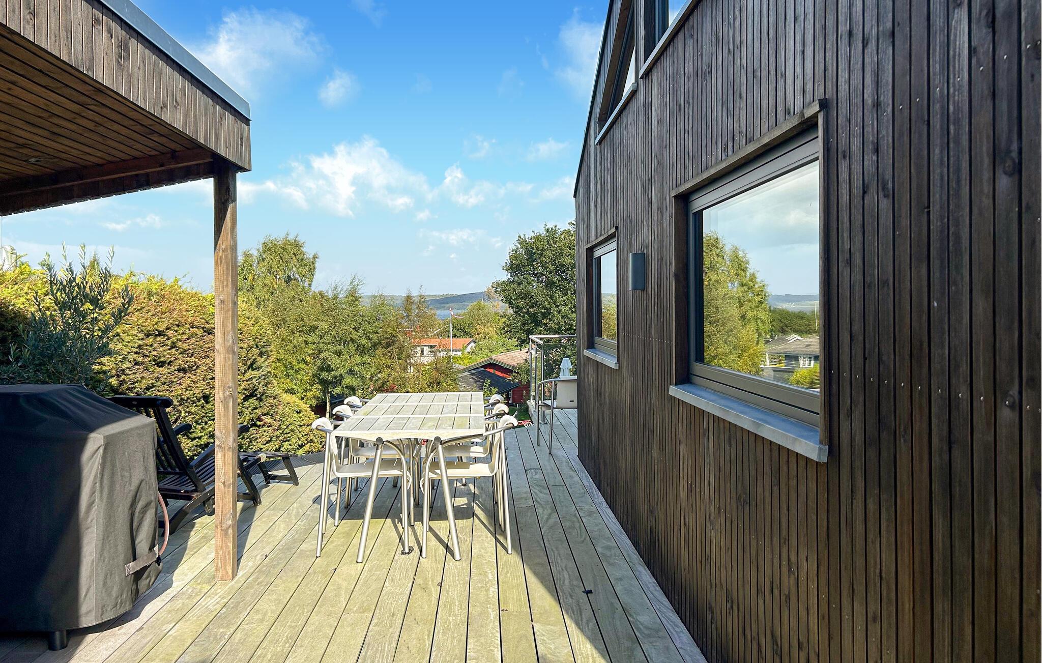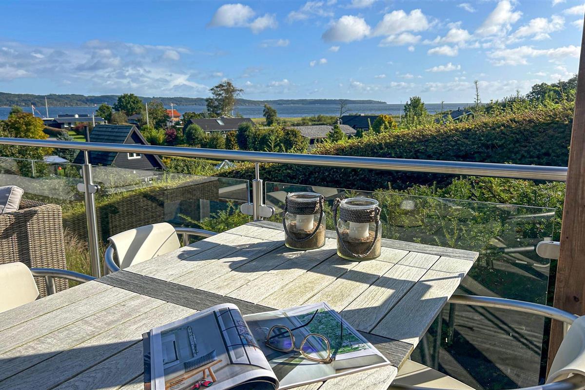 Stijlvol vakantiehuis in Mørkholt met panoramisch uitzicht op Vejle Fjord en rustige tuin.