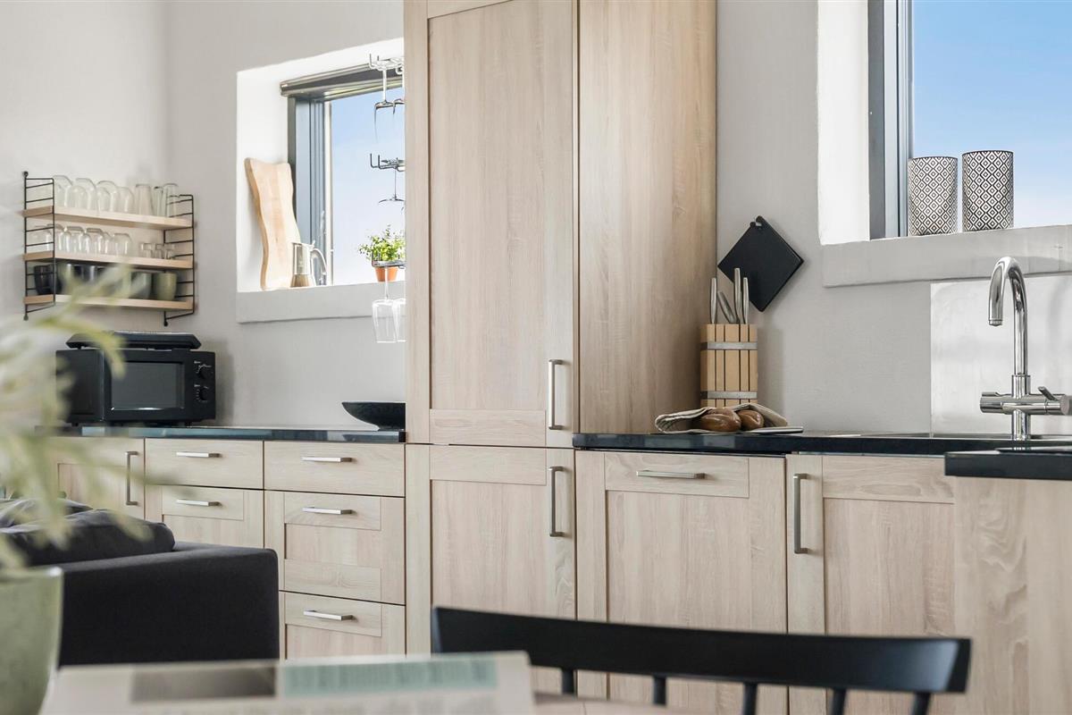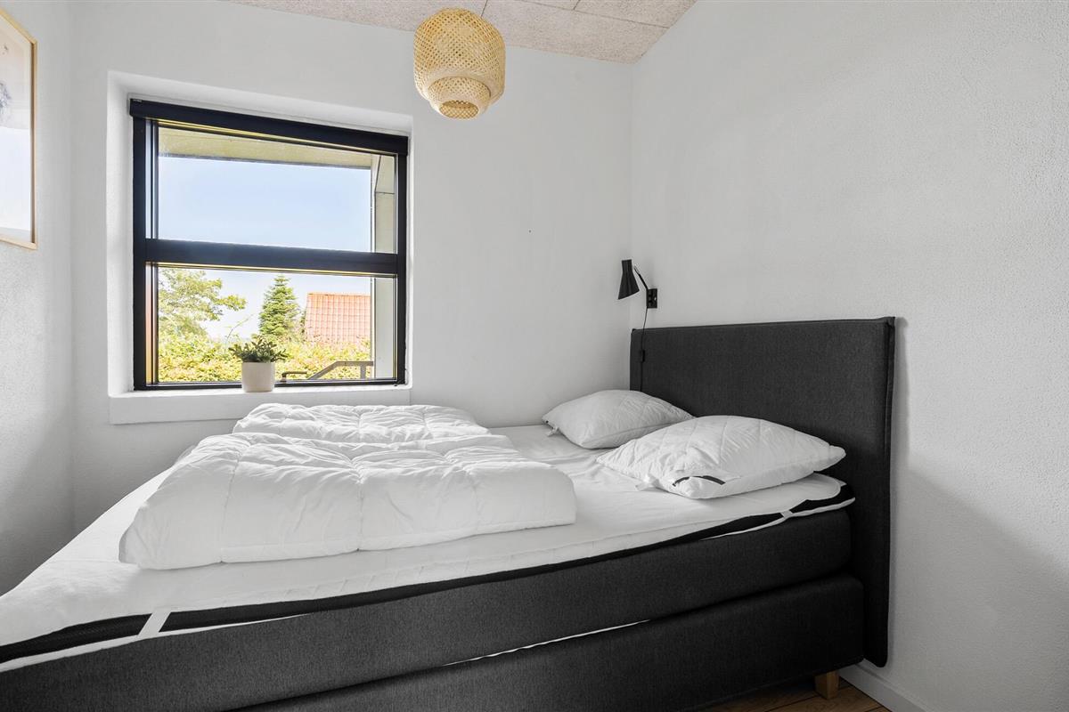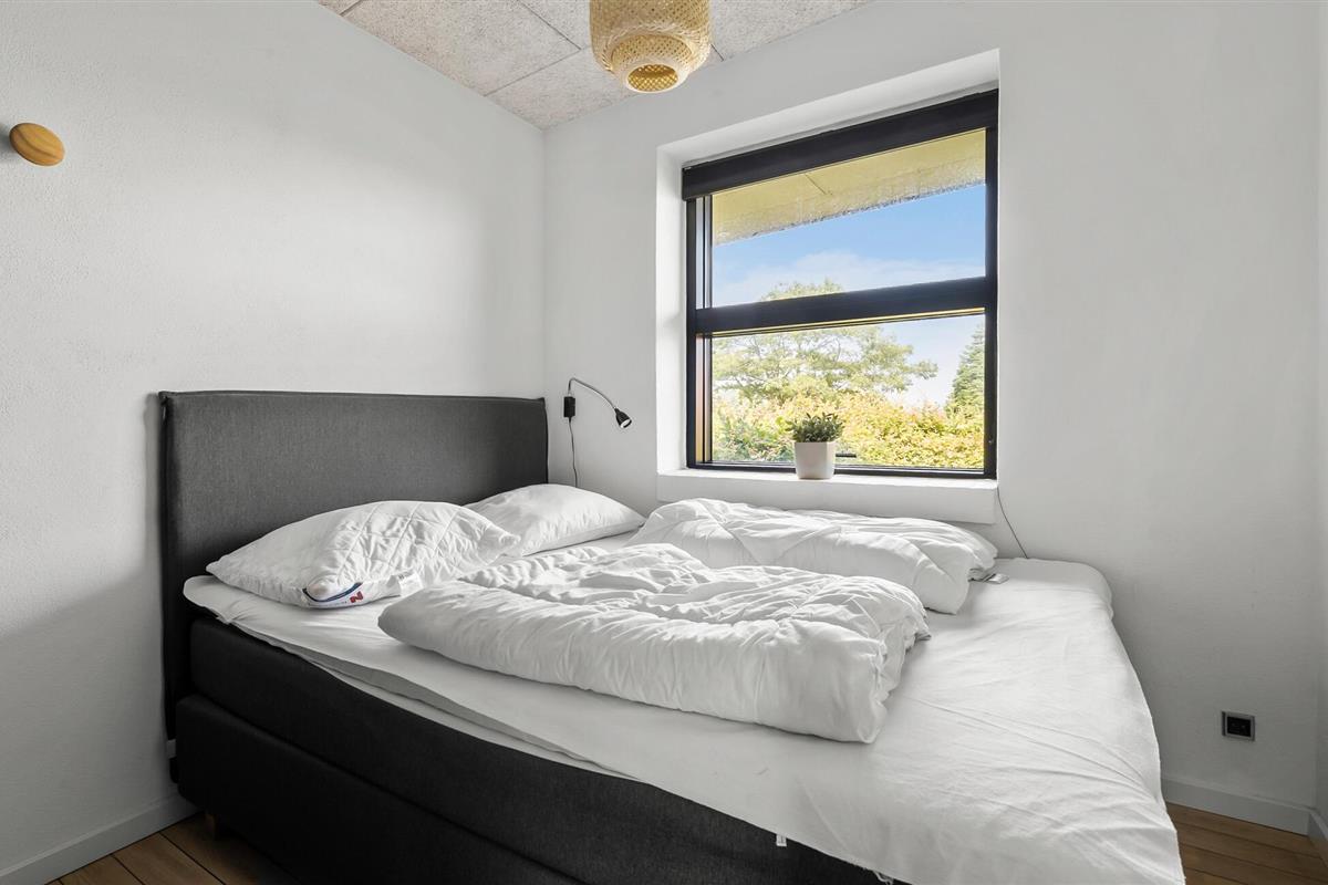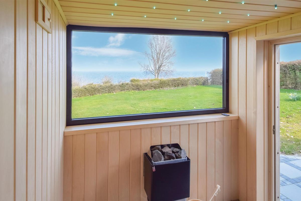 Vanuit het vakantiehuis en het terras met de palju kunt u genieten van het uitzicht op zee. Dit vakantiehuis is exclusief, zowel in de gebruikte materialen als in de manier waarop het is ingericht. Modern en stijlvol ingericht, biedt het een bijzondere setting voor zomerhuis hygge. Op de bovenste verdieping zijn er twee slaapkamers en een gastentoilet met wastafels, evenals een woonkamer met een panoramisch uitzicht op de ingang van de boten in Vejle Fjord. De keuken is elegant en goed uitgerust. Op de begane grond, die u bereikt via een steile trap met leuning, is de derde slaapkamer, met ruimte voor een dressoirbed, een grote badkamer met dubbele douche, massagebad en wasmachine. Er is ook een woonkamer met kussens voor de TV. Het terras ligt op het westen. De Palju staat alleen op een ander terras.