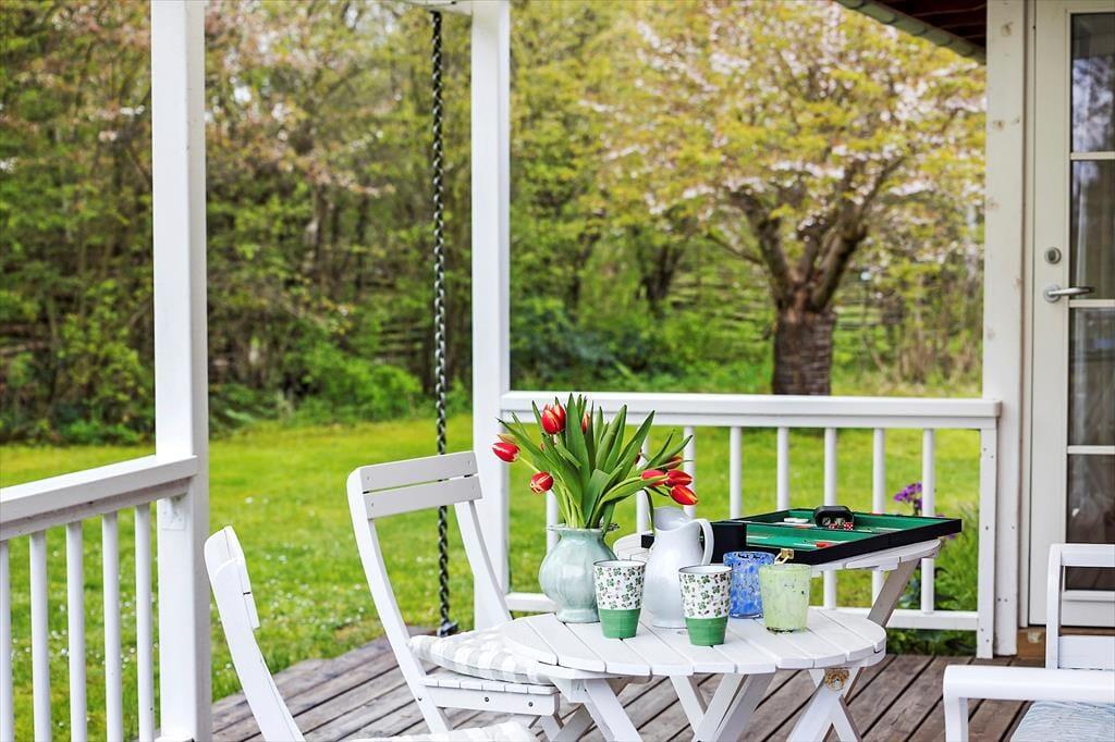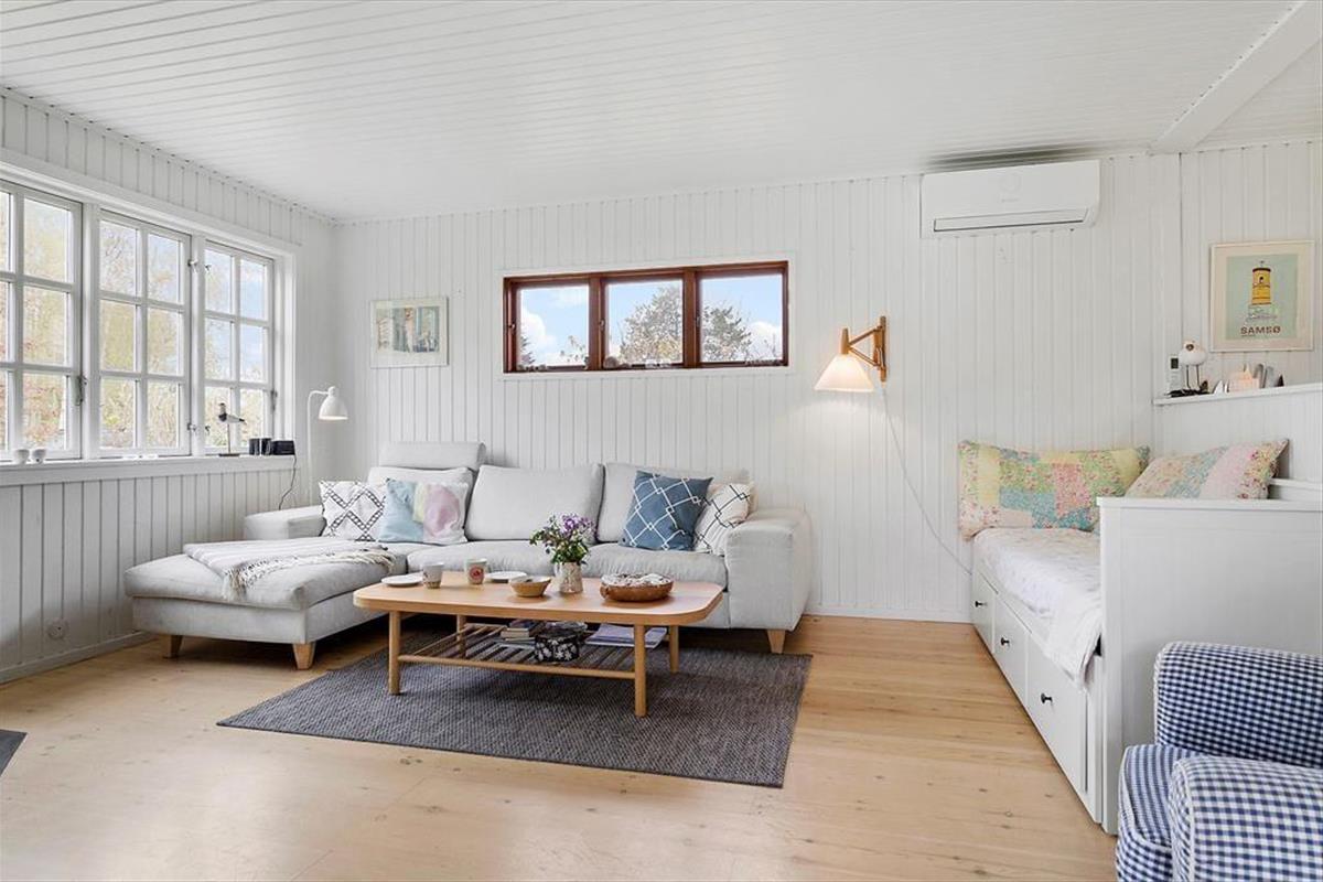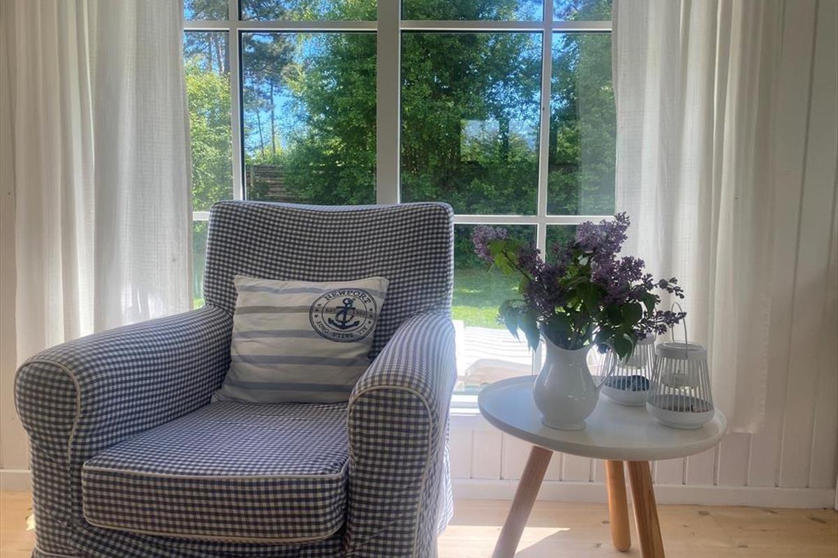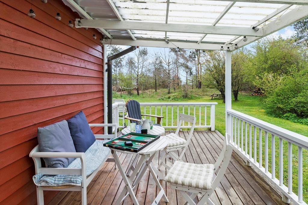 Bäume und Büsche ringsum sorgen dafür, dass du dich unter freiem Himmel gänzlich ungestört aufhältst. Hinter dem Haus begrüßt dich ein großer Garten, der zum Entspannen im Grünen einlädt. Ein kleiner Pfad führt dich vom Haus aus durch die Bäume und Büsche direkt bis an den nur 50 Meter entfernten Strand, an dem Pallettenmöbel für dich und deine Familie bereit stehen. Hier kannst du dich in Ruhe niederlassen, die Aussicht genießen und dabei deine badenden und spielenden Kinder im Auge behalten. Dieses Ferienhaus bietet dir die seltene Gelegenheit, ganz nah an einem der besten Badestrände Samsøs zu wohnen und zugleich völlig ungestörte Momente im grünen Garten zu verbringen. Vom Küchen- und Wohnbereich deines Hauses aus trittst du auf eine überdachte Terrasse, die sich wunderbar für gemeinsame Mahlzeiten im Grünen anbietet.