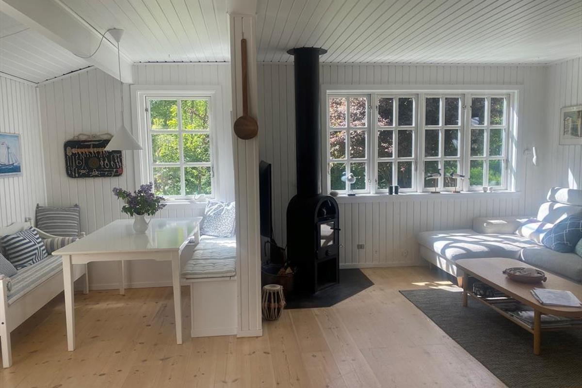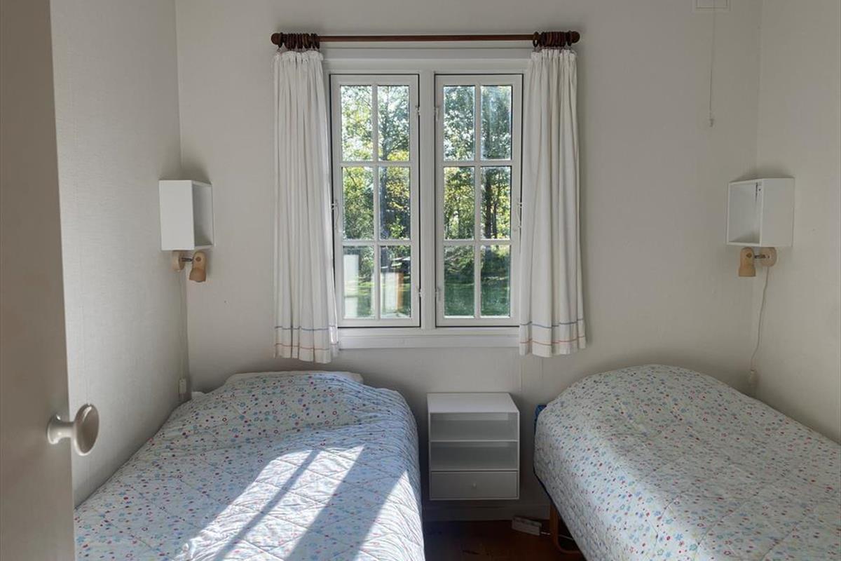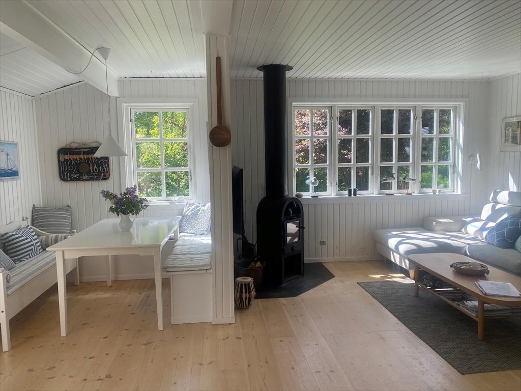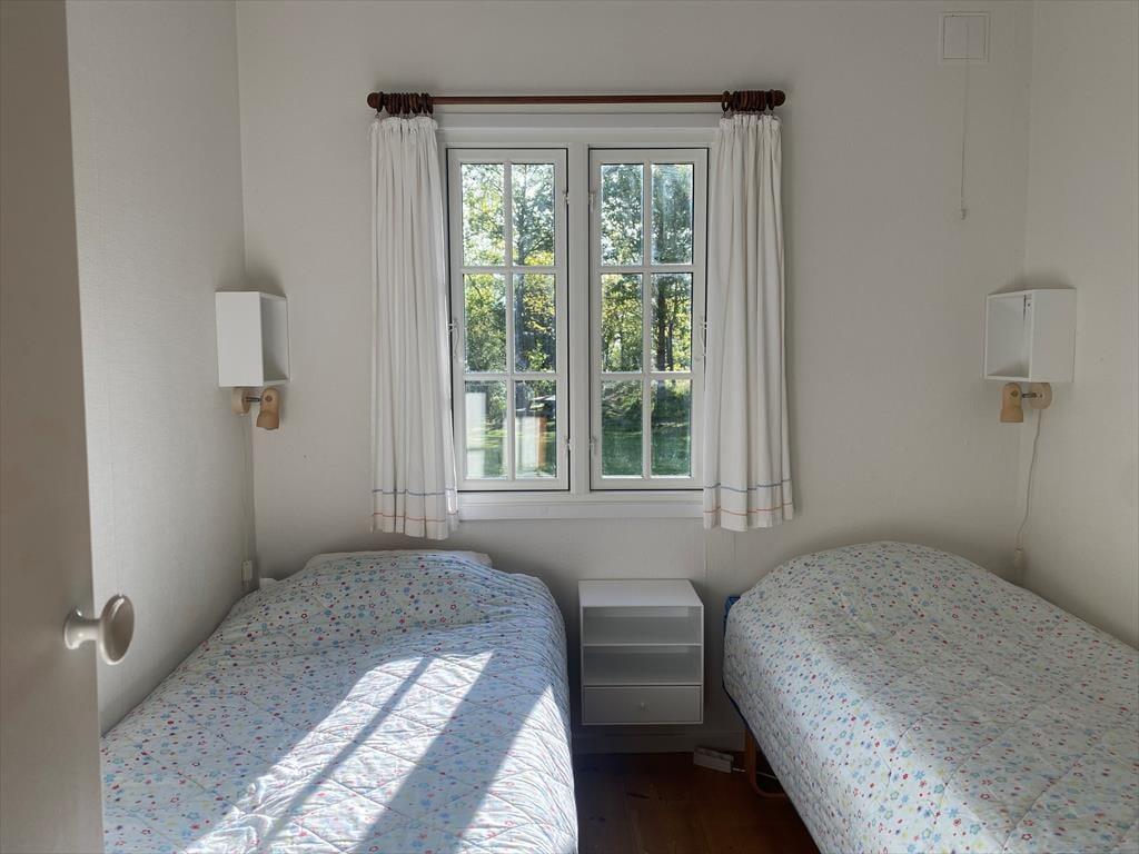 In der gemütlichen Polstersitzecke genießt du erholsame Momente mit einem guten Buch oder während eines kleinen Nickerchens. Für Unterhaltung und Abwechslung sorgt bei Bedarf der an der Wand hängende Fernseher. Behagliche Wärme und Stimmung garantiert der Kaminofen. Neben dem Sofa begrüßt dich der überaus ansprechende, richtig gemütliche Essplatz. Große Fenster lassen viel Licht durch den Raum strömen und verwöhnen zugleich mit gutem Ausblick in den grünen Garten. Einer der beiden Schlafräume empfängt dich mit einem Doppelbett. Im zweiten Raum stehen zwei Einzelbetten bereit. Die Zimmer bieten Aussicht in den Garten und in Richtung Meer. In den warmen Sommermonaten kannst du die Fenster einen Spalt weit offen stehen lassen und mit leisem Meeresrauschen in den Ohren einschlafen. Das Badezimmer ist klein, dafür aber hell und funktionell. Neben dem Badezimmer befindet sich ein kleiner Flur, der als Eingangsbereich fungiert.