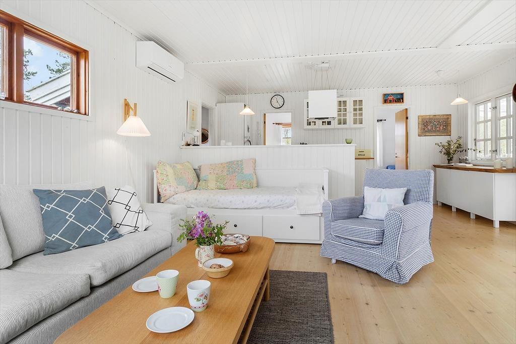 Das in hellen Farbtönen gehaltene Urlaubsdomizil ist der Inbegriff von Gemütlichkeit und klassisch dänischer Ferienhausstimmung. Herzstück des Hauses ist der offene Küchen- und Wohnbereich, in dem du mit deinen Lieben viele entspannte Stunden verlebst, die Mahlzeiten zubereitest und diese am Esstisch genießt. In der angenehm geräumigen Küche kreierst du köstliche Urlaubsmahlzeiten und genießt dabei die Nähe deiner Familienmitglieder, die sich auf dem Sofa oder rund um den Esstisch niedergelassen haben. Küche und Wohnraum präsentieren sich durch weg hell und einladend. Im Nu wirst du dich heimisch und wohl fühlen.