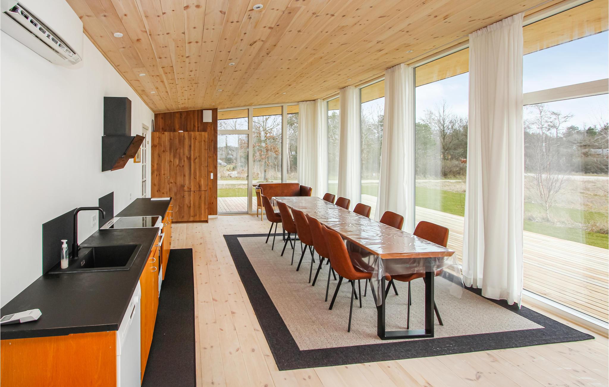 Stap binnen in de lichte kamers van dit huis, waar vakantieontspanning kinderspel is. In het ruime woongedeelte kijkt u aan alle kanten uit door grote ramen, en tegelijkertijd valt er veel daglicht naar binnen. Kook en eet hier samen in een stijlvolle ambiance en verheug u op gezellige avonden met het knapperende vlammenspel in de open haard. Geniet van heerlijke uren buiten op het terras en zie uw kinderen ravotten op de trampoline.