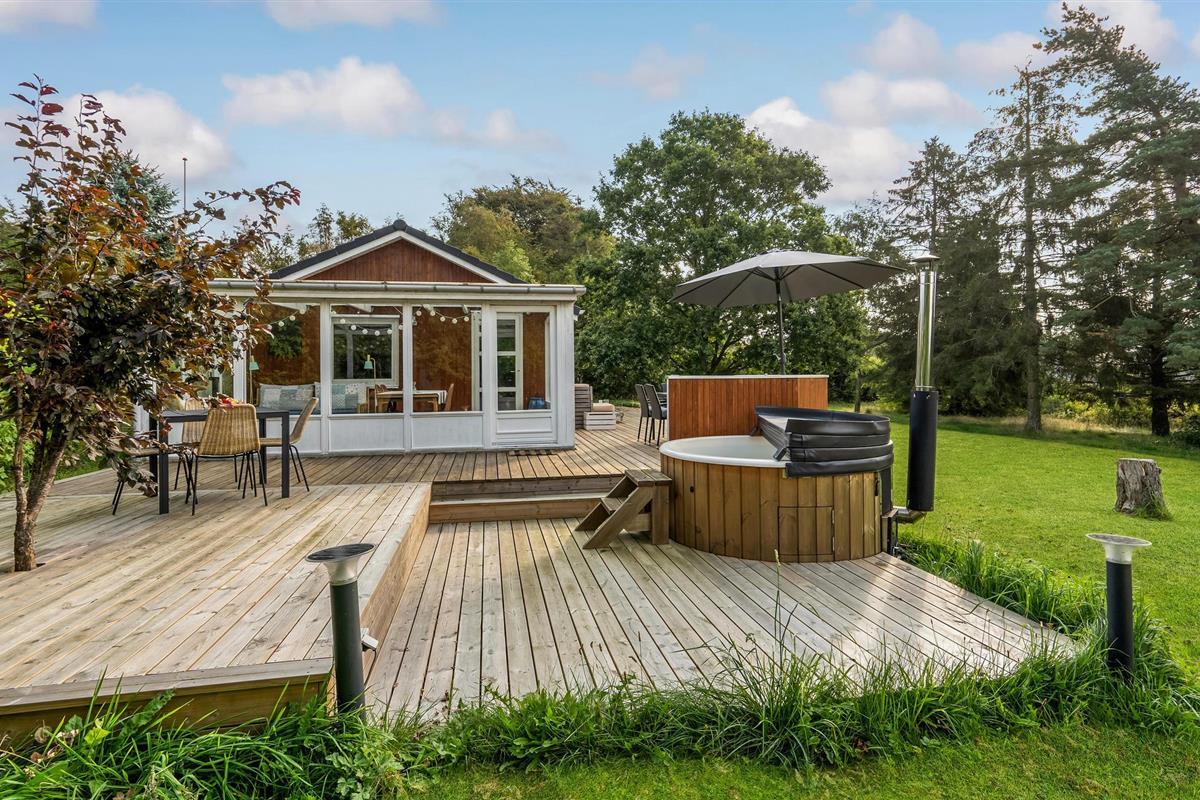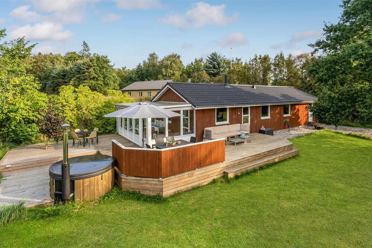 Ontdek dit sfeervolle vakantiehuis met groot terras en Fins houten bad nabij Mariager Fjord.