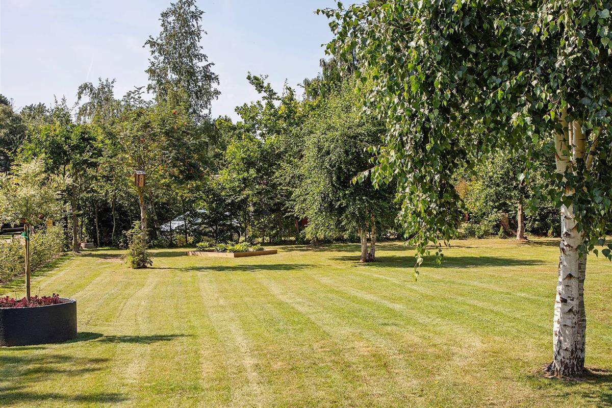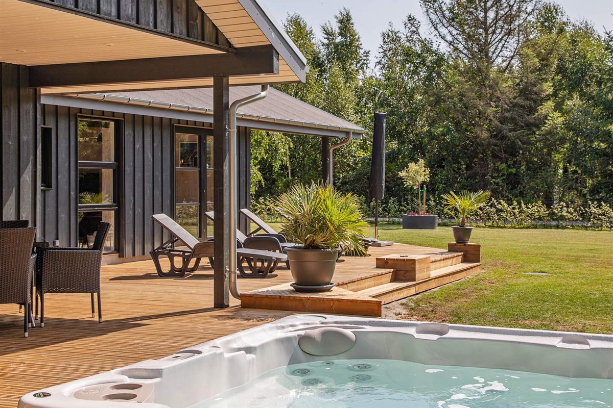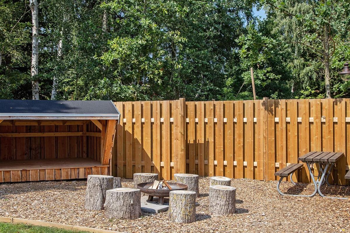 Auf dem Naturgrundstück findet man den großen Außen-Whirlpool für bis zu fünf Personen und eine praktische Außendusche, zudem ein Shelter sowie eine Feuerstelle für ein Lagerfeuer. Die Sauna ist in einem Nebengebäude untergebracht.