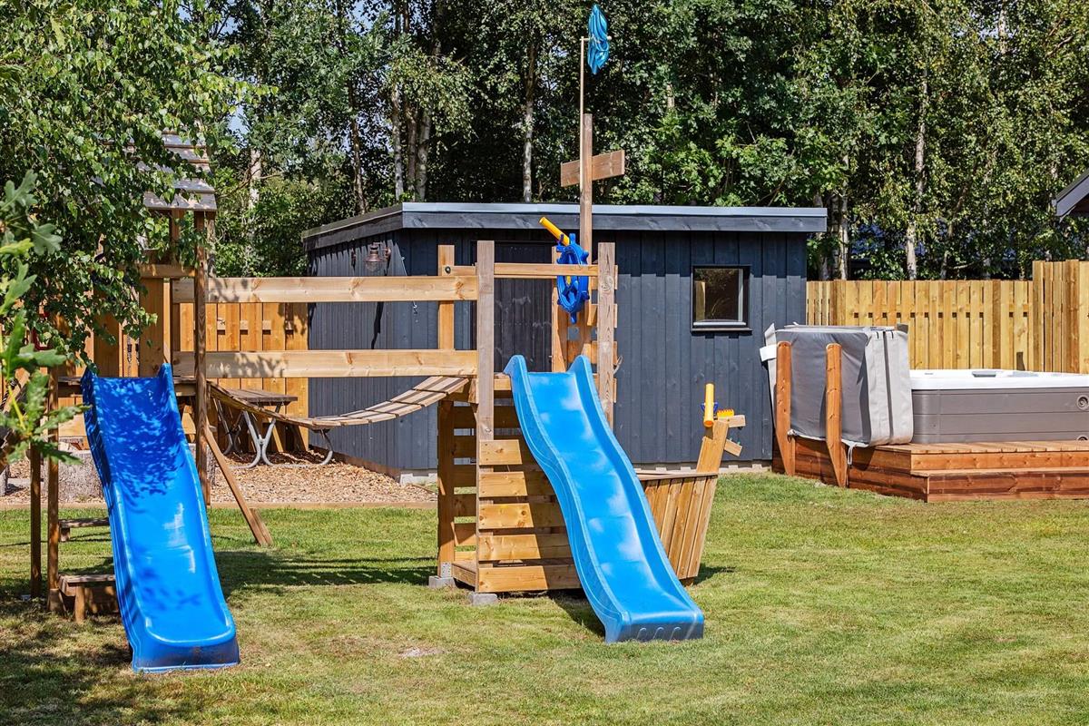 Im Außenbereich findet man eine große, teils überdachte Terrassenfläche, ideal für Sonnentage und Grillabende. Kleinkinder freuen sich bestimmt über den Kletterturm mit Hängebrücke, Schaukeln und die Rutsche.