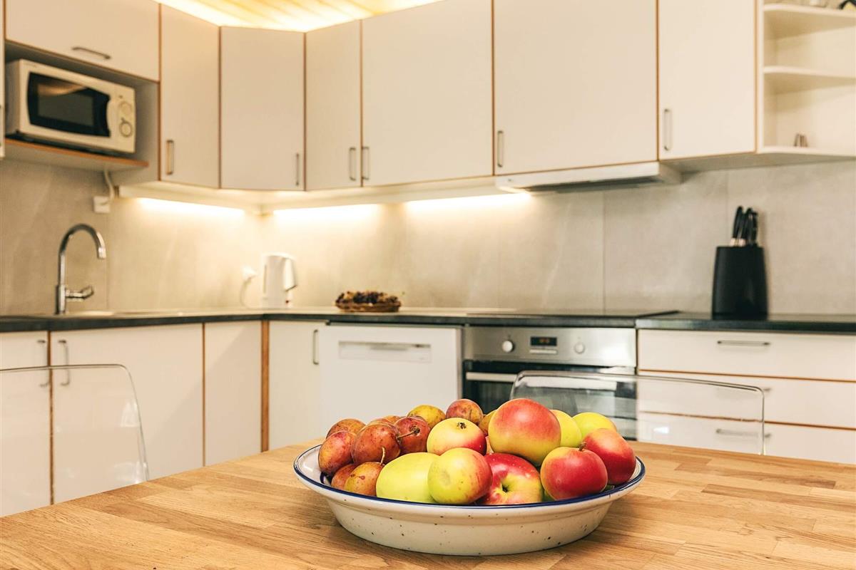 Der offene Wohnbereich umfasst eine voll ausgestattete Küche mit Elektroherd, Kühl- und Gefrierschrank, Mikrowelle und Geschirrspüler, ideal für die Zubereitung von Familienmahlzeiten. Der angrenzende Essbereich und das Wohnzimmer mit einem Holzofen und einer Wärmepumpe schaffen eine warme und einladende Atmosphäre.