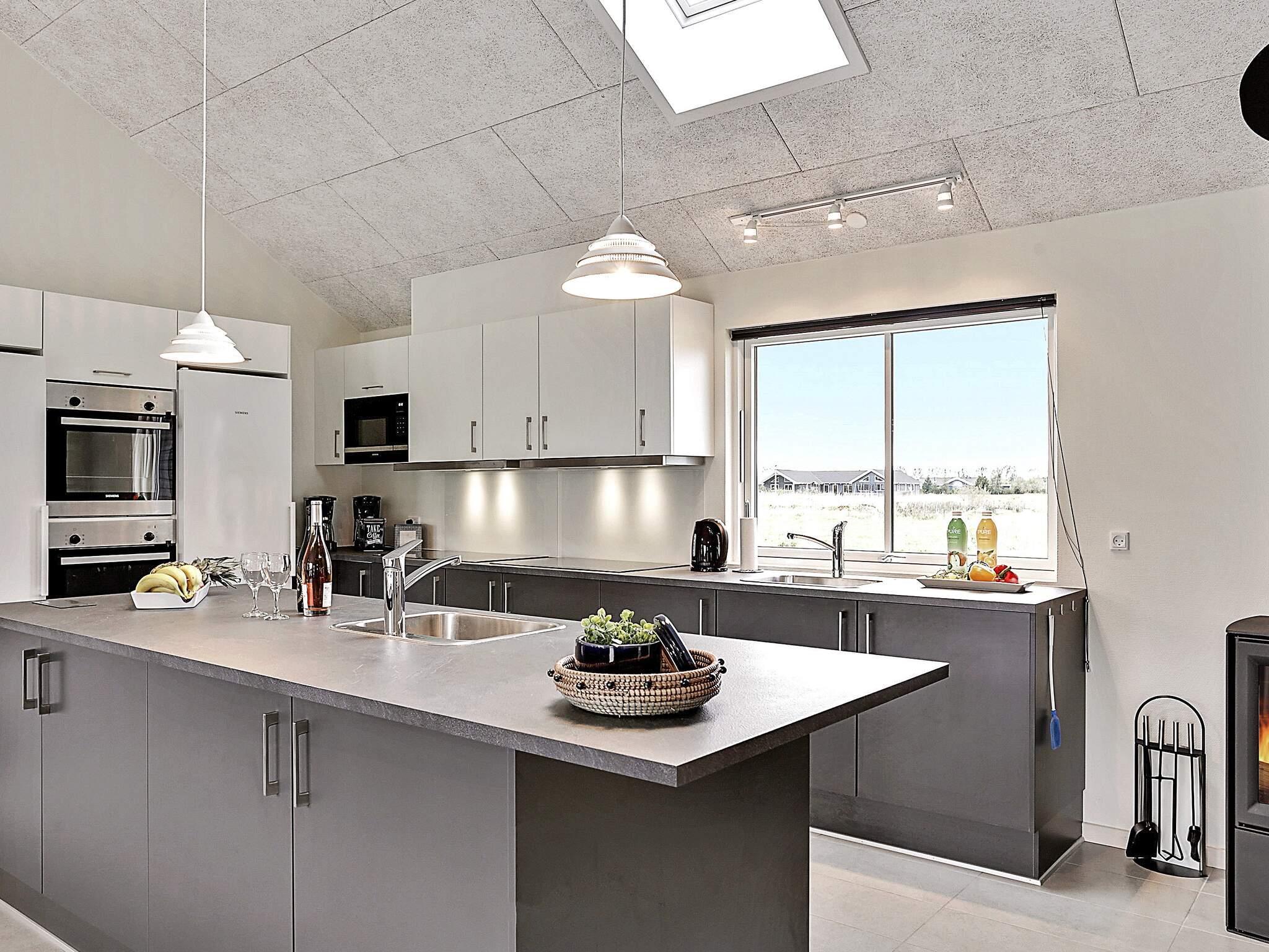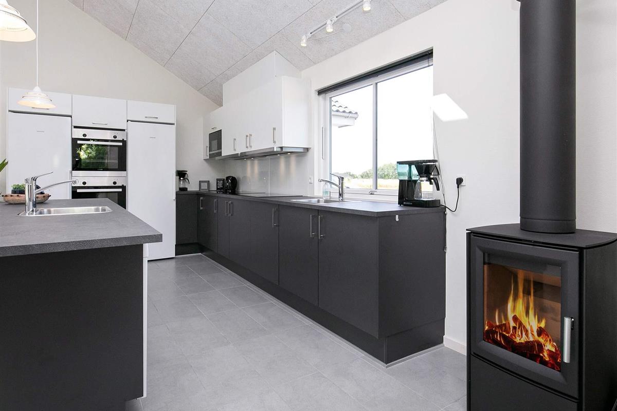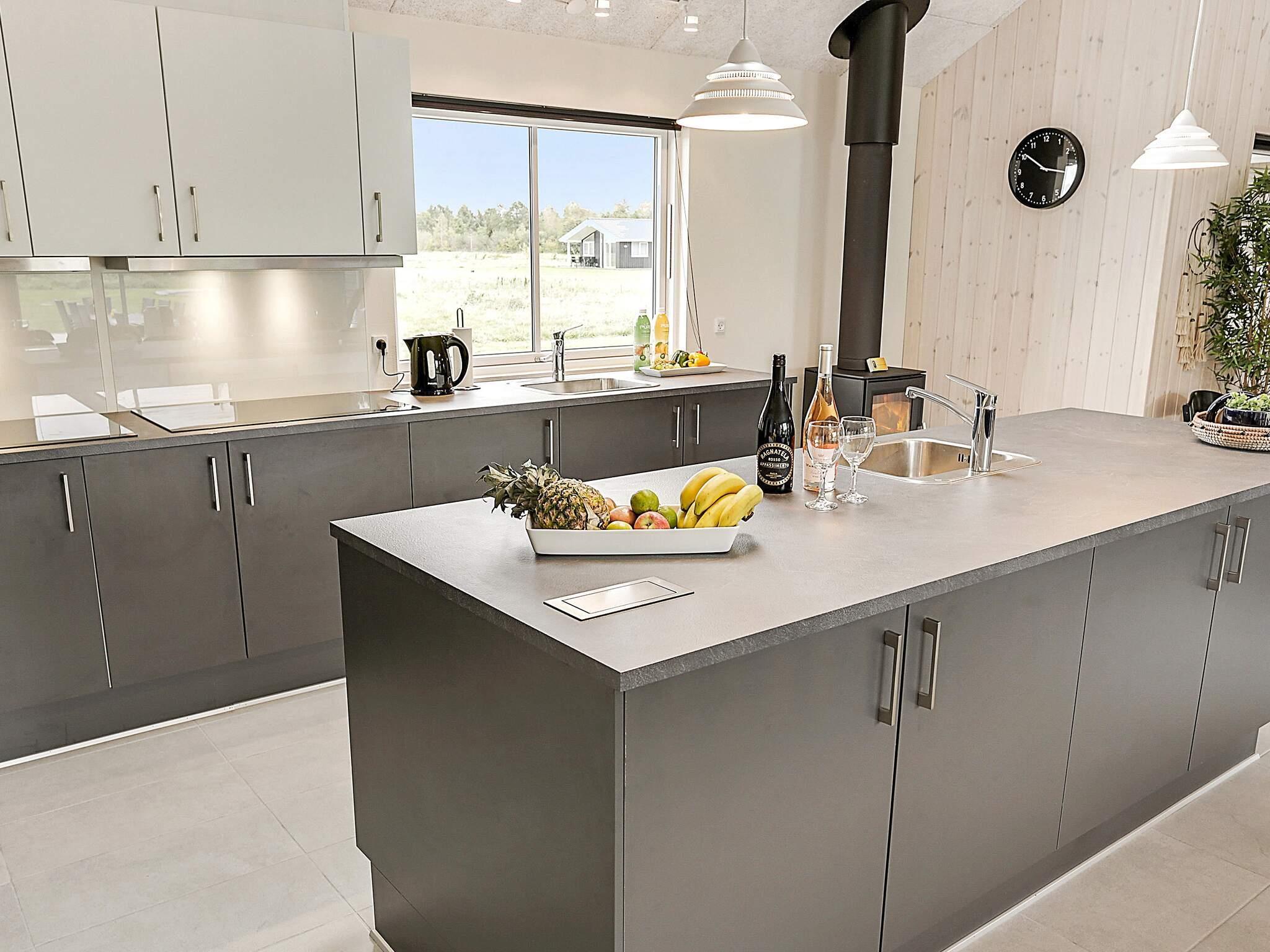Die große Küche des Ferienhauses ist in vielerlei Hinsicht doppelt ausgestattet: es gibt jeweils zwei Backöfen, Herde, Waschbecken, Spülmaschinen und Kühlkapazitäten, sodass das Kochen und die anschließende Hausarbeit zügig erledigt werden können. Die Küche ist offen in den Wohnbereich integriert und dort steht außer einem langen Esstisch für die gesammelte Mannschaft auch eine gemütliche Sitzecke bereit. Ein Holzofen sorgt an kühleren Abenden für wohlige Wärme.