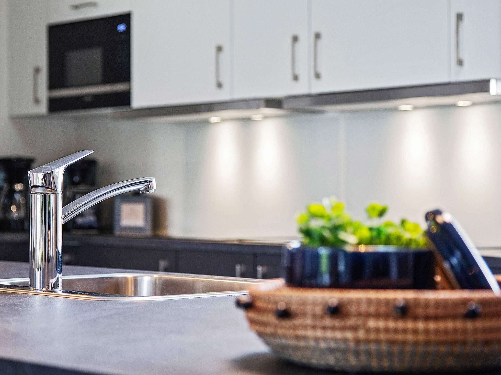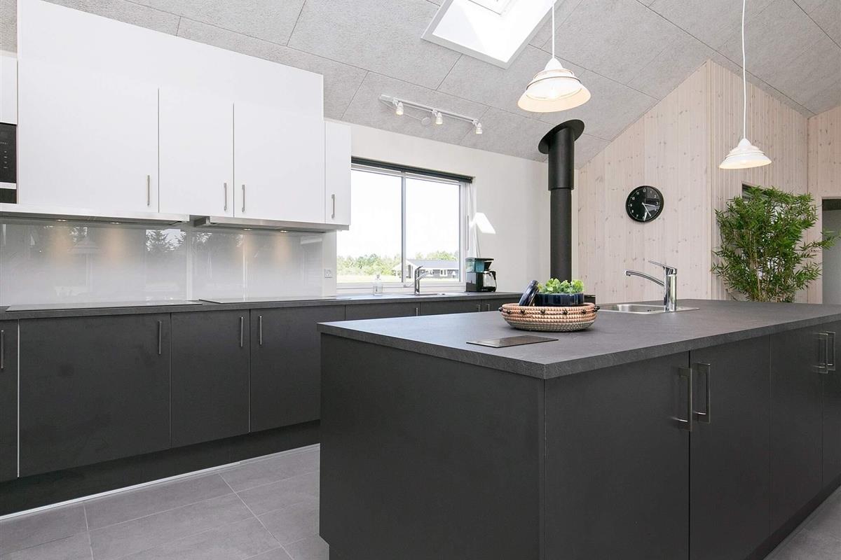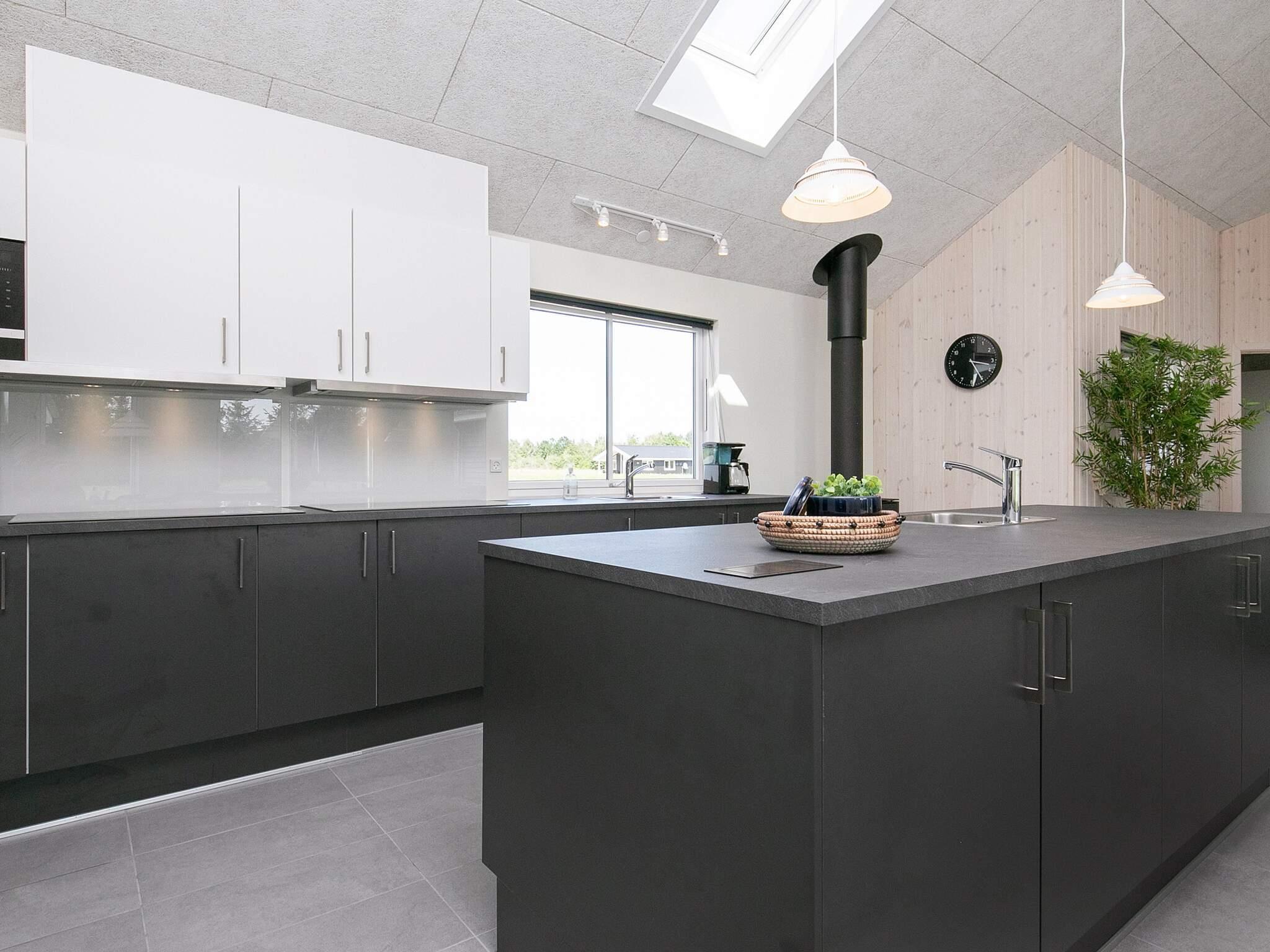 Die große Küche des Ferienhauses ist in vielerlei Hinsicht doppelt ausgestattet: es gibt jeweils zwei Backöfen, Herde, Waschbecken, Spülmaschinen und Kühlkapazitäten, sodass das Kochen und die anschließende Hausarbeit zügig erledigt werden können. Die Küche ist offen in den Wohnbereich integriert und dort steht außer einem langen Esstisch für die gesammelte Mannschaft auch eine gemütliche Sitzecke bereit. Ein Holzofen sorgt an kühleren Abenden für wohlige Wärme.
