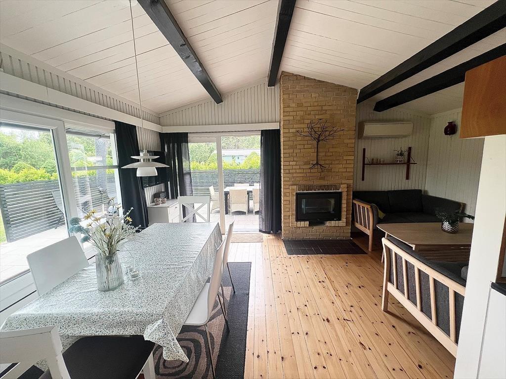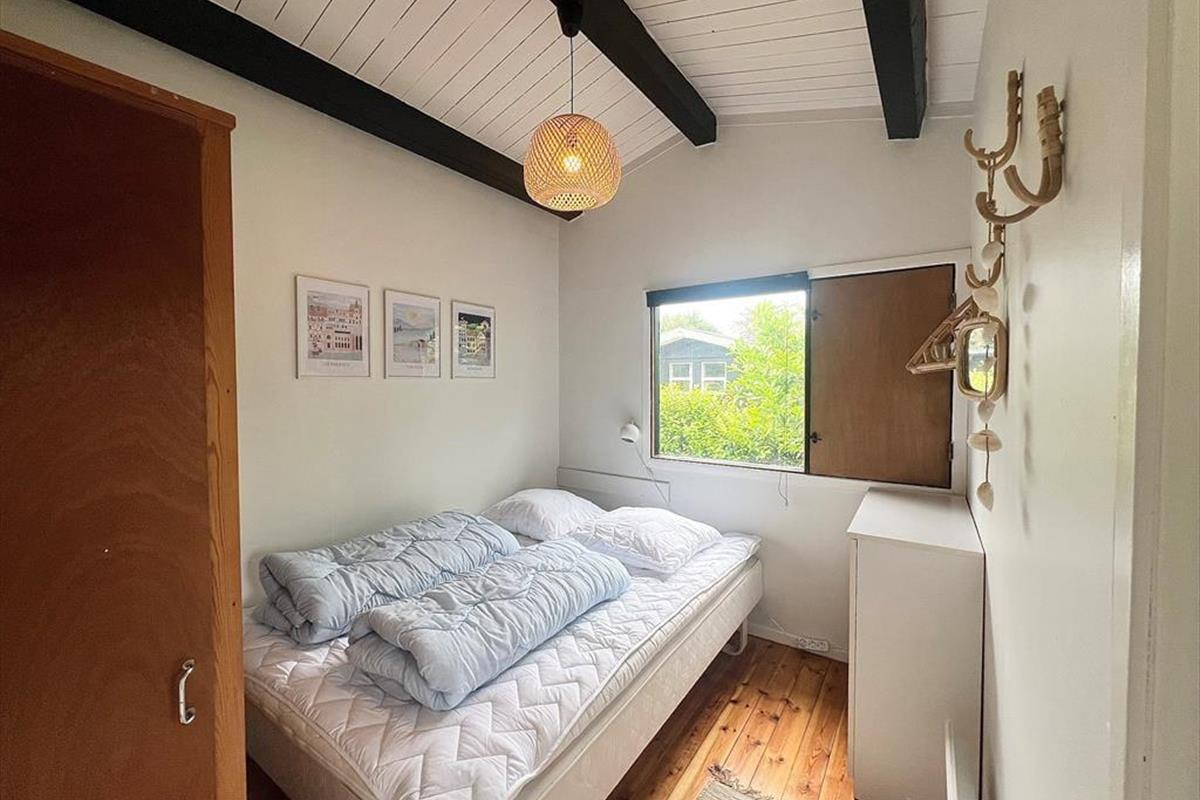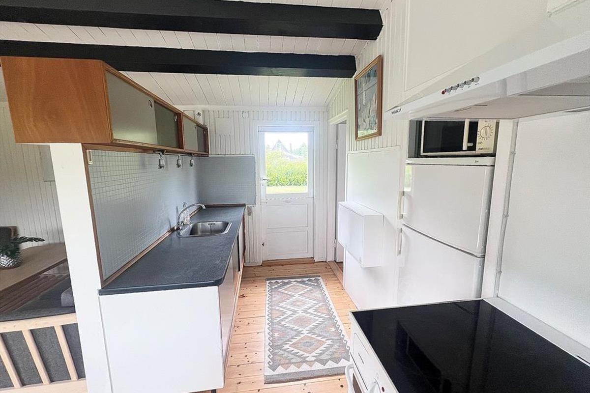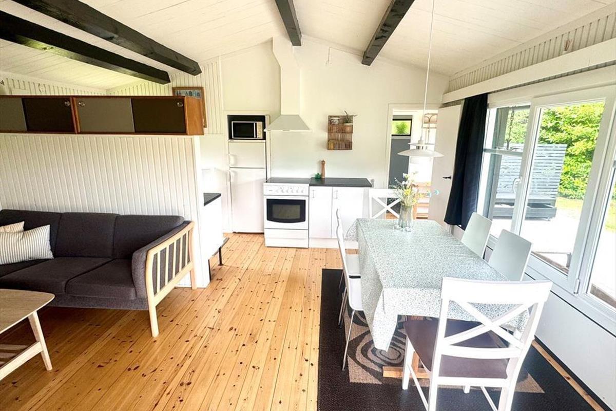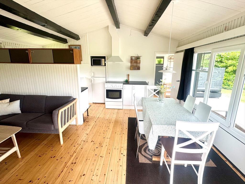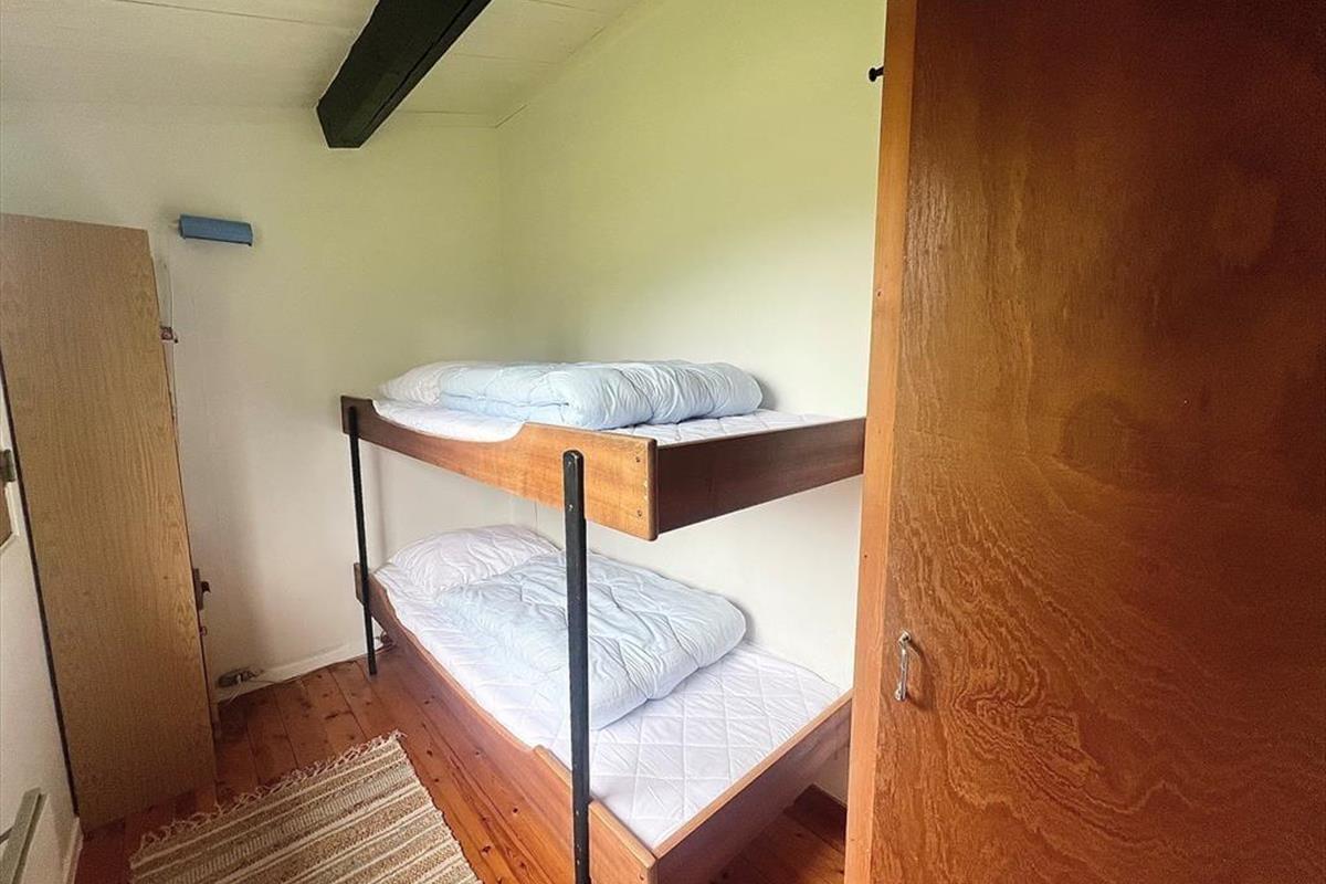 Das Ferienhaus verfügt über: Eingangsbereich, Badezimmer mit WC und Dusche, zwei gemütliche Schlafzimmer mit einem Doppelbett in einem und einem Etagenbett im anderen Schlafzimmer. Darüber hinaus gibt es eine offene Küche mit Essbereich und Sofaecke. Das Wohnzimmer verfügt über einen Holzofen und Zugang zur schönen Terrasse des Ferienhauses.