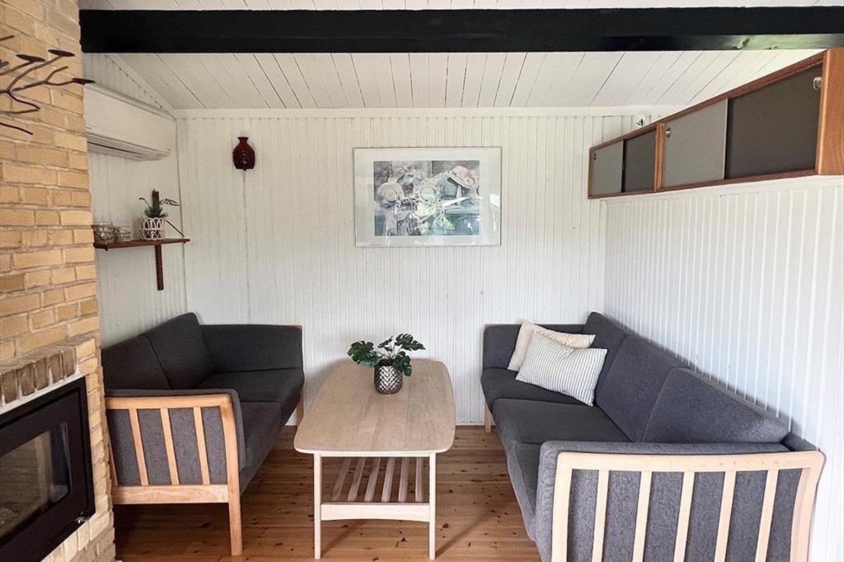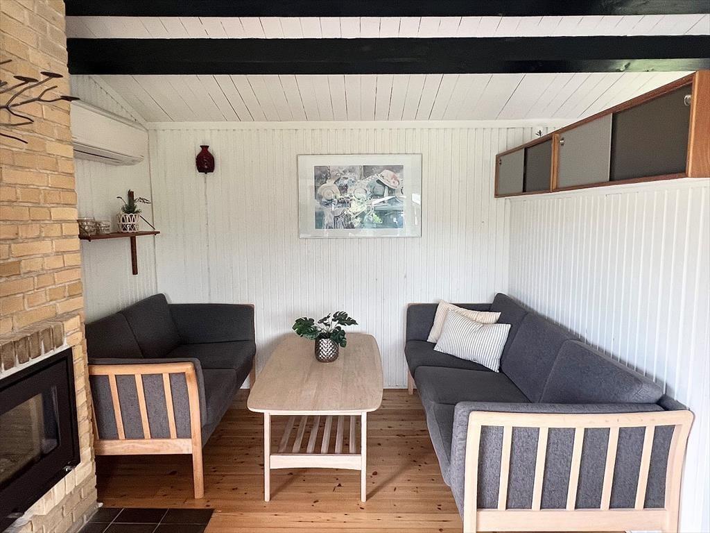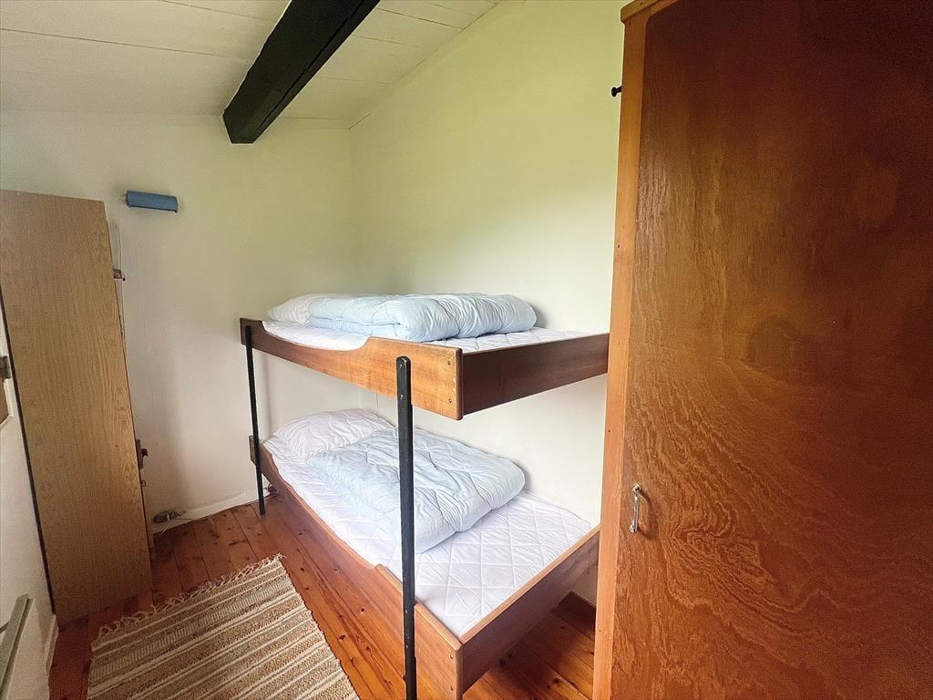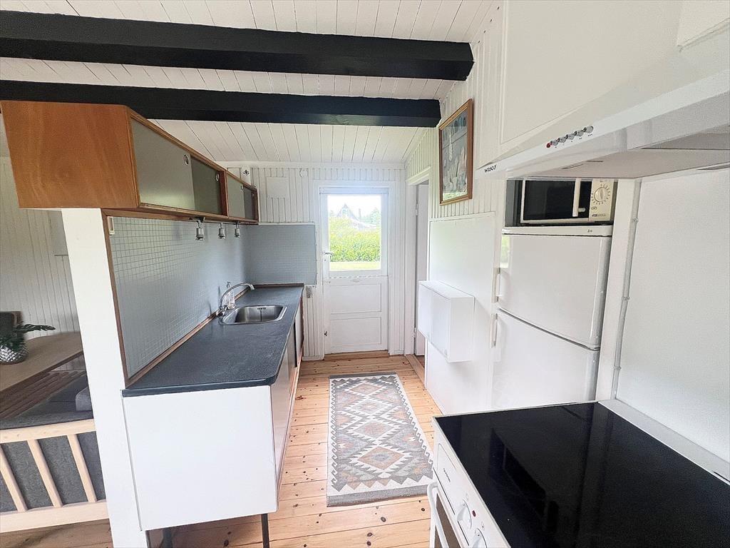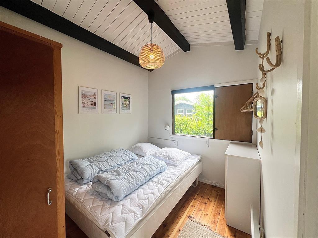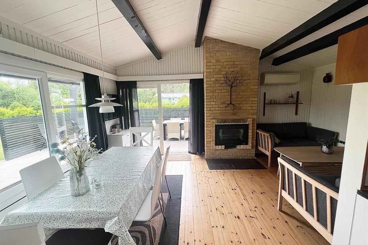 Das Ferienhaus verfügt über: Eingangsbereich, Badezimmer mit WC und Dusche, zwei gemütliche Schlafzimmer mit einem Doppelbett in einem und einem Etagenbett im anderen Schlafzimmer. Darüber hinaus gibt es eine offene Küche mit Essbereich und Sofaecke. Das Wohnzimmer verfügt über einen Holzofen und Zugang zur schönen Terrasse des Ferienhauses.