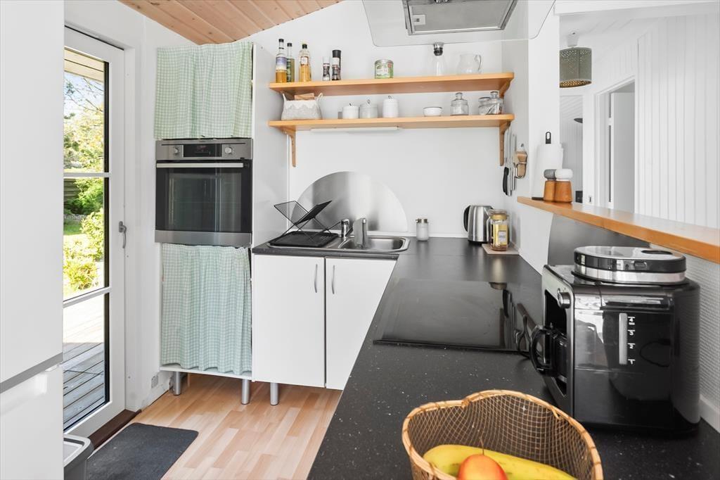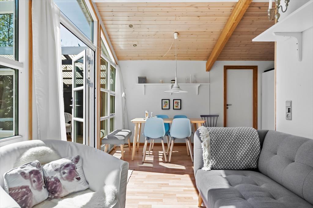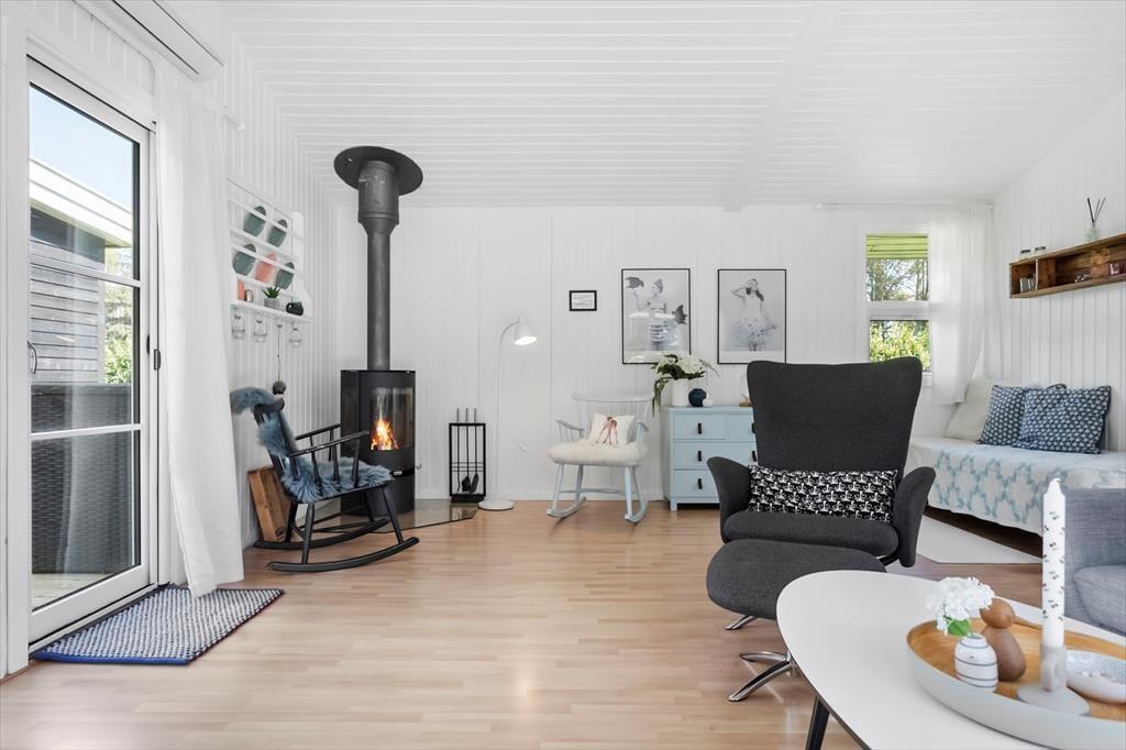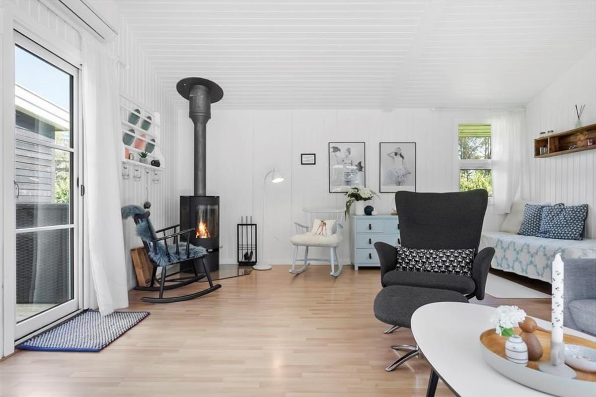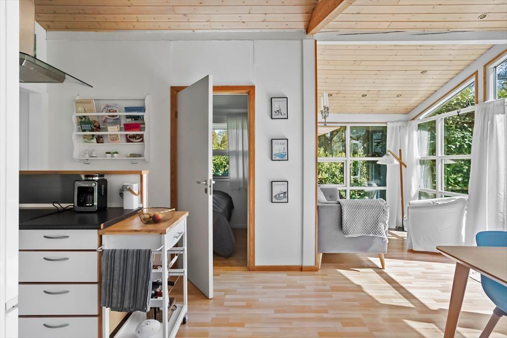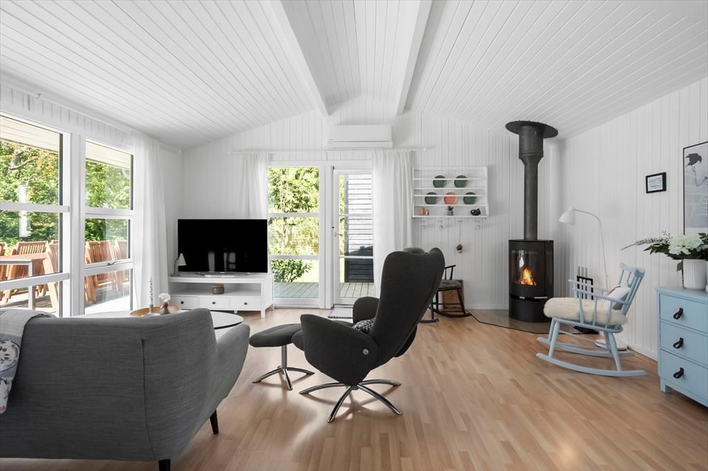Das Sommerhaus bietet eine Eingangshalle mit Zugang zur offenen Küche des Hauses. Hier gibt es einen Essbereich und eine gemütliche Ecke. Von hier aus gelangt man auf die wunderschönen Terrassen des Hauses. Darüber hinaus bietet das Haus ein großes, schönes Wohnzimmer mit einem Holzofen, 2 gute Schlafzimmer mit einem Doppelbett in einem Schlafzimmer und einem Etagenbett im anderen Schlafzimmer. Vom Wohnzimmer aus hat man Zugang zur Terrasse und zum Anbau des Hauses. Der Anbau verfügt über 2 Schlafplätze mit 2 Einzelbetten. Schließlich bietet das Cottage ein Badezimmer mit Toilette, Dusche und Waschbecken.