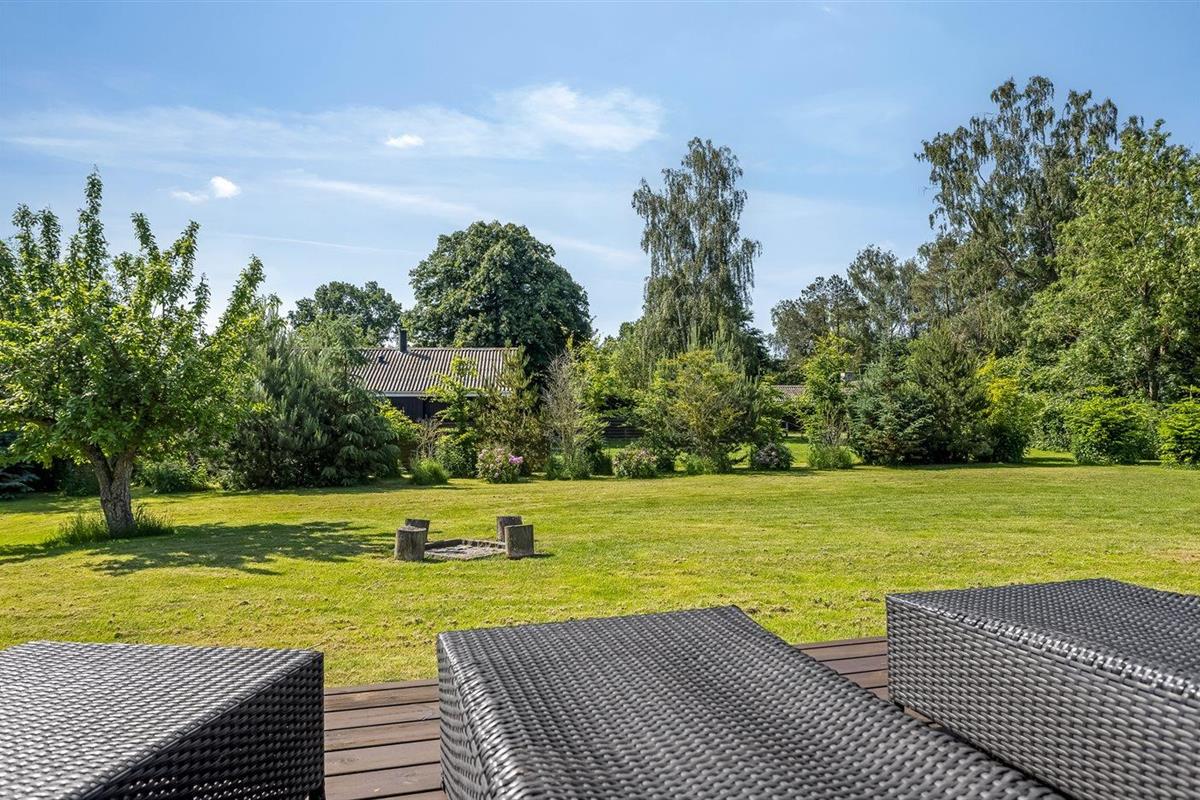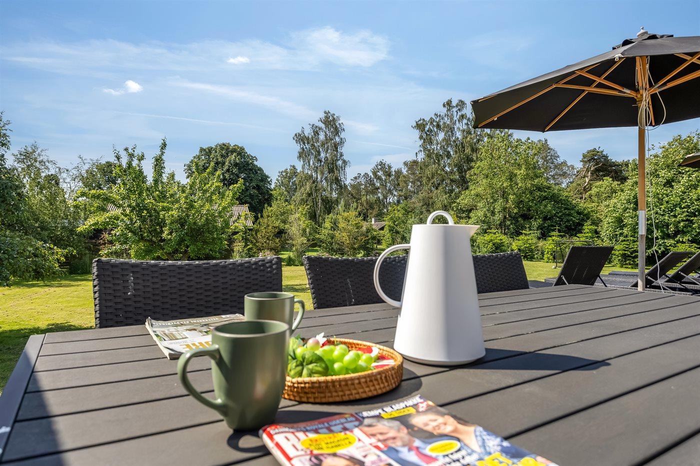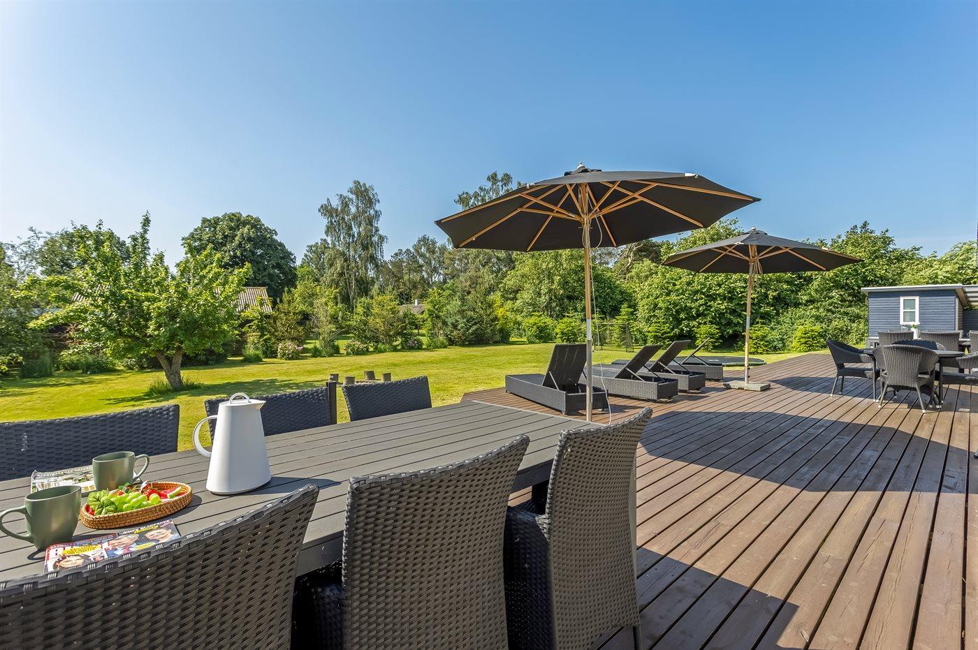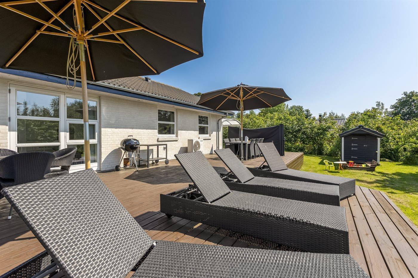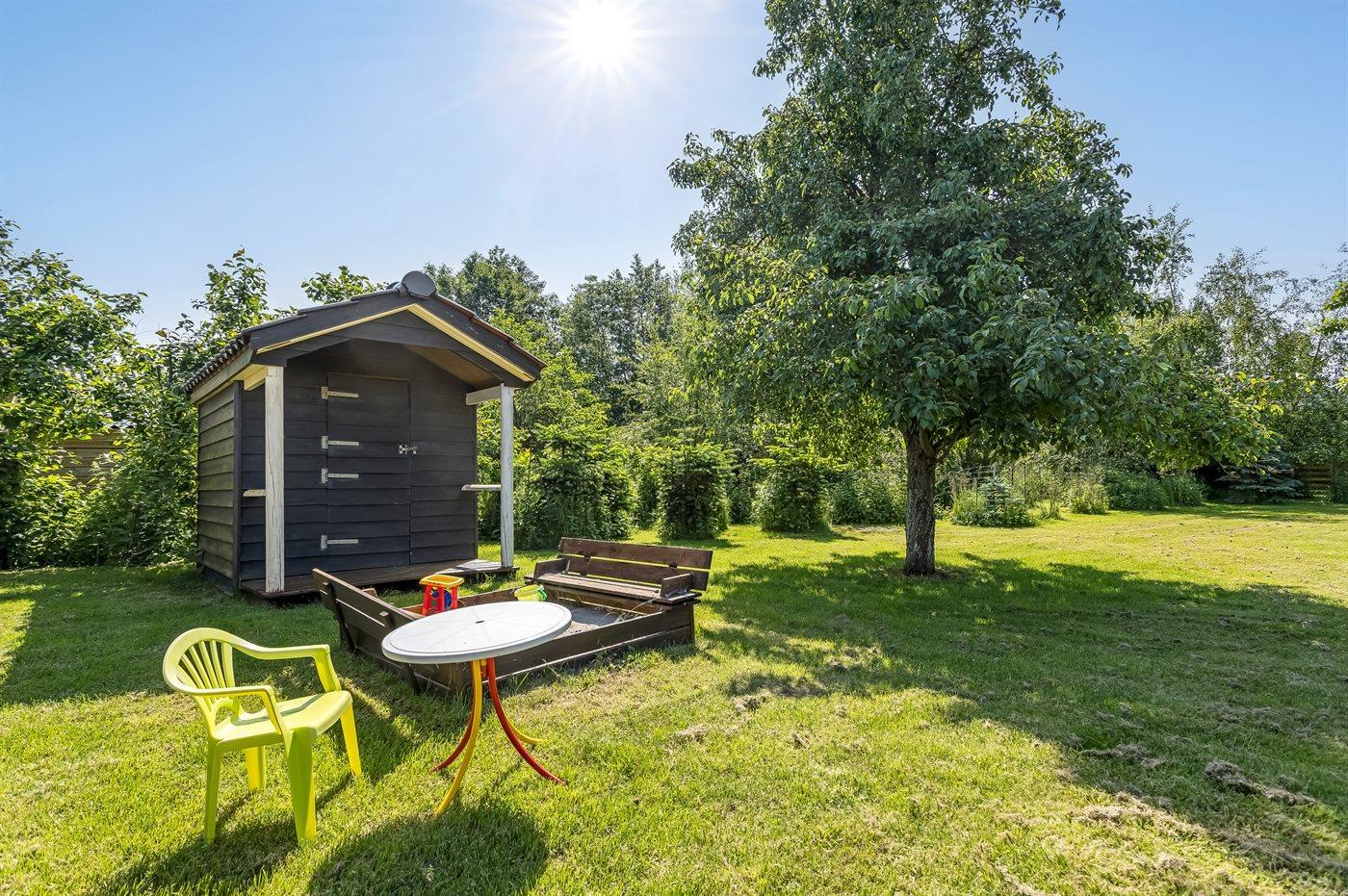 De vakantiewoning is gelegen op een 1900 m² groot aangelegde tuin. Afstand tot de zee 200 m. Dichtstbijzijnde winkel 100 m. Er is een golfbaan op een afstand van 2000 m. Bij de vakantiewoning hoort 100 m² terras. Zandbak. Speelhuisje. Trampoline. Voetbaldoel. Afstand tot speelplaats 100 m.Vuurplaats. Barbecue. Carport ter beschikking. Parkeerplaats bij het huis.