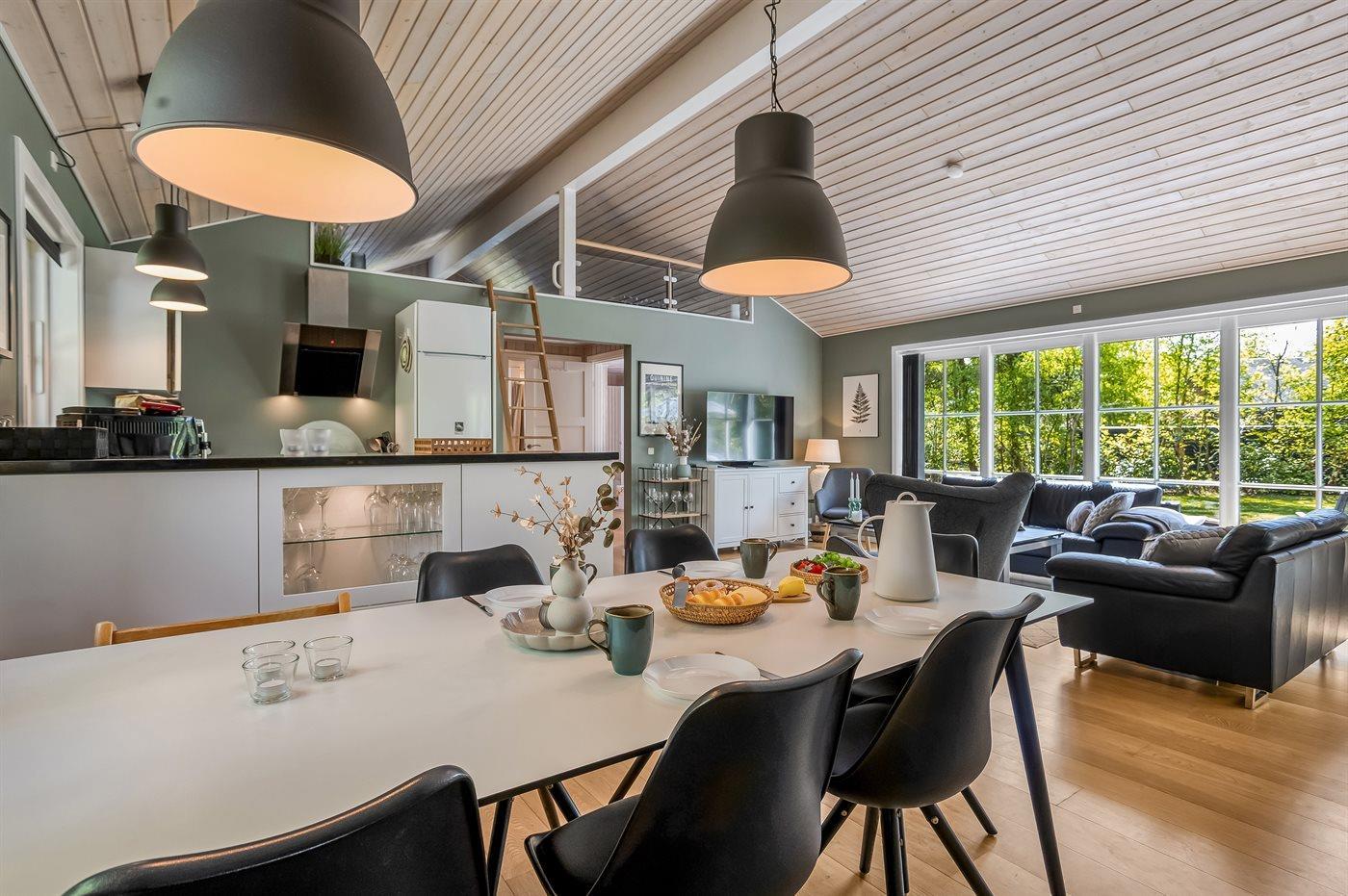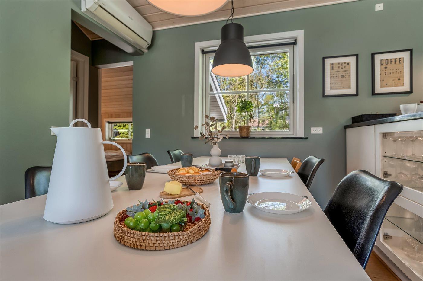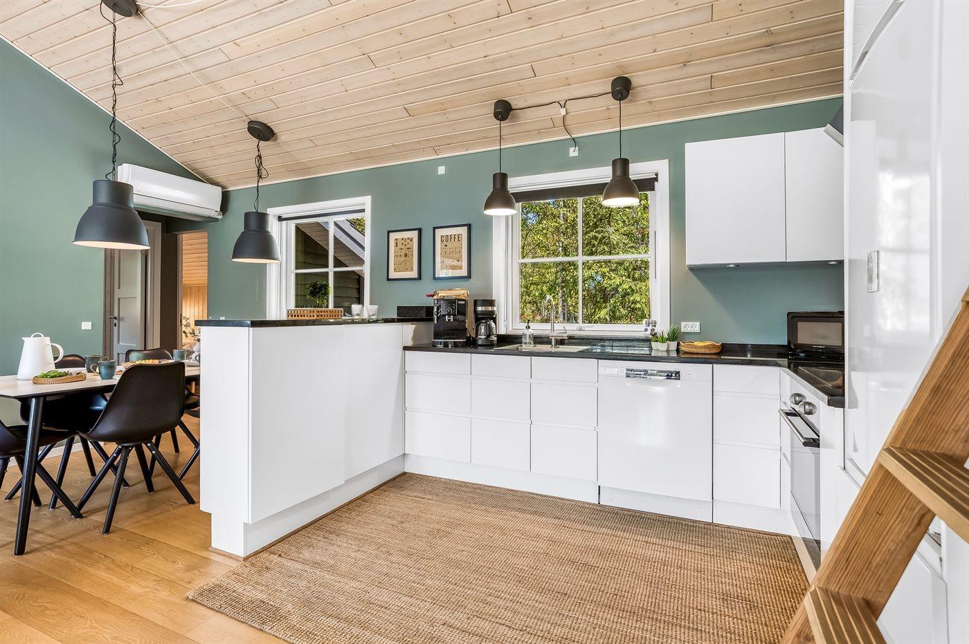 De keuken is uitgerust met koelkast Er zijn 4 keramische kookplaten, heteluchtoven, magnetron, Airfryer en vaatwasser.