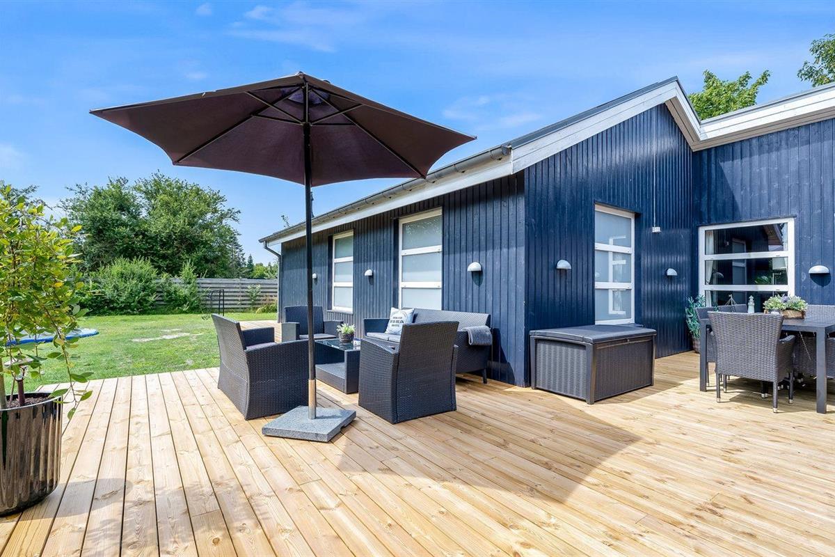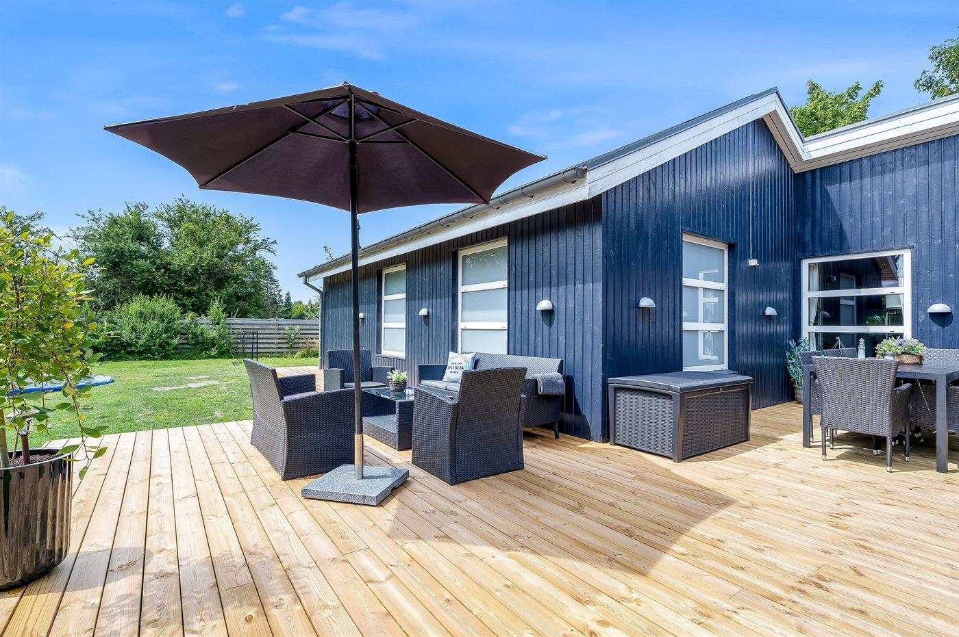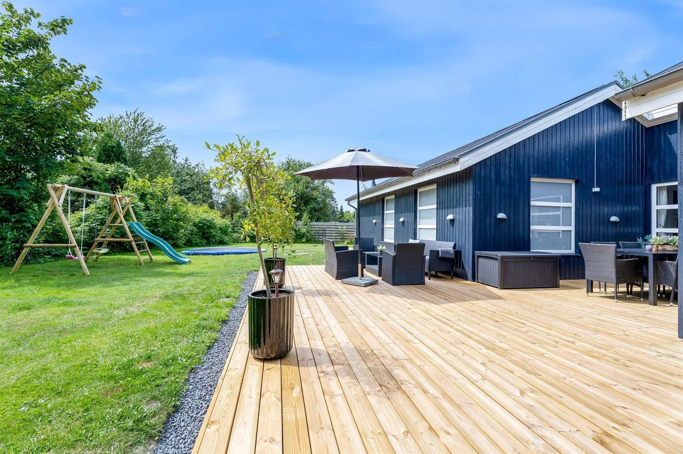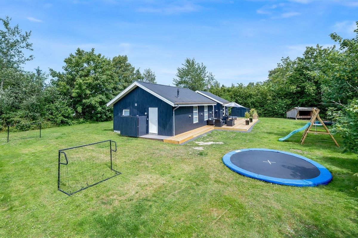 De vakantiewoning is gelegen op een 1186 m² groot aangelegde tuin. De grond is omheind. Afstand tot de zee 800 m. Dichtstbijzijnde winkel 1200 m. Er is een golfbaan op een afstand van 3000 m. Bij de vakantiewoning hoort terras. Daarnaast is er een overdekt terras. Gereedschapsruimte. Schommel. Zandbak. Trampoline. Voetbaldoel.Vuurplaats. Shelter. 2 Barbecues. Er zijn 2 bolgrills beschikbaar. Parkeerplaats bij het huis.