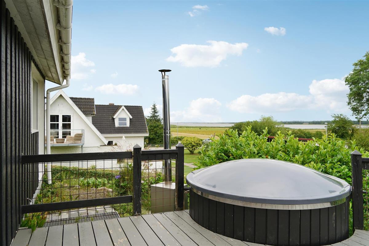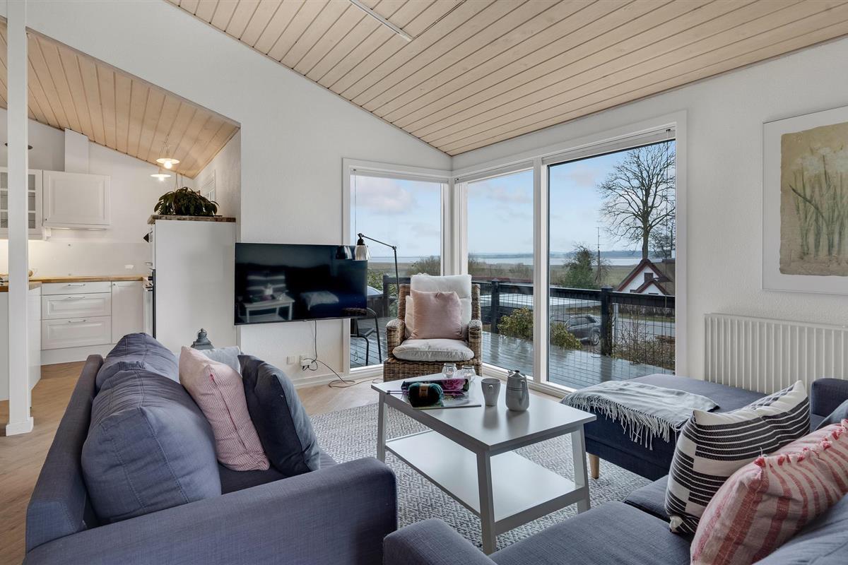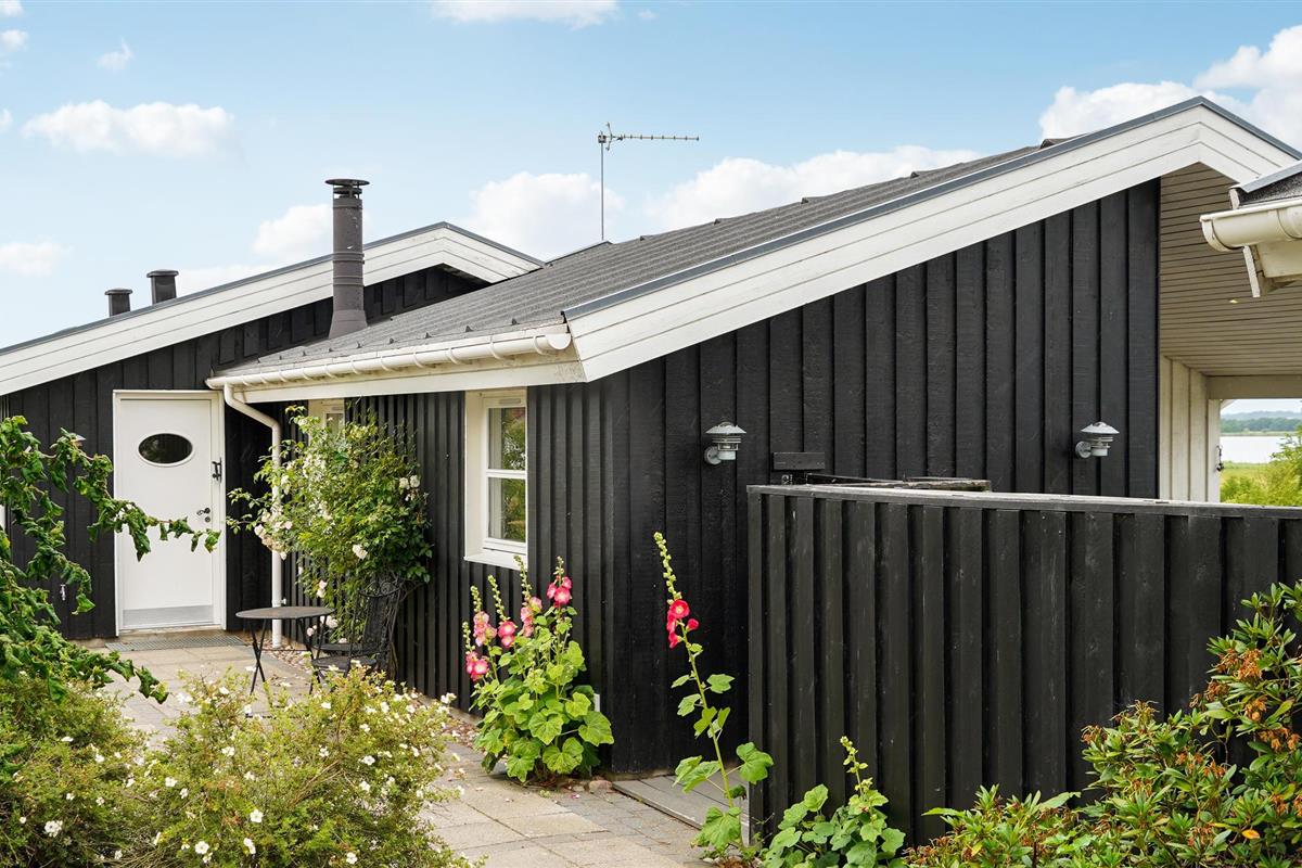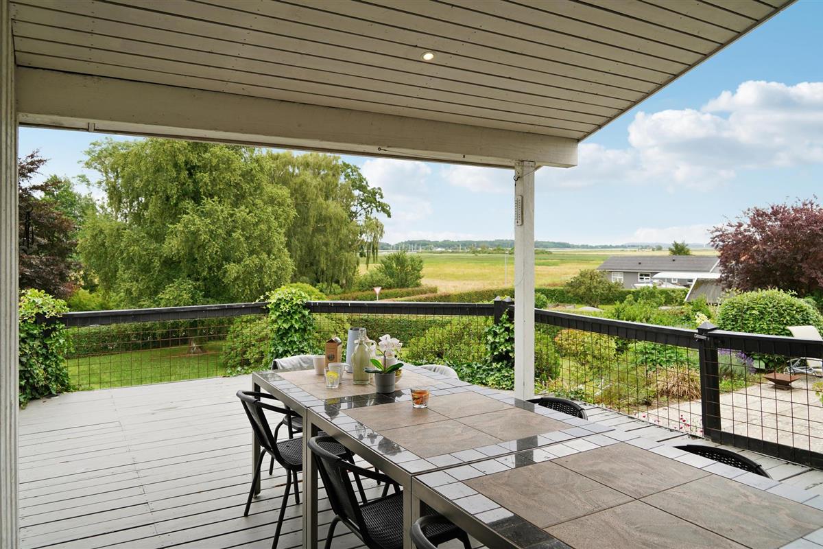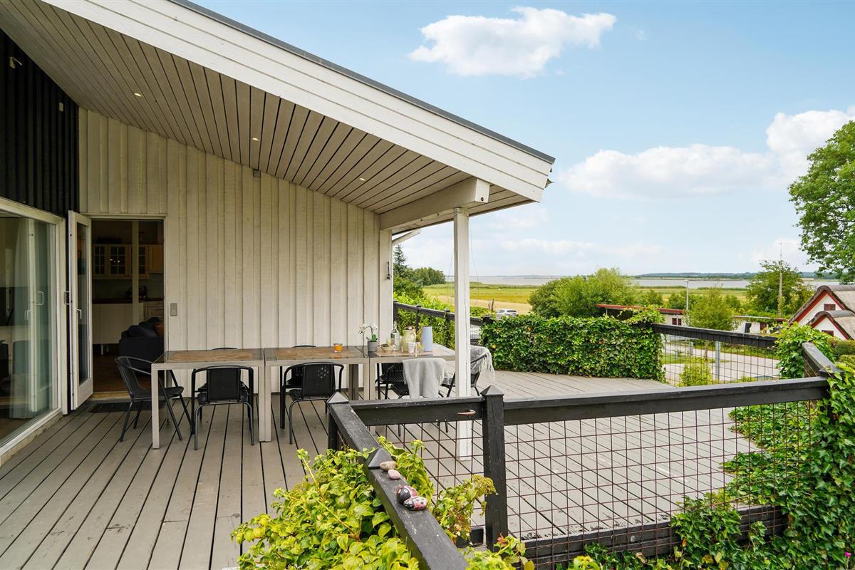 Geniet van een charmant houten vakantiehuis met prachtig uitzicht op Randers Fjord en een groot deels overdekt terras.