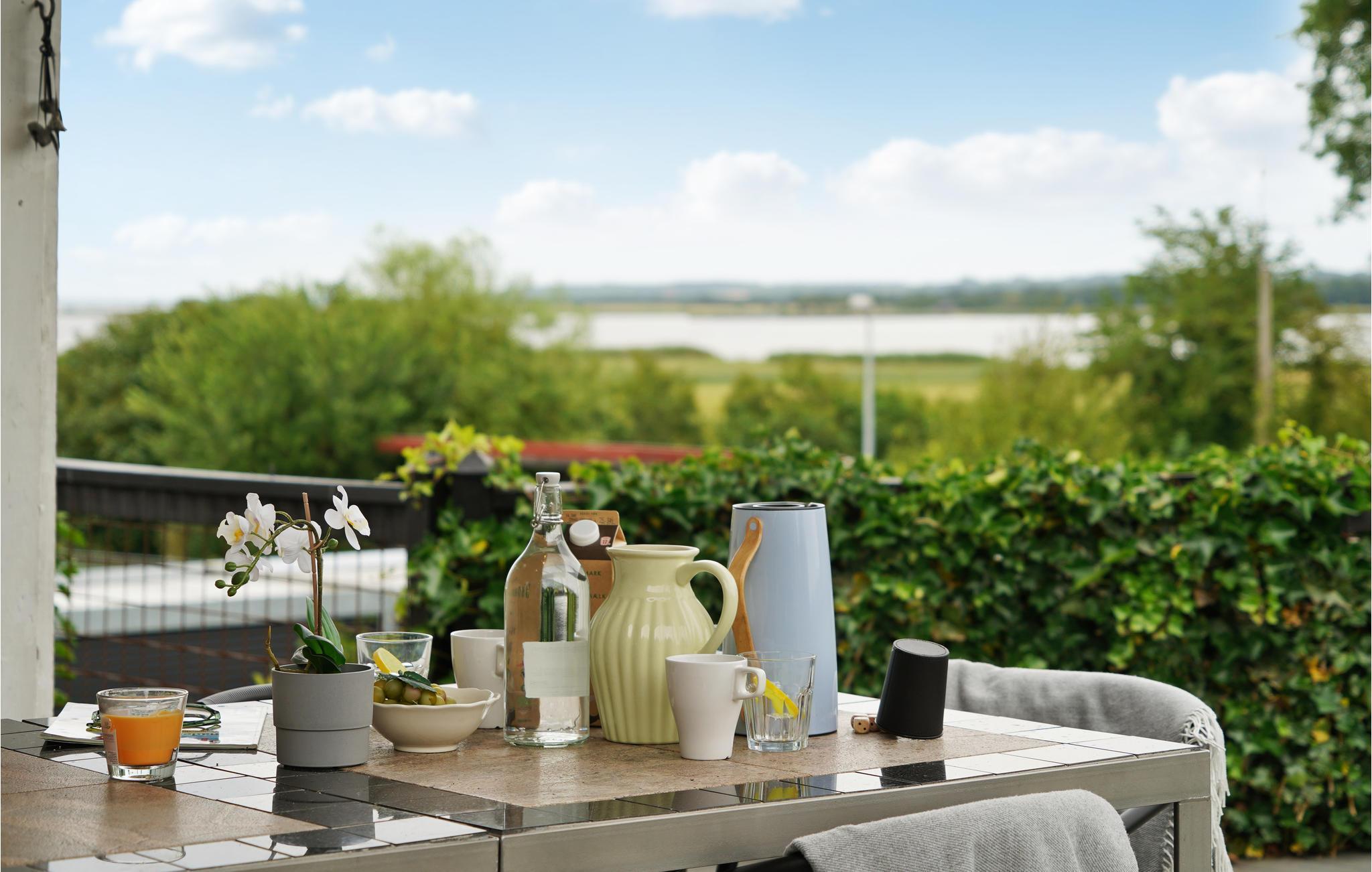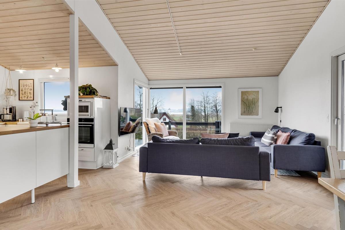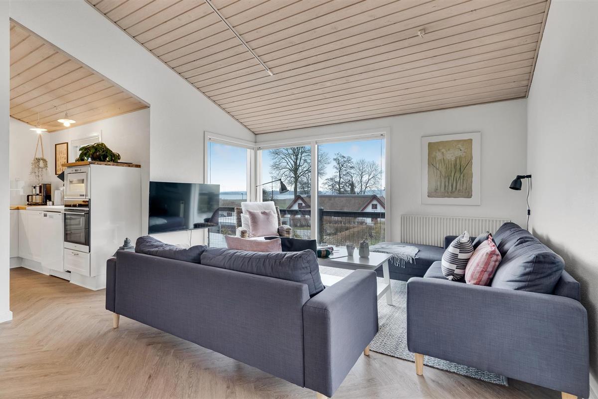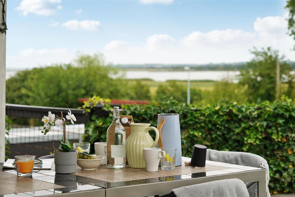 Geniet van een charmant houten vakantiehuis met prachtig uitzicht op Randers Fjord en een groot deels overdekt terras.