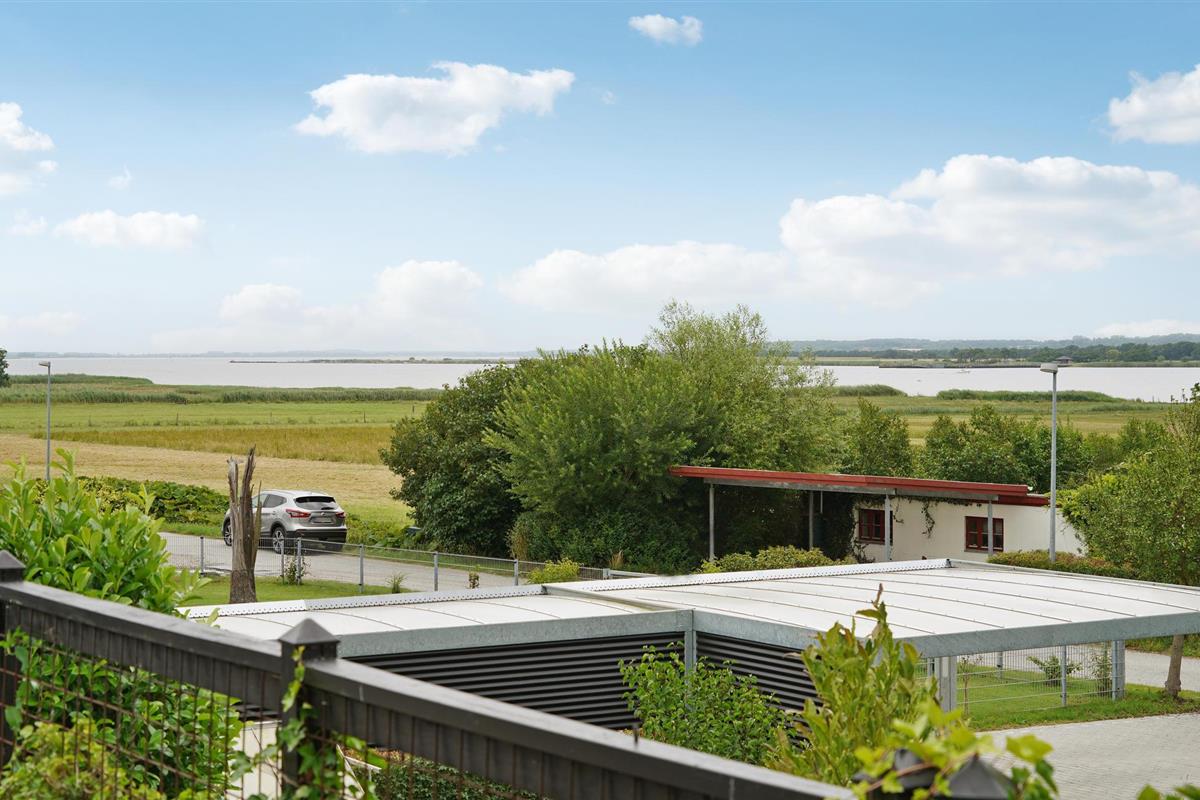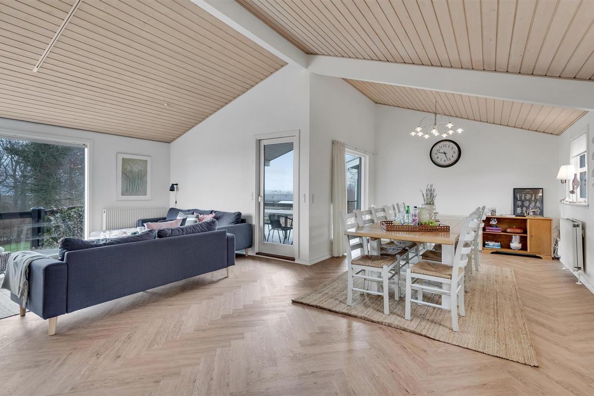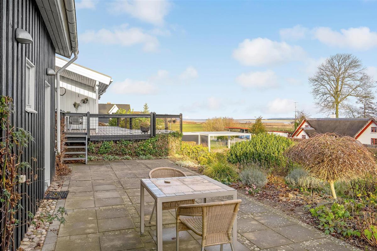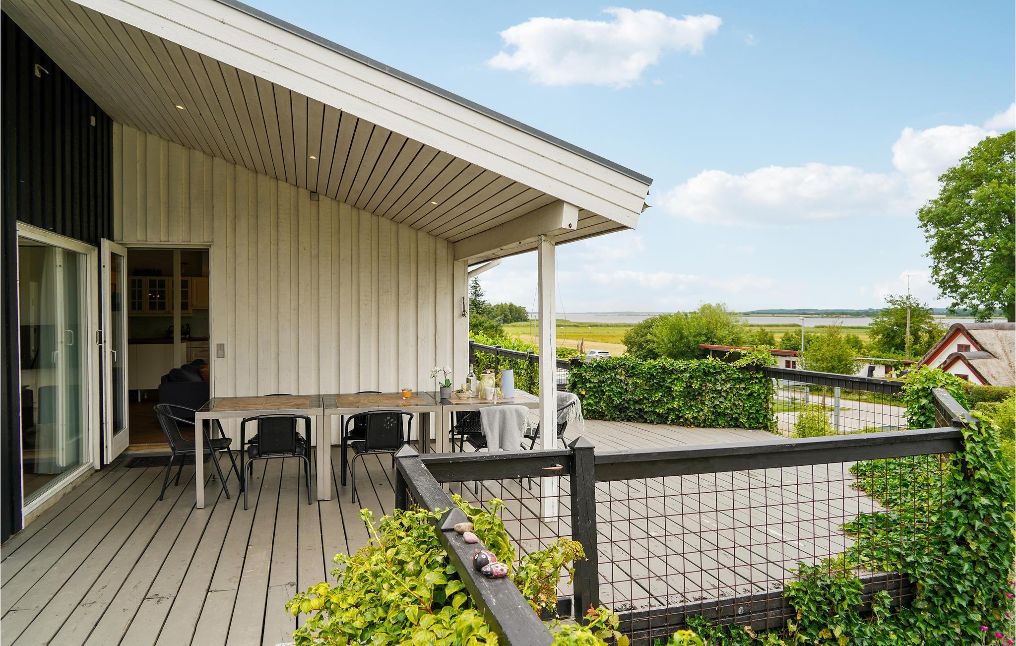 Geniet van een charmant houten vakantiehuis met prachtig uitzicht op Randers Fjord en een groot deels overdekt terras.