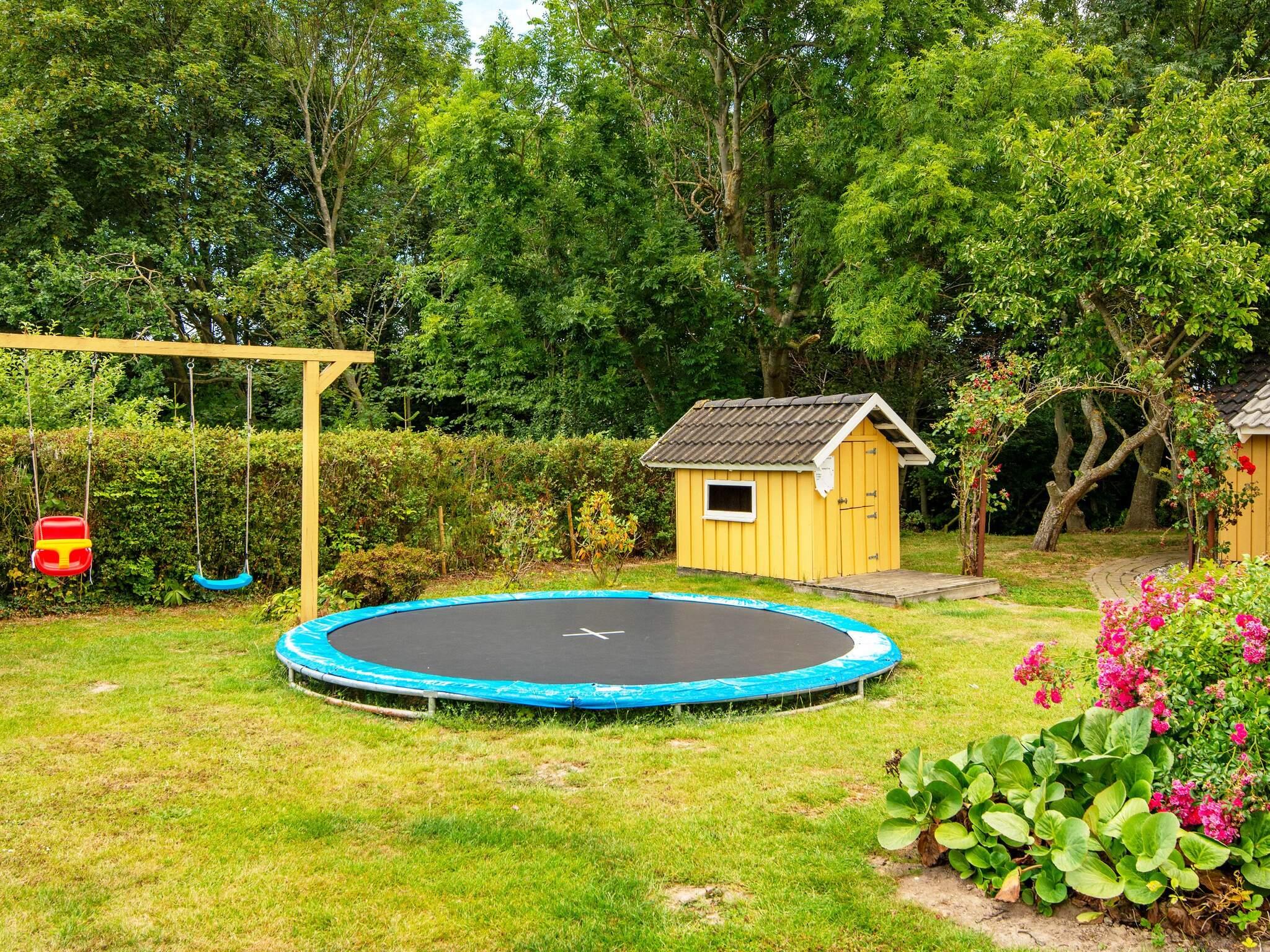 Im Außenbereich erwartet Sie eine 40 m² große, offene Terrassenfläche. Weiterhin gibt es einen 12 m² großen, überdachten Bereich sowie mehrere bequeme Gartenmöbel und Sitzgelegenheiten und drei Sonnenliegen. Für Kinder stehen Schaukel, Sandkasten, Spielehäuschen und Gartentrampolin (Nutzung nur auf eigenes Risiko!) bereit.