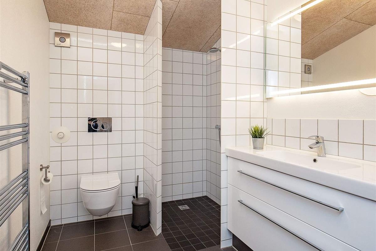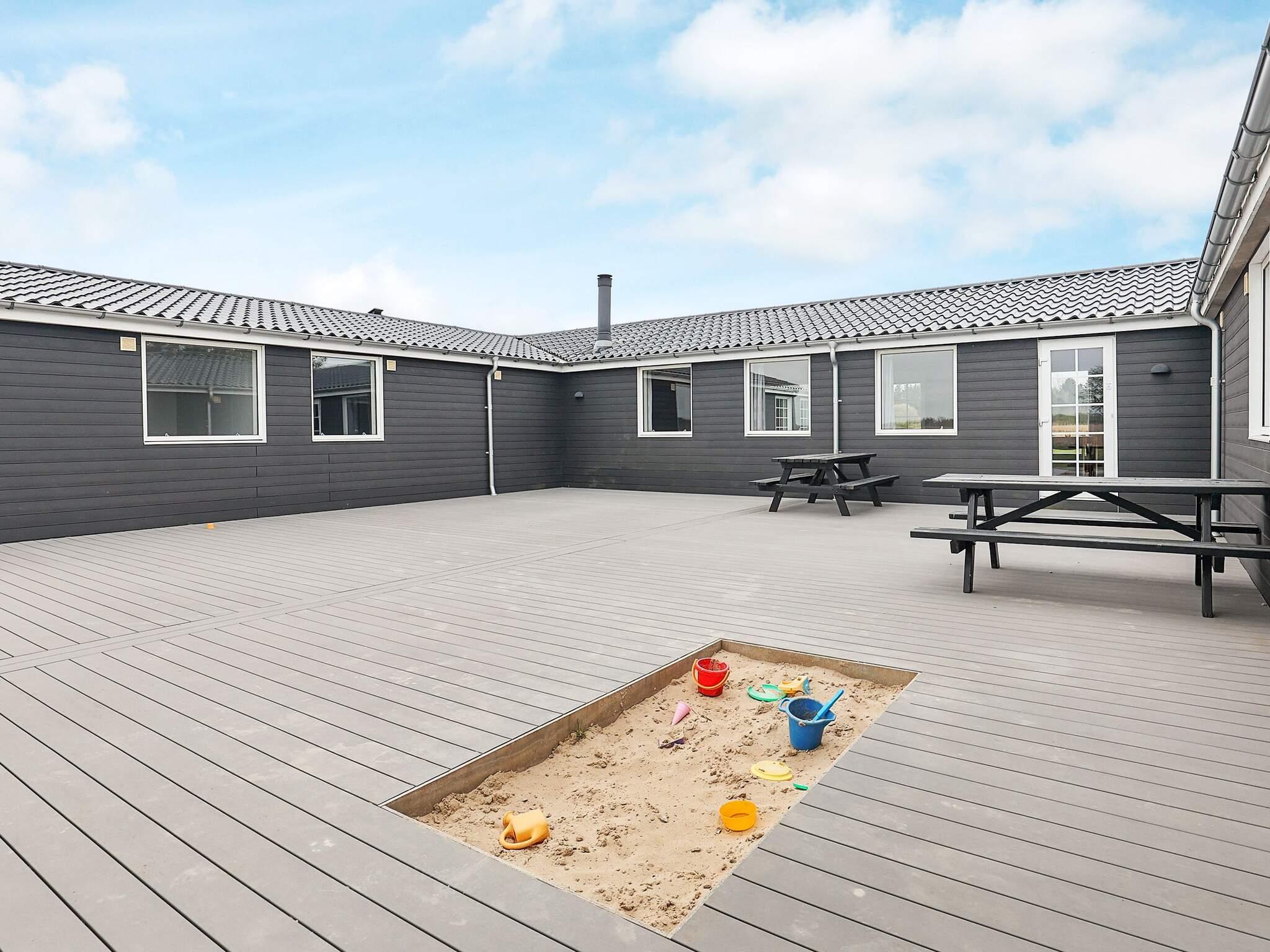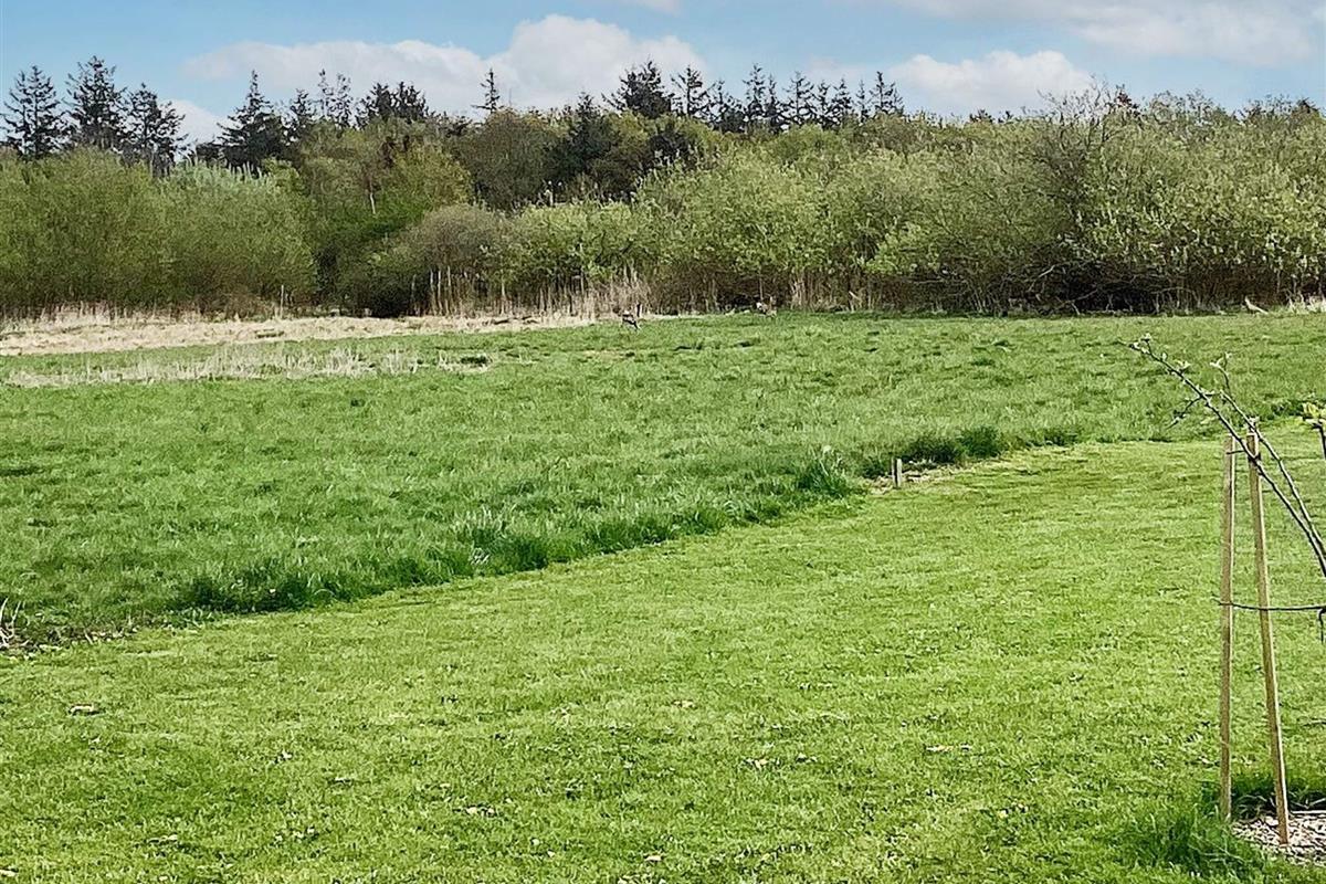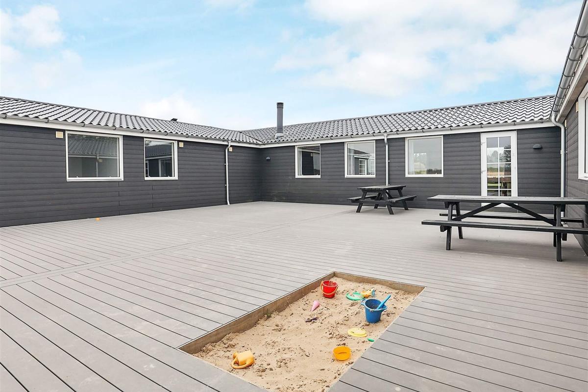 Den Mittelpunkt des Hauses bildet der offene Küchen-/Wohnbereich mit Essplatz und Zugang zu den beiden großen Terrassenflächen mit jeweils Sonne am Morgen oder am Nachmittag. Von hier aus schweift der Blick zu nahen See und über das landschaftlich reizvolle Feuchtbiotop Sillerslev Ørding. In eine Terrassenfläche wurde ein kleiner Sandkasten für die Jüngsten eingelassen.