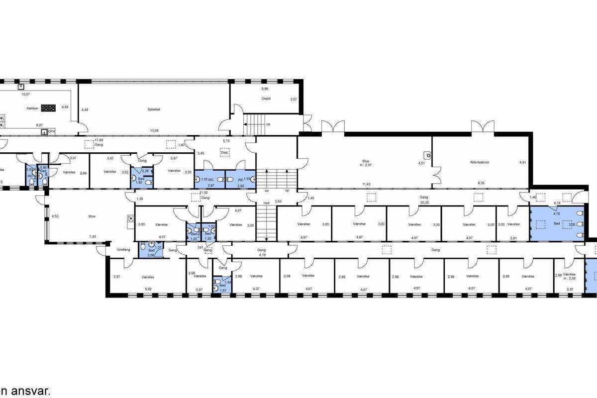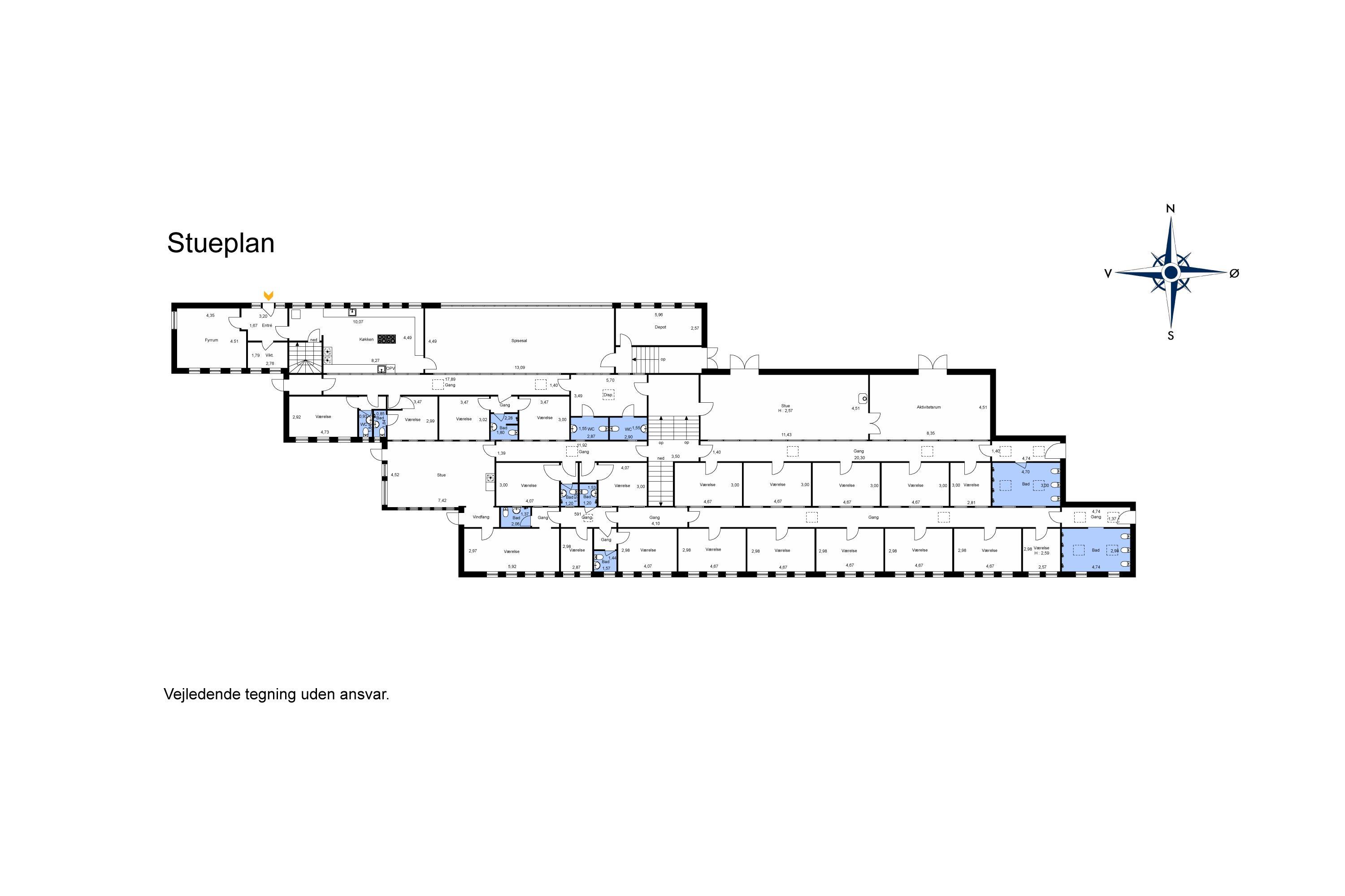 Living room for approx. 30 m2. 2 rooms with 3/4 box mattres with own bath and toilet. 4 room with bunks and 1 single room with common bath and toilet.