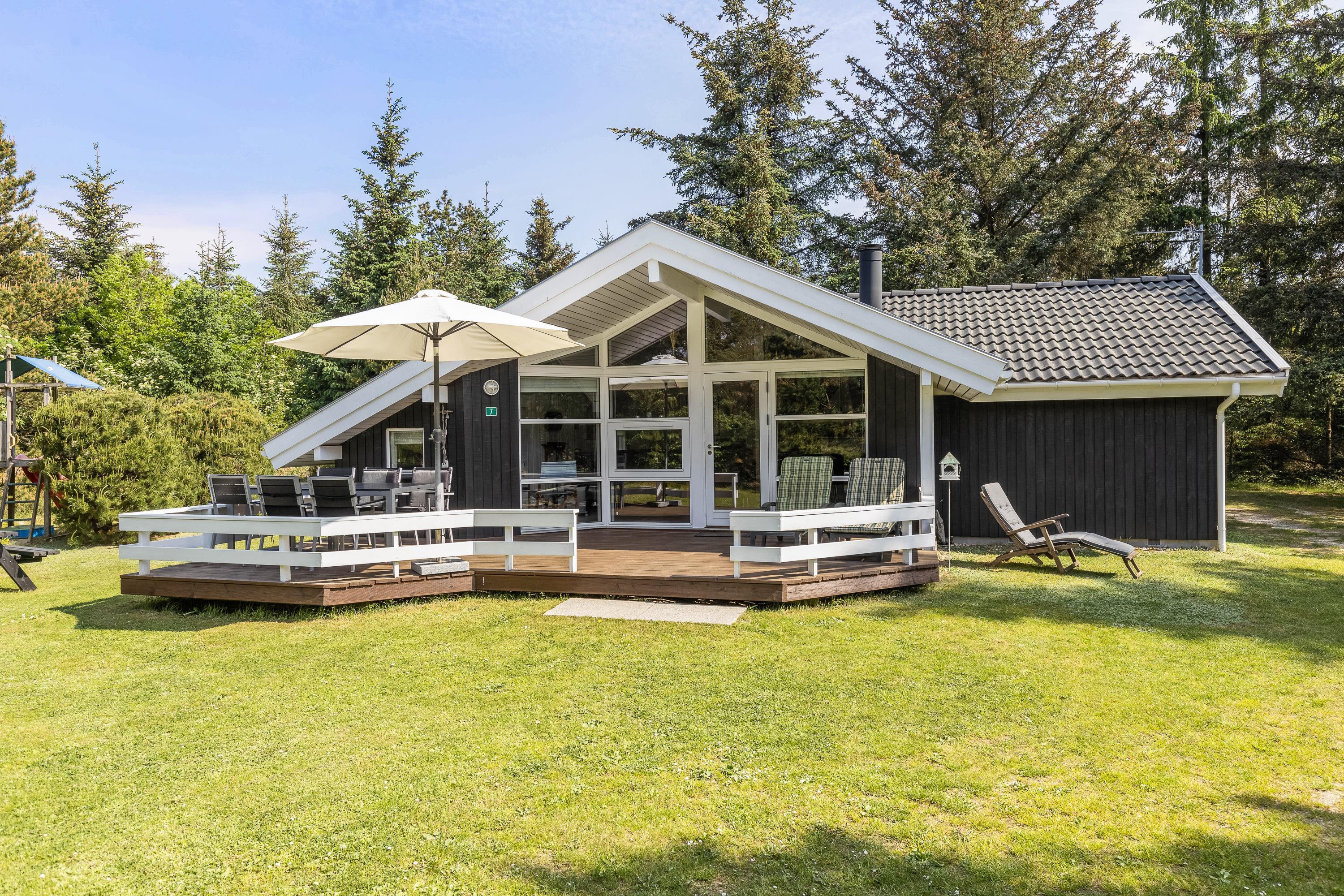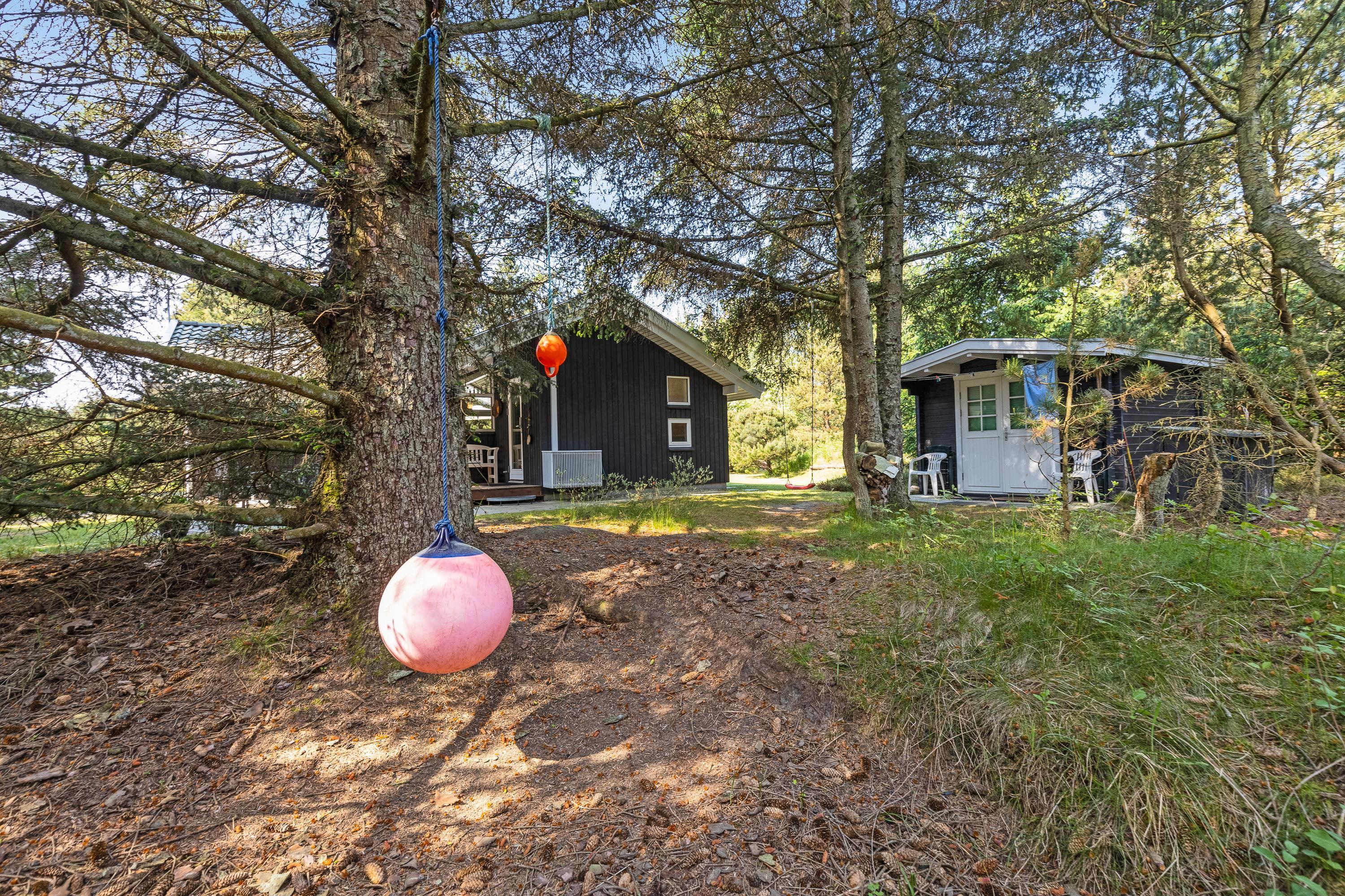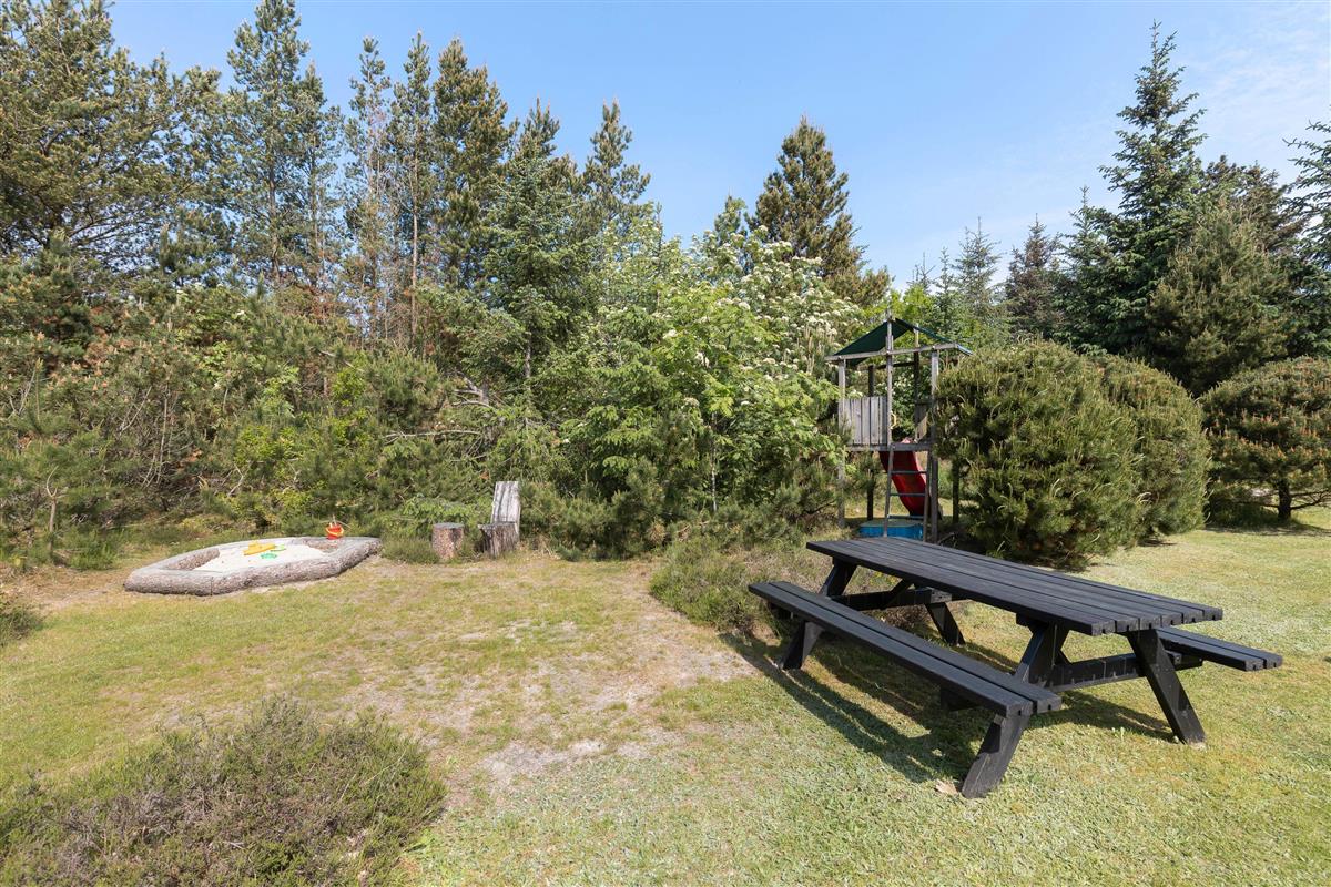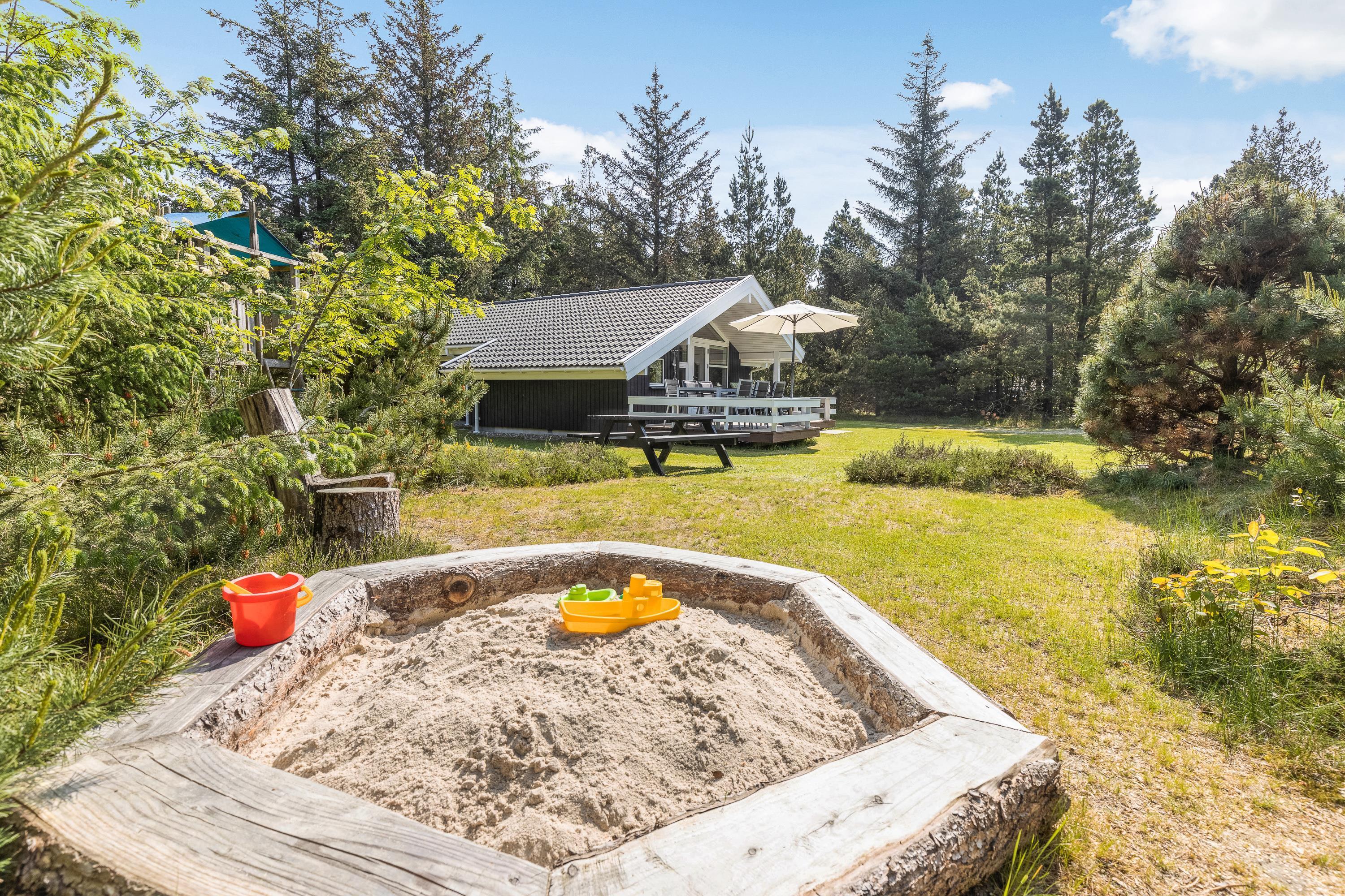 The natural plot is surrounded by pine trees, creating a private atmosphere. The fenced terrace is furnished with attractive garden furniture and sun loungers. Here you can enjoy the fresh air while listening to birdsong and preparing barbecue meals. Children will love the play tower with slide and the large sandpit. There's plenty of space for running around and playing.