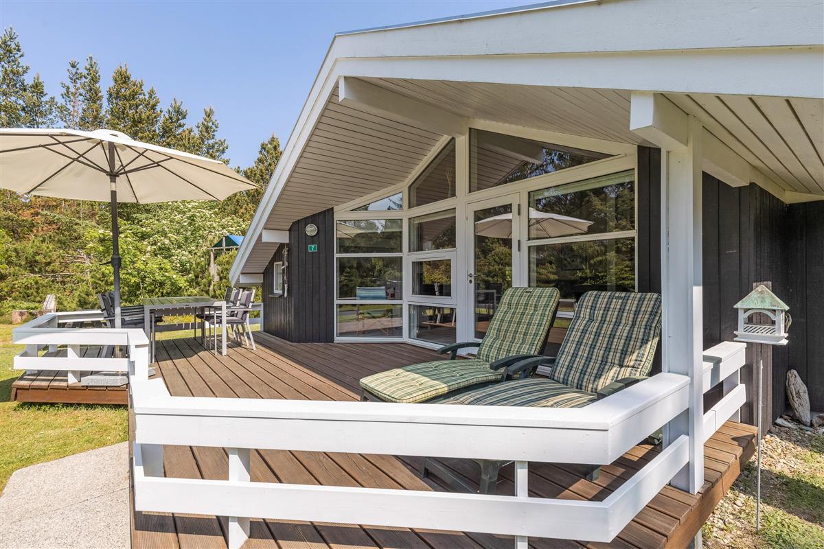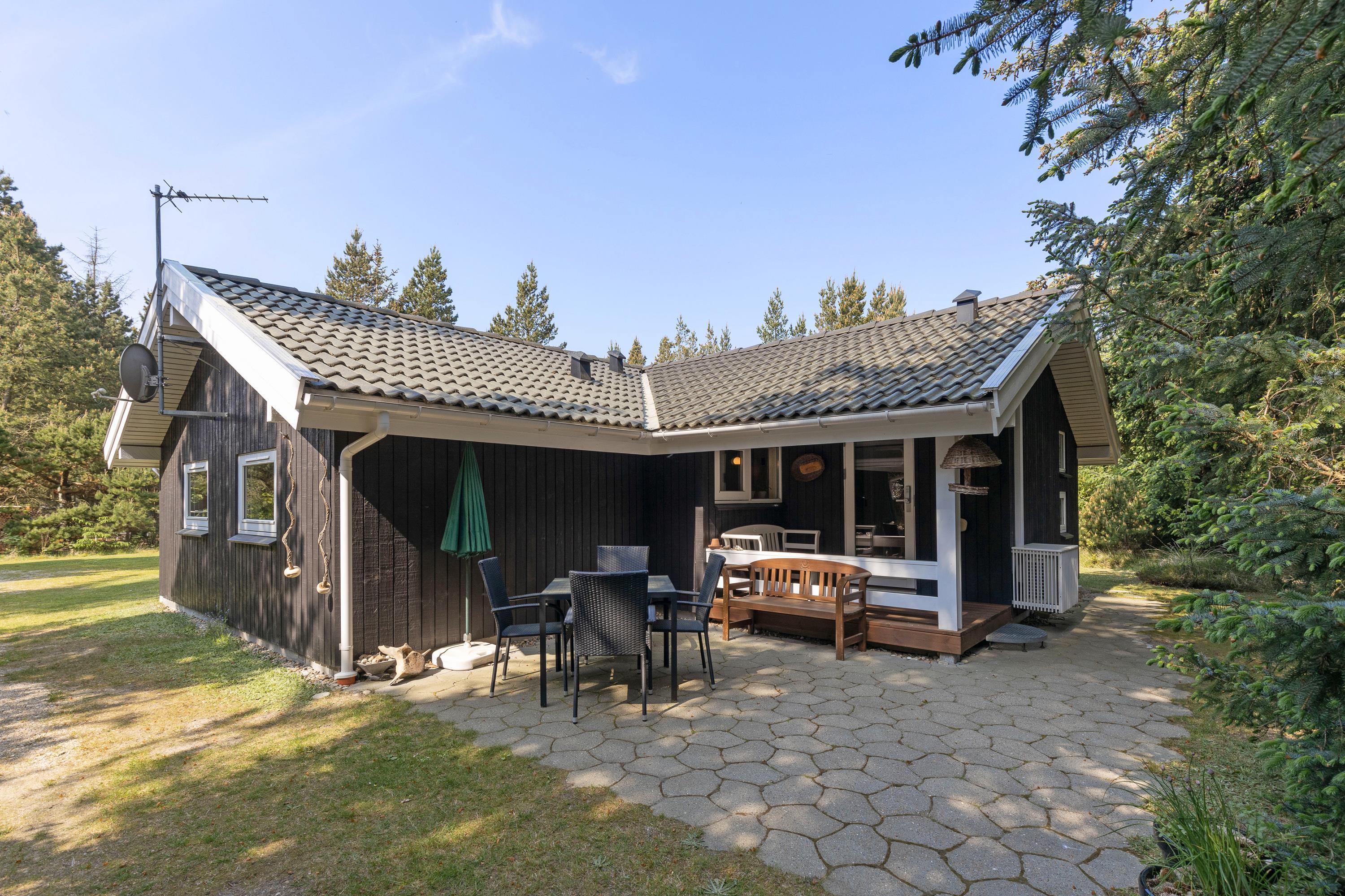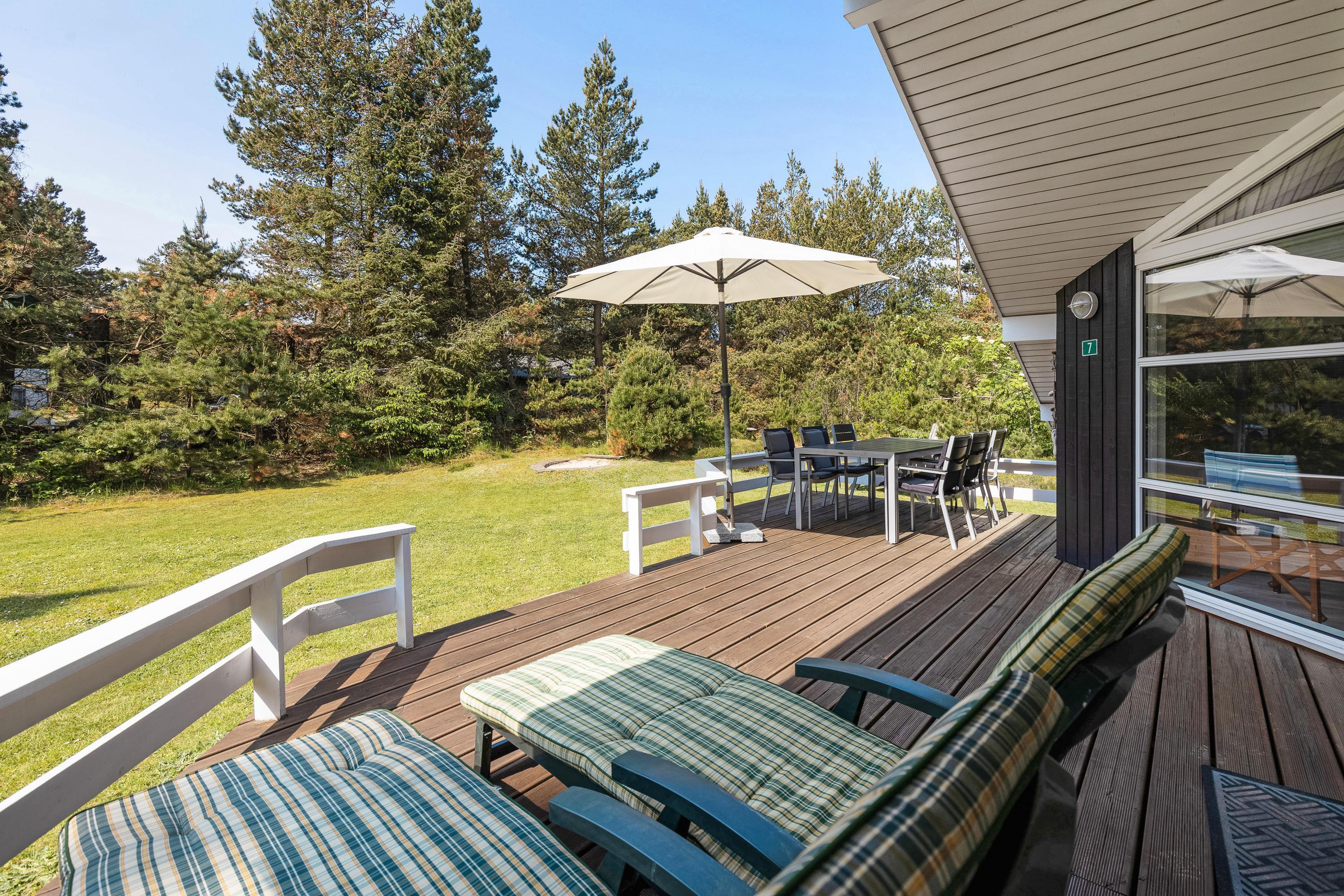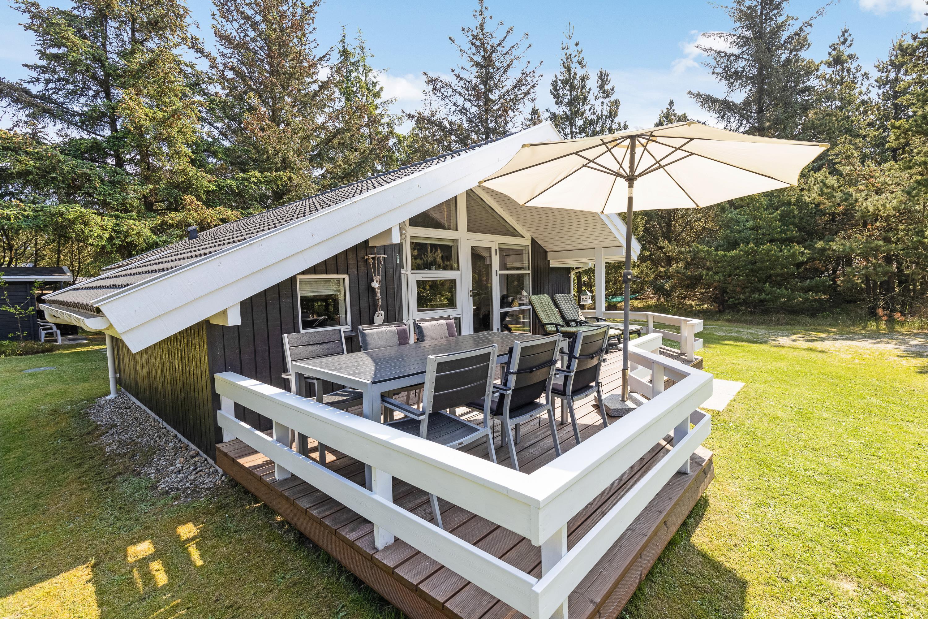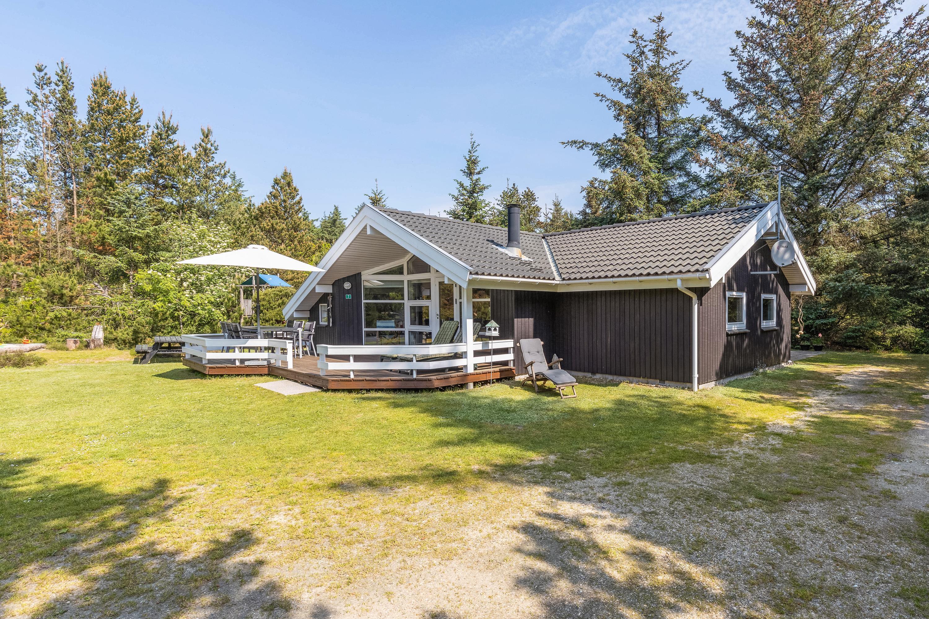 The natural plot is surrounded by pine trees, creating a private atmosphere. The fenced terrace is furnished with attractive garden furniture and sun loungers. Here you can enjoy the fresh air while listening to birdsong and preparing barbecue meals. Children will love the play tower with slide and the large sandpit. There's plenty of space for running around and playing.