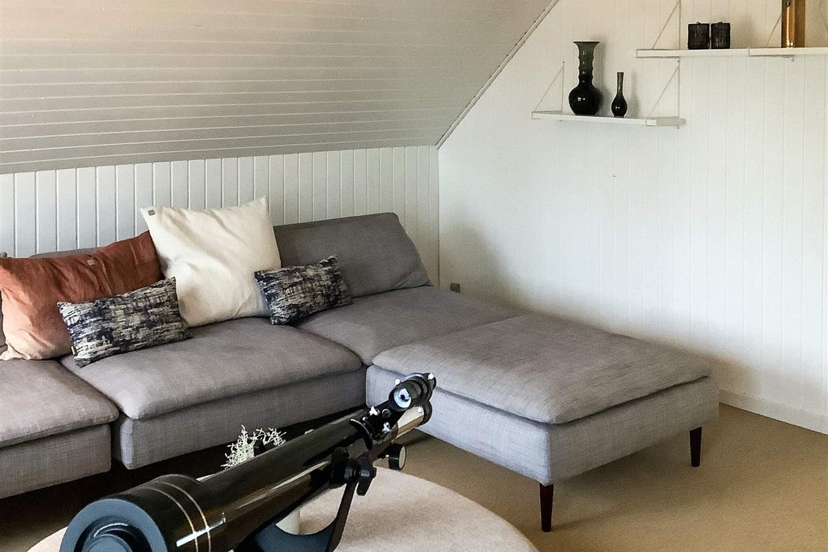 Im Erdgeschoss gibt es ein großes Badezimmer mit Dusche und Fußbodenheizung sowie eine Waschmaschine und einen Wäschetrockner. Darüber hinaus ein Schlafzimmer mit Doppelbett und Wandschrank. Große, helle Wohnküche mit herrlicher Aussicht auf den Fjord und die Natur.