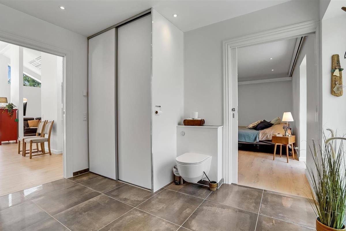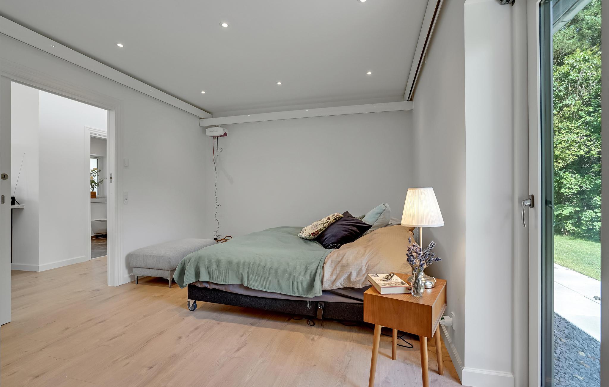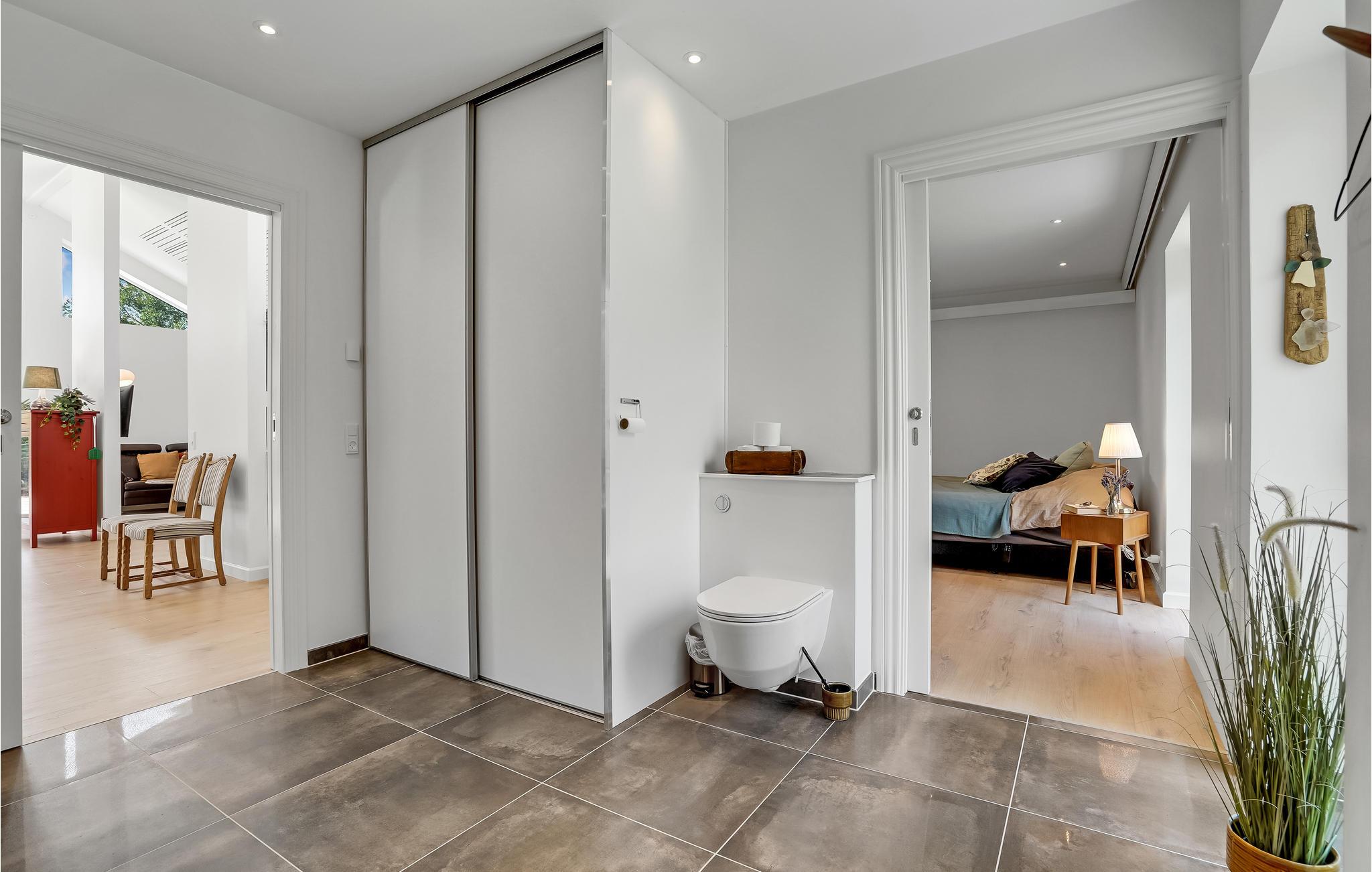 Het huis is ook bijzonder geschikt voor rolstoelgebruikers. Er zijn brede deuren, opritten naar alle buitendeuren, brede schuifdeuren binnen, een ruime badkamer en een lift in één slaapkamer waar ook een bed op wieltjes staat.