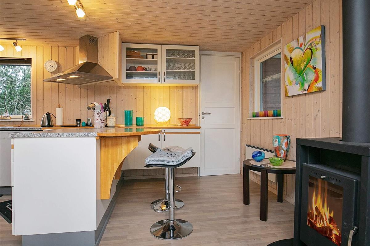 Innen erwartet Sie ein offener Küchen-/Wohnbereich für das Familienleben, inklusive Essecke sowie Holzofen für kühlere Jahreszeiten. Vom Wohnbereich aus genießt man durch die großen Fensterbereiche schönen Ausblick zur umliegenden Naturlandschaft.
