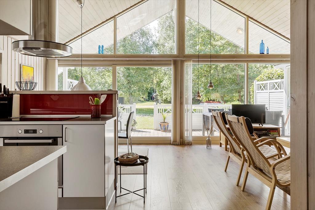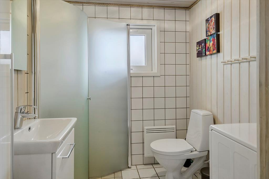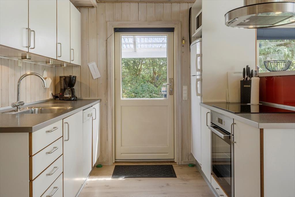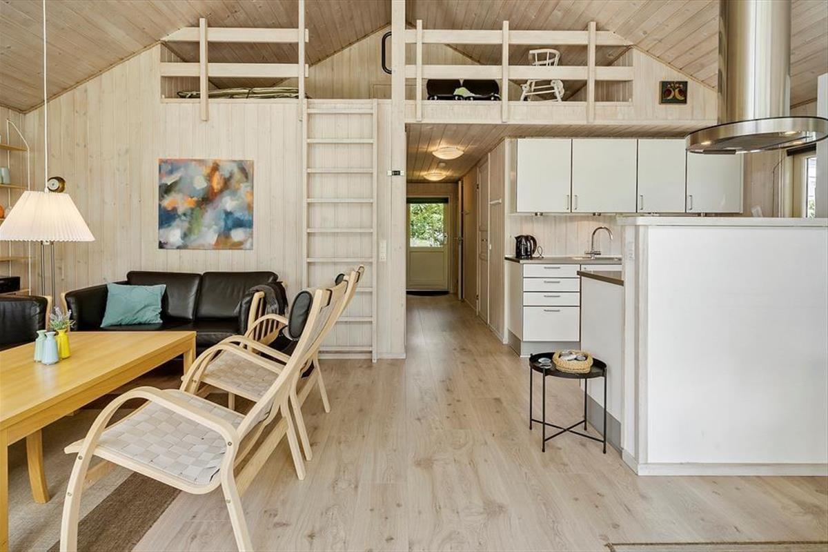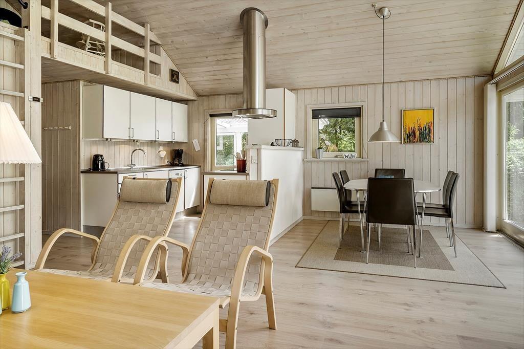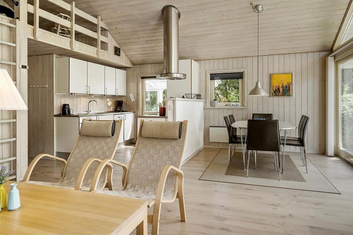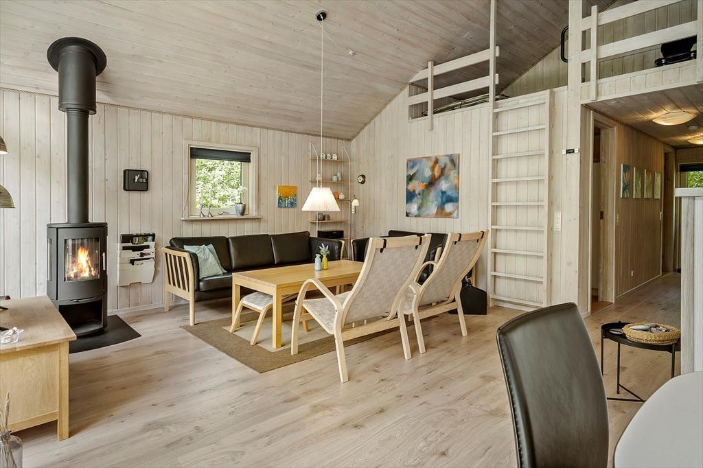 Dieses hell und gemütlich eingerichtete Ferienhaus empfängt Sie mit einer guten Möblierung und mit einem Kaminofen, der an kühlen Sommerabenden und in der kälteren Jahreszeit für ein Maximum an Ferienhausstimmung und behaglicher Wärme sorgt. Die schöne, neuere und gut ausgestattete Küche erleichtert Ihnen unter anderem mit einem Geschirrspüler und einer Mikrowelle die Zubereitung köstlicher Urlaubsmahlzeiten. Die Küche fügt sich offen und harmonisch in den gemütlichen Wohnraum ein, der außerdem auch den Essplatz beinhaltet. Das ansprechende Badezimmer verfügt über eine Dusche und eine Waschmaschine. Vom Wohnraum genießen Sie Zugang zu einem offenen Schlafboden, auf den sich sicherlich Ihre Kinder gerne zurückziehen werden. Auch die attraktive Terrasse ist vom Wohnraum aus zugänglich. Ihnen stehen drei gute Schlafzimmer zur Verfügung. Zwei dieser Schlafzimmer sind mit je einem Doppelbett eingerichtet. Im Dritten steht für Sie ein Etagenbett bereit. Alle Schlafzimmer verfügen über Schrankfläche.