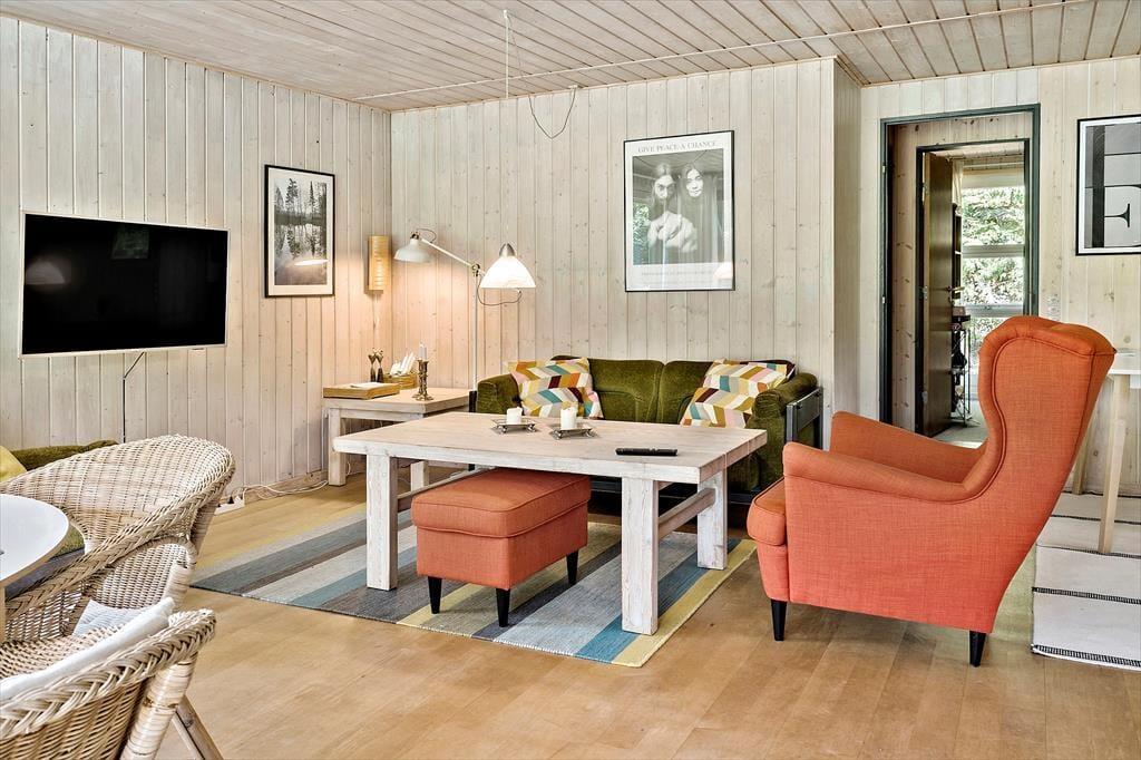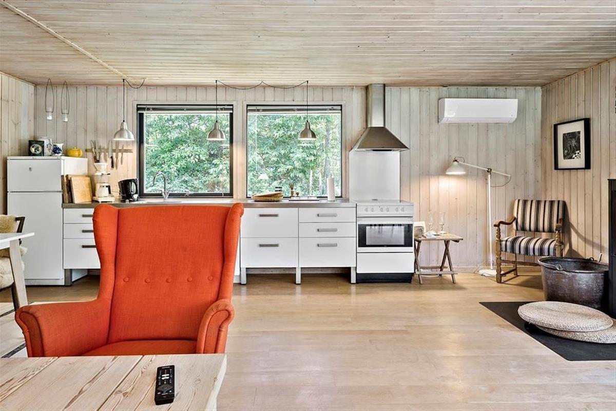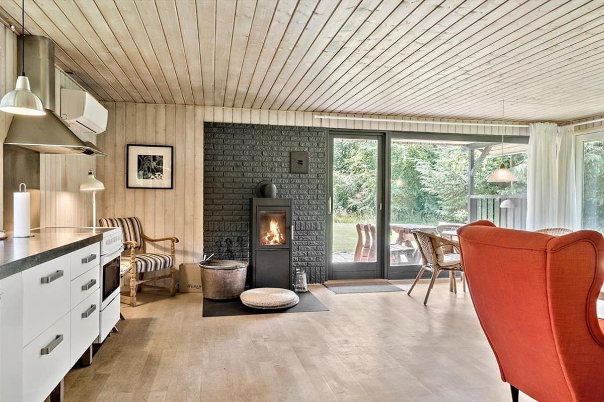 Unmittelbar nach dem ersten Betreten deines Ferienhauses spürst du, wie die Alltagshektik einer entspannten Urlaubsstimmung weicht. Die Holzwände verleihen dem Mietobjekt eine warme Atmosphäre. Große Fensterpartien sorgen den gesamten Tag hindurch für einen schönen Tageslichteinfall. Die Küche fügt sich offen in den Wohnraum ein. Dadurch genießt du selbst während der Zubereitung eurer Mahlzeiten die Nähe und Gesellschaft deiner Lieben, die am Esstisch beisammensitzen und spielen oder es sich in der Polstersitzgruppe gemütlich gemacht haben. An kühlen Abenden verwöhnt euch der im Wohnraum platzierte Kaminofen mit behaglicher Wärme und einem Maximum an klassisch dänischer Ferienhausgemütlichkeit.