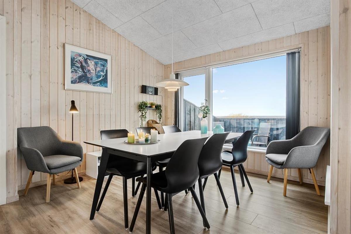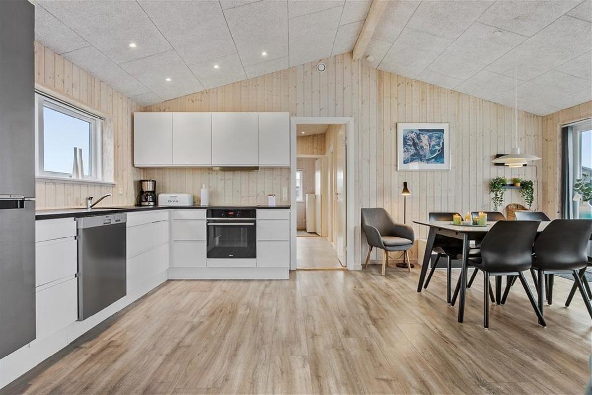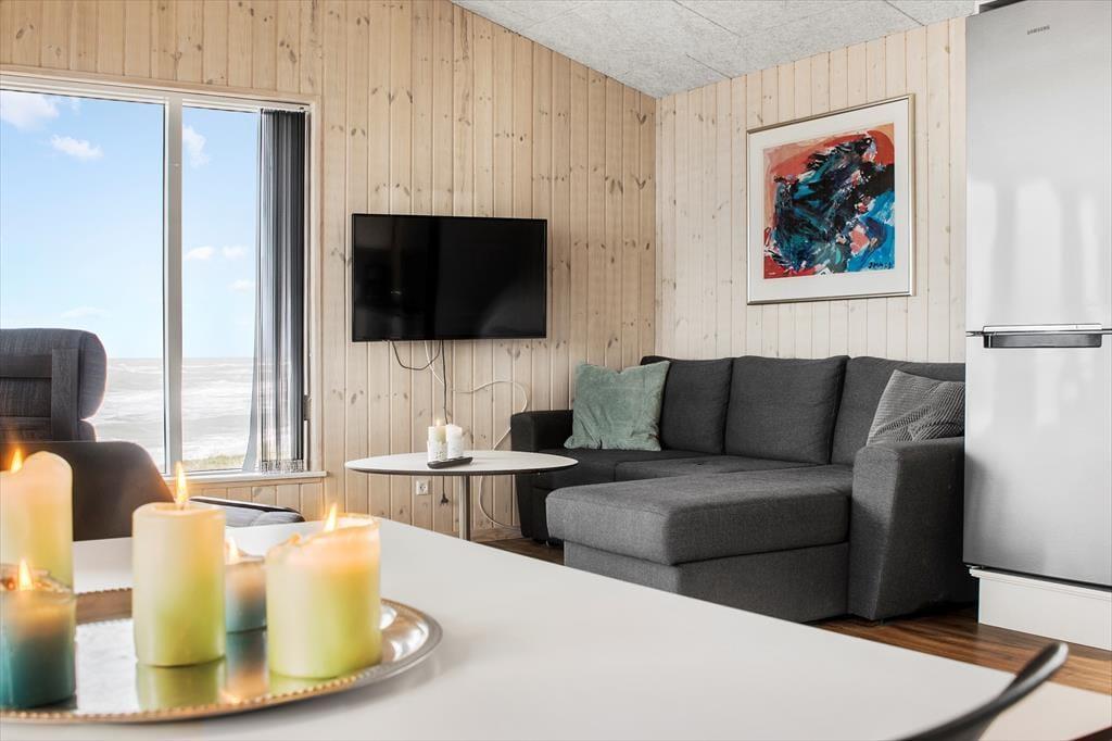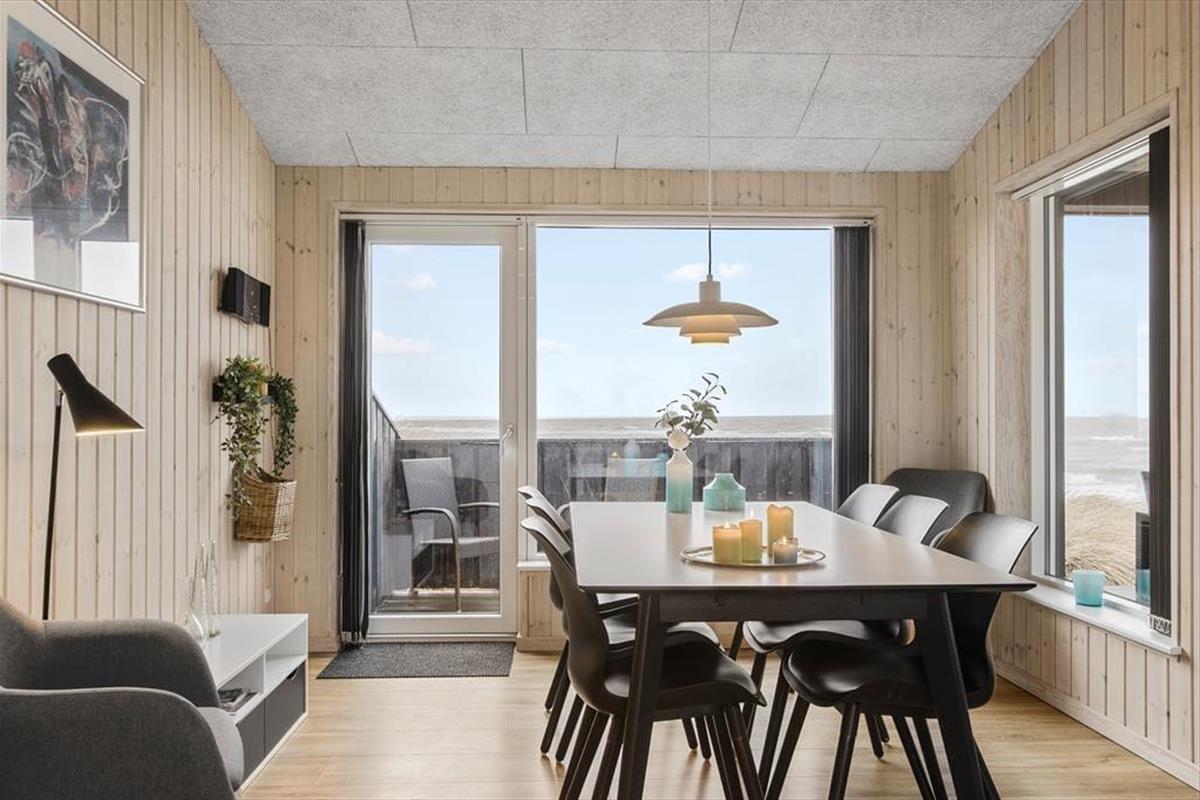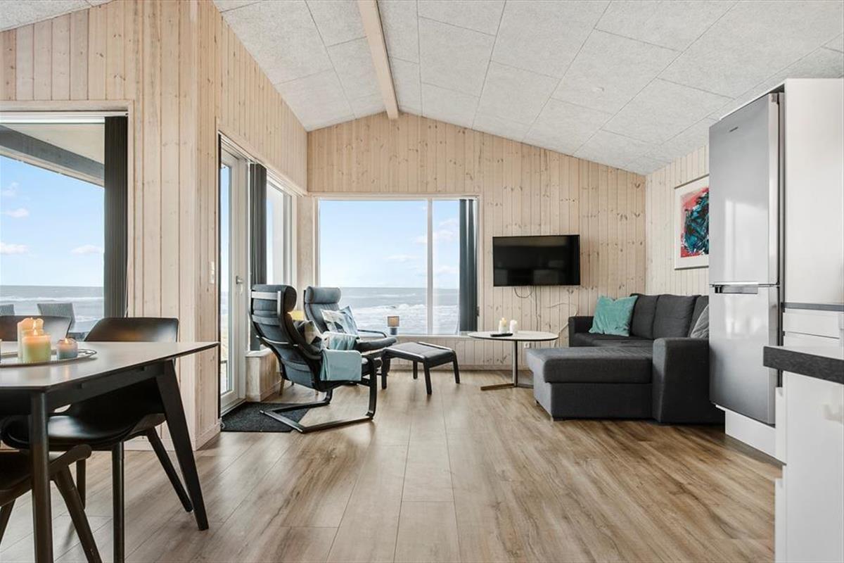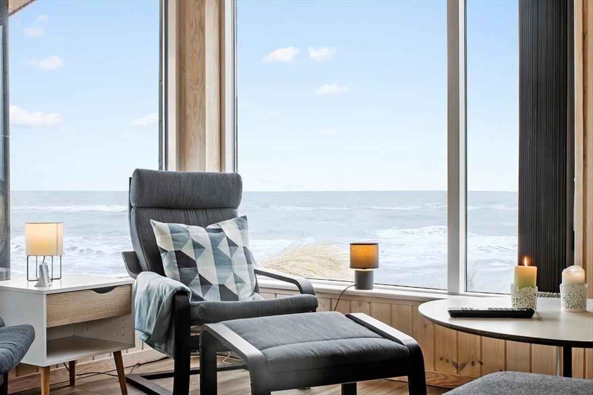 Innen erwartet dich ein helles und einladendes Zuhause mit modernen Möbeln, die perfekt zum skandinavischen Feriengefühl passen. Große Fensterfronten holen das Meer direkt ins Wohnzimmer, und es fühlt sich fast so an, als säßest du in der ersten Reihe vor dem Theater der Natur. Der offene Wohnbereich verbindet Küche, Essplatz und Wohnzimmer, sodass ihr stets beisammen seid – auch beim Kochen. Einen Kaminofen gibt es nicht, dafür aber eine entspannte, stilvolle Atmosphäre, in der Gemütlichkeit und Ausblick Hand in Hand gehen. Es gibt reichlich Platz für Gespräche bei einer Tasse Kaffee, Brettspiele mit den Kindern oder einfach Ruhe und Entspannung mit einem guten Buch auf dem Sofa. Und wenn der Abend anbricht, kannst du vom Wohnbereich aus immer noch das letzte Licht über dem Horizont erahnen – ein Anblick, von dem man sich nur schwer losreißen kann.