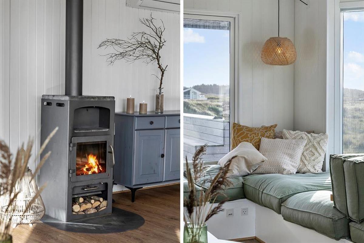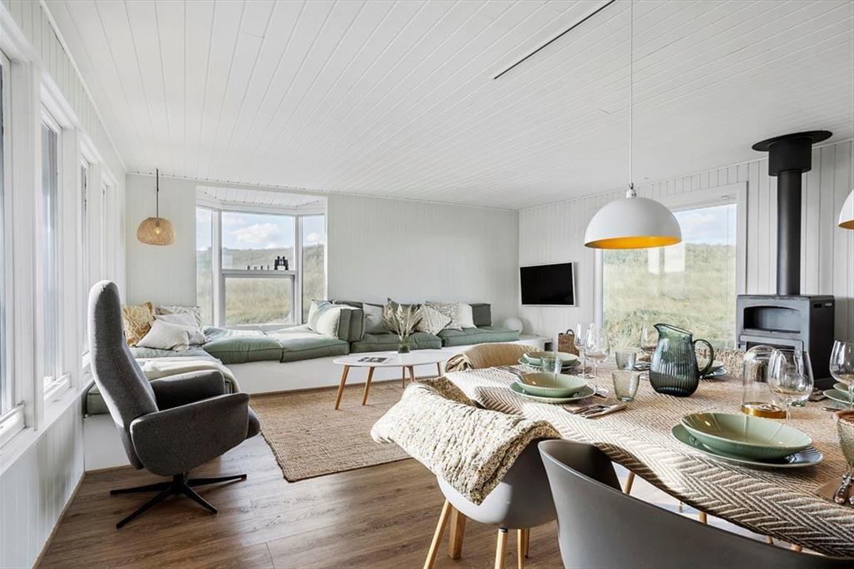Nach der gelungenen Renovierung im Jahr 2022 präsentiert sich das Hausinnere hell und einladend. Die Wände und Decken wurden weiß gestrichen. Die großen Wohnzimmerfenster gewähren einen tollen Tageslichteinfall und offenbaren einen schönen Ausblick auf die mit Strandhafer bewachsenen Dünen. Sie können sich in aller Ruhe beispielsweise in der gemütlichen Sofaecke niederlassen, die sich direkt am verglasten Vorbau gen Westen befindet. Alternativ entspannen Sie sich in der Nähe des Kaminofens oder vor dem Flachbild-TV. Der Wohnraum ist offen mit der großen, gut ausgestatteten Küche verbunden. Der Rest der Wohnfläche ist drei guten Schlafräumen und einem geräumigen Badezimmer mit einer Badewanne und einem Wäscheturm gewidmet.