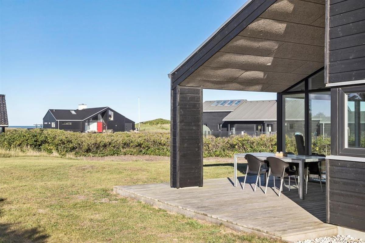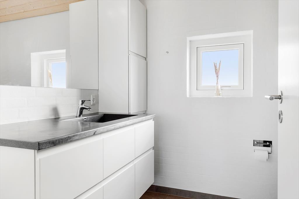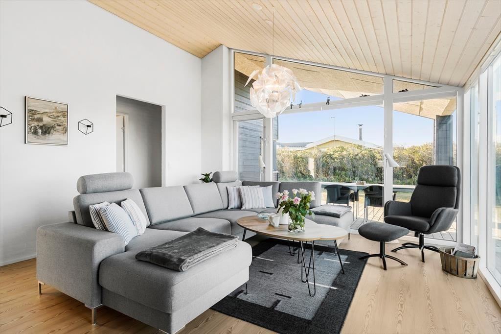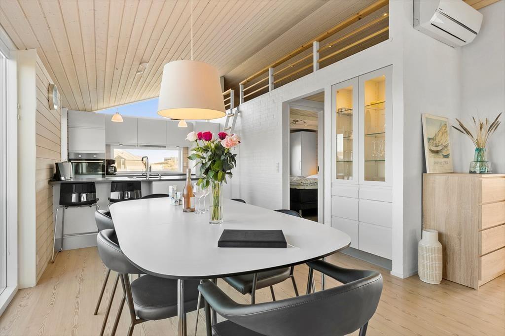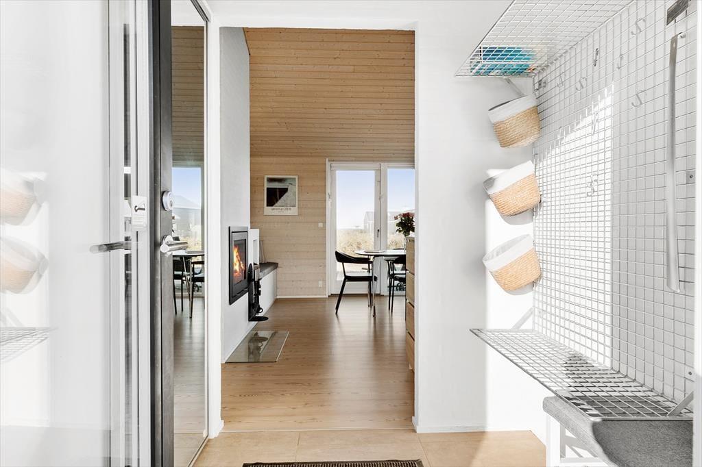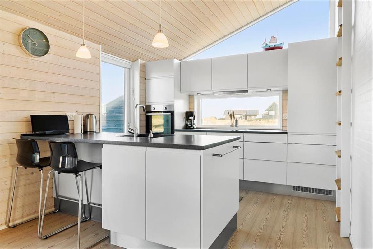 Bei diesem Urlaubsdomizil, das mit seiner schlichten und zeitlosen Architektur besticht, stimmt einfach alles. Im Innern des Hauses werden Sie unmittelbar nach dem ersten Betreten vom beeindruckenden Tageslichteinfall durch die großen Fensterpartien begeistert sein, der das geschmackvolle Interieur wunderbar in Szene setzt. Die Einrichtung wurde vom Hauseigentümer wohl durchdacht gewählt und bietet Ihnen beste Bedingungen für das gemütliche Beisammensein nach einem langen, erlebnisreichen Urlaubstag. Der Küchen- und Essbereich bildet eine offene und überaus harmonische Einheit mit dem attraktiven Wohnraum. In der Küche und im Wohnraum werden Sie darüber hinaus mit einem ansprechenden Blick auf das Meer verwöhnt. Der gemauerte, doppelseitige Kaminofen sorgt mit seinem romantischen Knistern und der heimeligen Wärme an kühlen Abenden für ein Maximum an echter dänischer Ferienhausgemütlichkeit. In der gut ausgestatteten Küche befindet sich ein Arbeitstresen mit Sitzgelegenheit, an dem Sie in Gesellschaft ein Glas Wein genießen können, während Ihr Abendessen auf dem Herd köchelt. Zur Wohnfläche zählen des weiteren drei komfortable Schlafräume und zwei Badezimmer mit je einer Dusche.