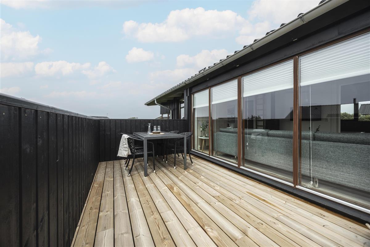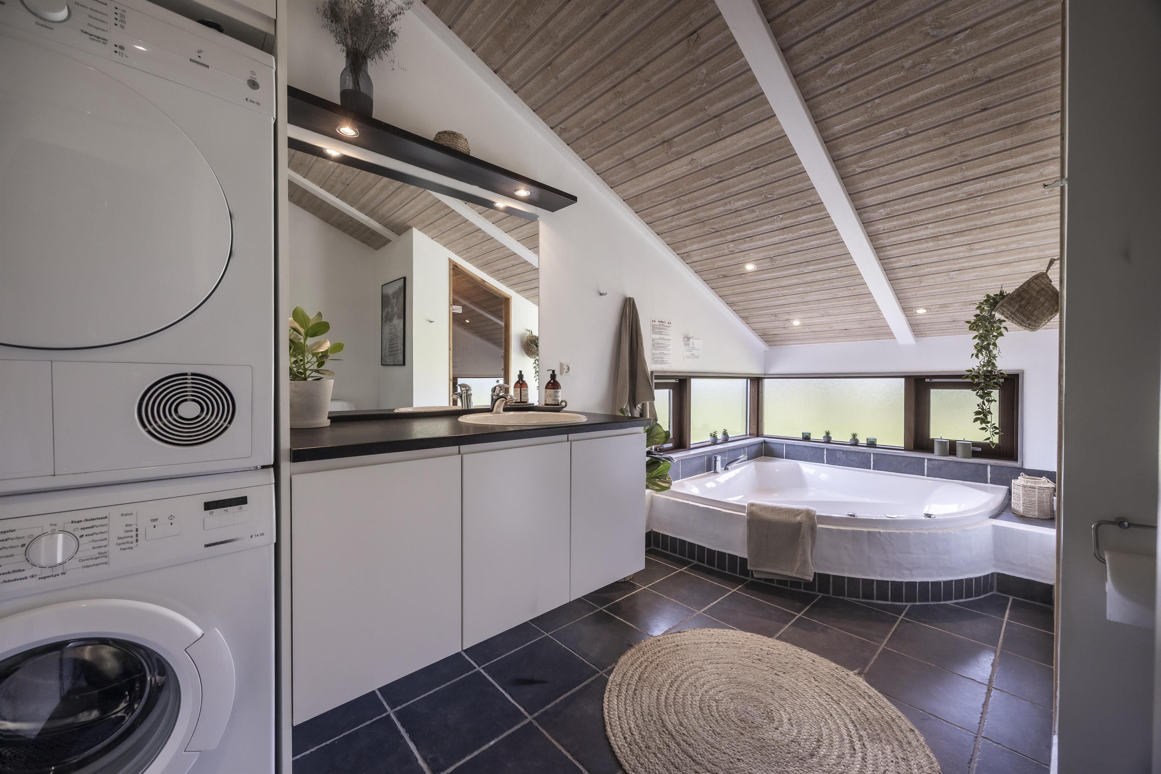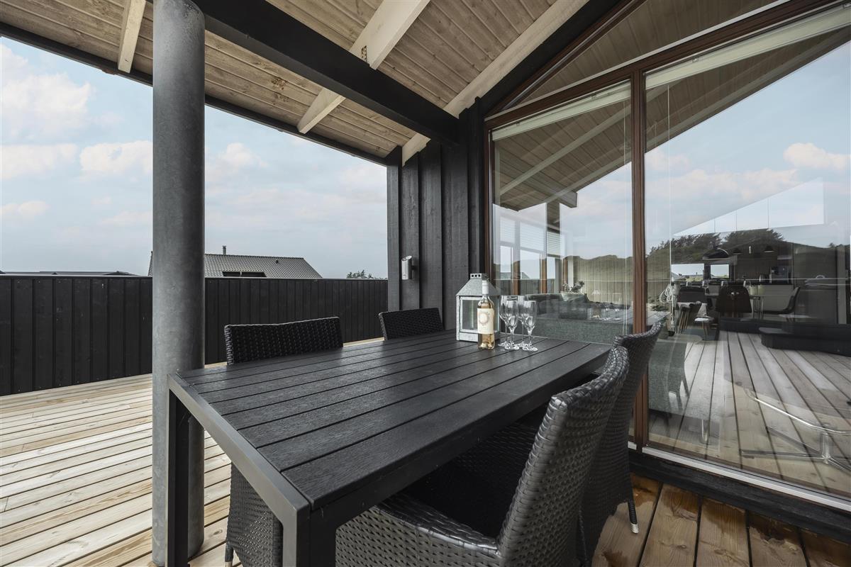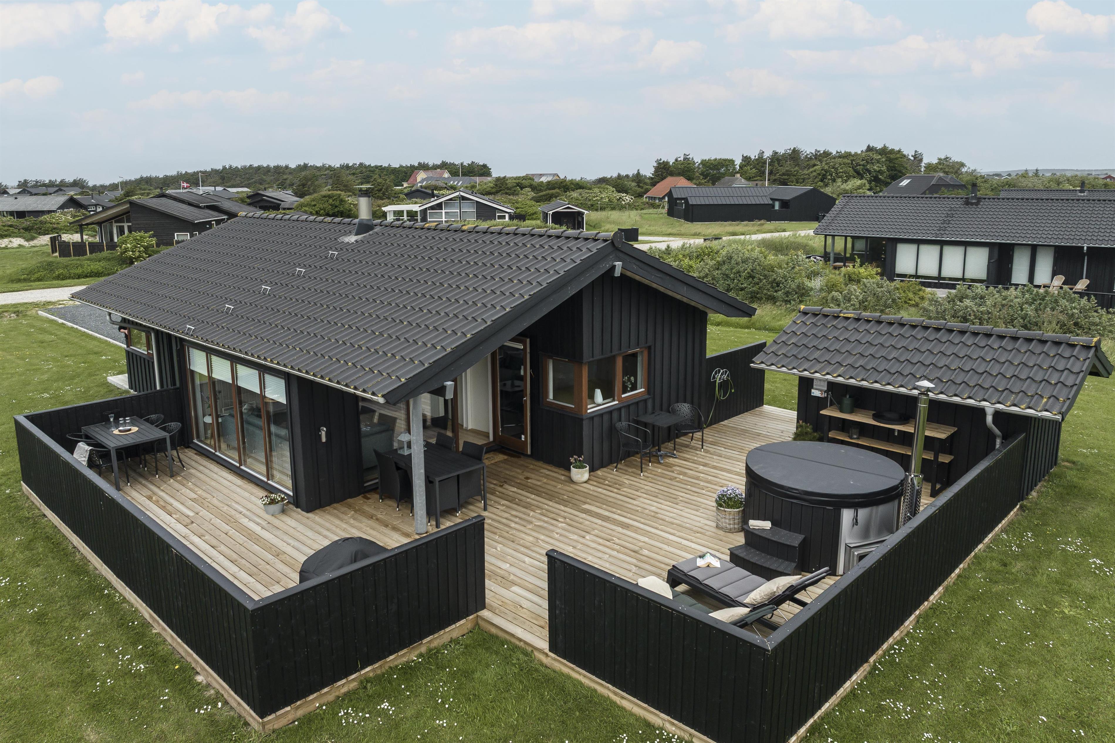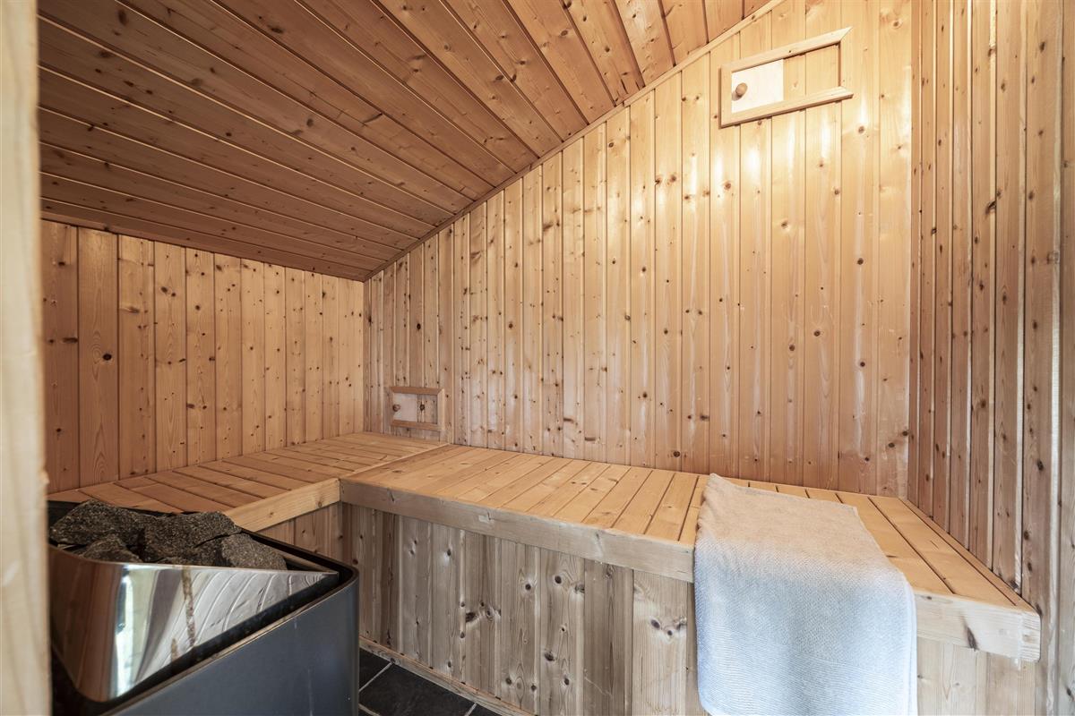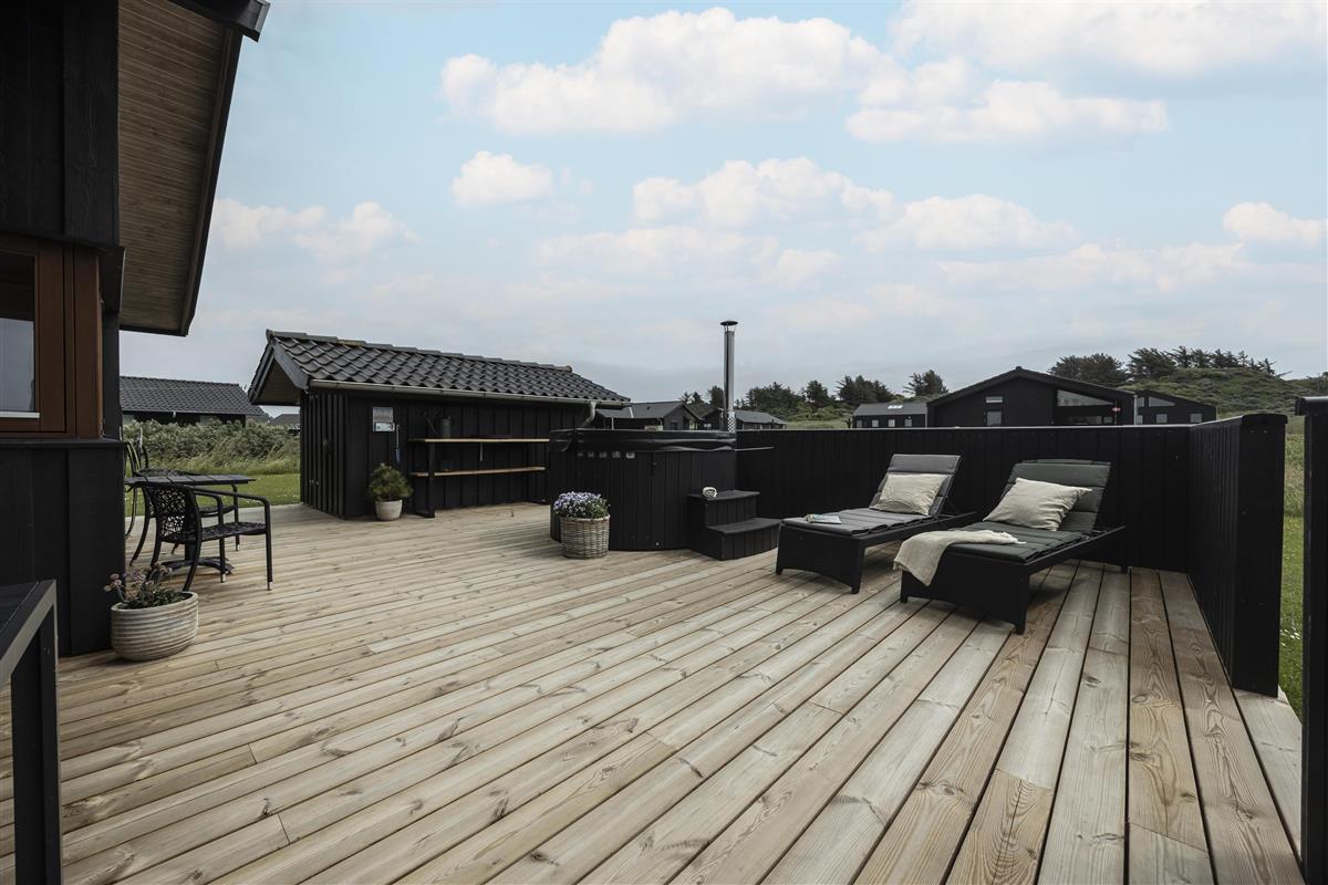 Outside, you'll find several inviting terraces where you can enjoy the sun from morning to evening. The covered terrace allows you to sit outside even when the evening dew settles – and with a delightful wood-fired hot tub, you can indulge in a warm soak under the open sky. Afterwards, relax on a sun lounger and enjoy the peace and quiet in one of the many sheltered nooks around the house.